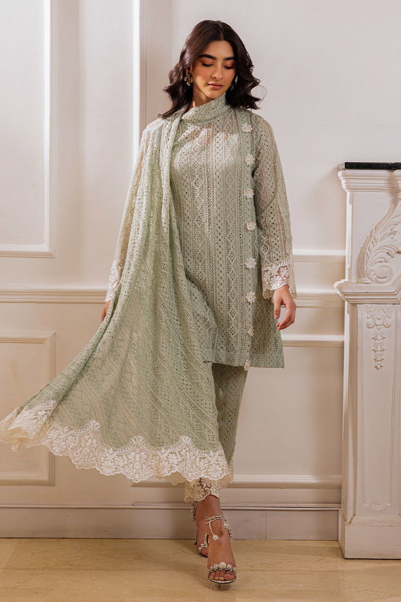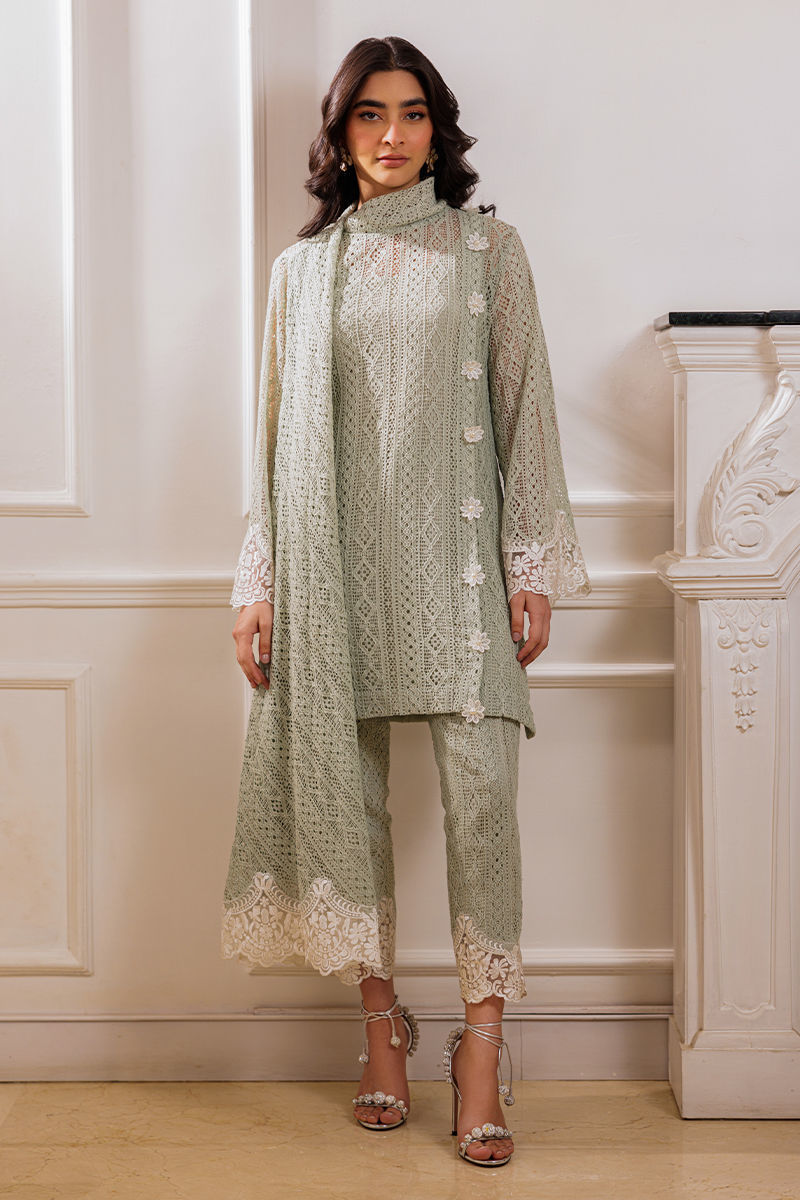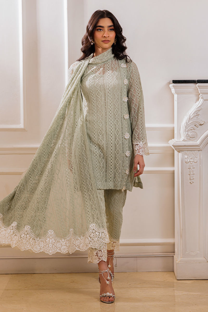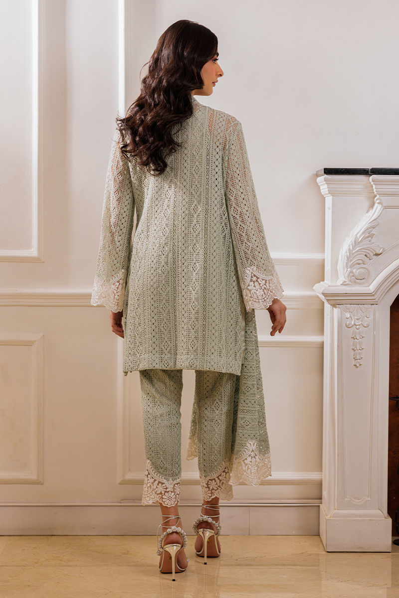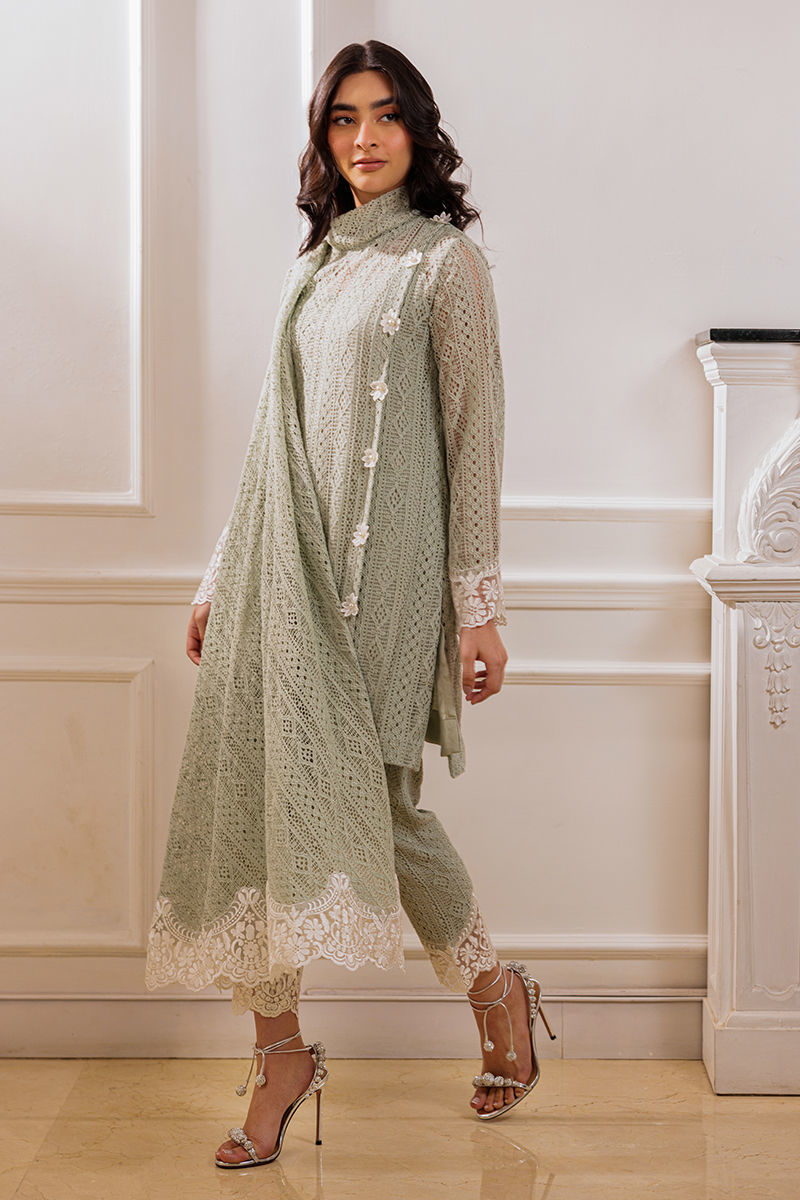 The Aaliya mint green lace shirt features intricate floral and appliqué thread work, with a delicate border along the dupatta and sleeves. The dupatta is attached to the shirt, while the slip is separate. The pants are made of lace with an attached lining, complemented by an appliqué embroidery border, creating an elegant and cohesive look.