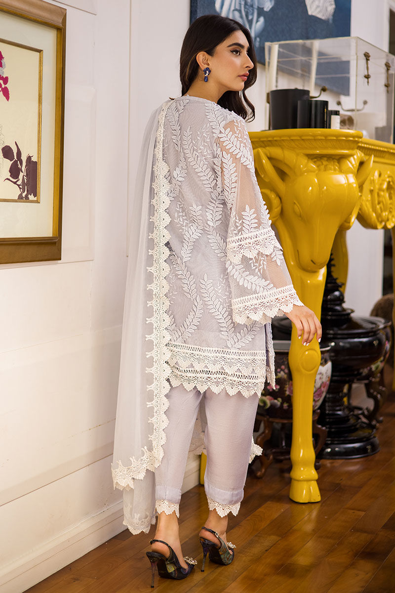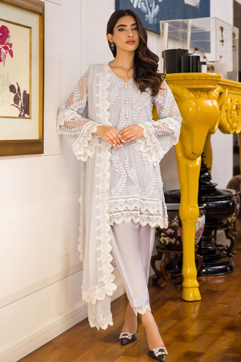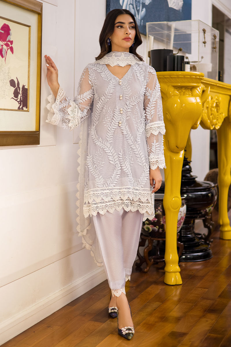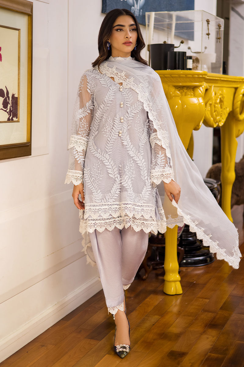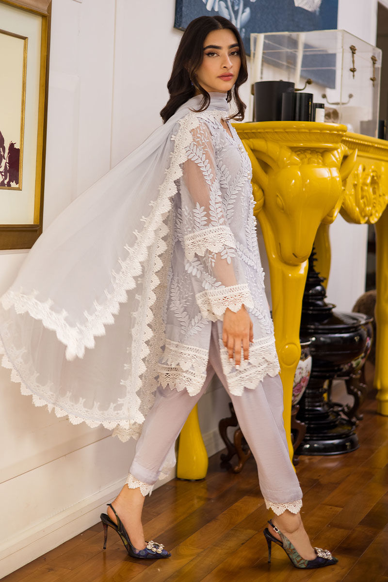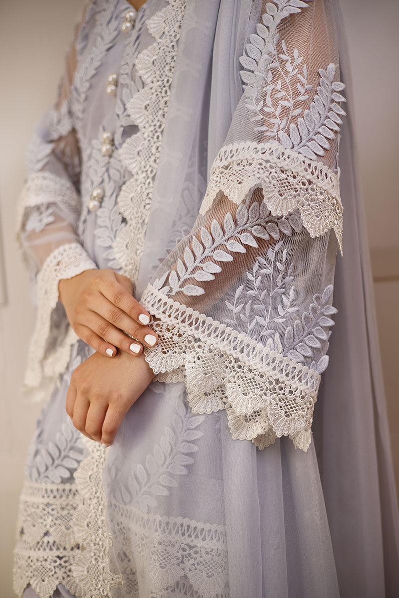 Introducing the stunning Alaya, a fashion masterpiece that will leave you spellbound. Crafted from delicate net fabric, this shirt is adorned with exquisite 3D embroidery and complemented by handmade pearl tassels that add a touch of glamour. The scalloped lace on the damaan and sleeves adds a feminine charm that will leave you feeling like royalty. The chiffon Dupatta is intricately designed with lace all over, while the cotton silk Shalwar features lace edgings for a perfect finish. Get ready to make heads turn with the Alaya, an embodiment of grace and elegance.