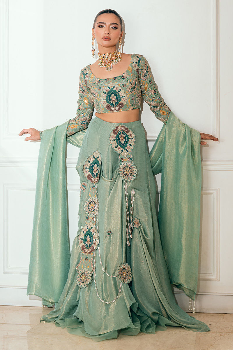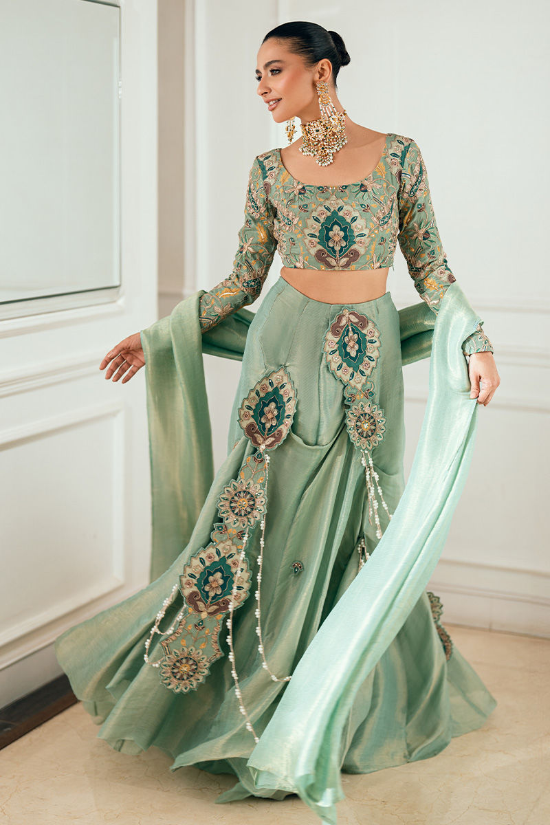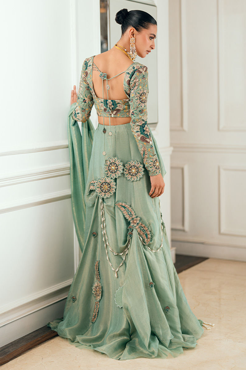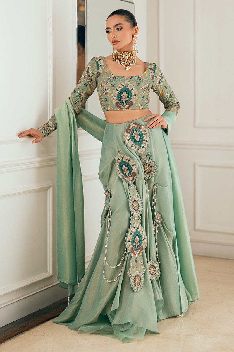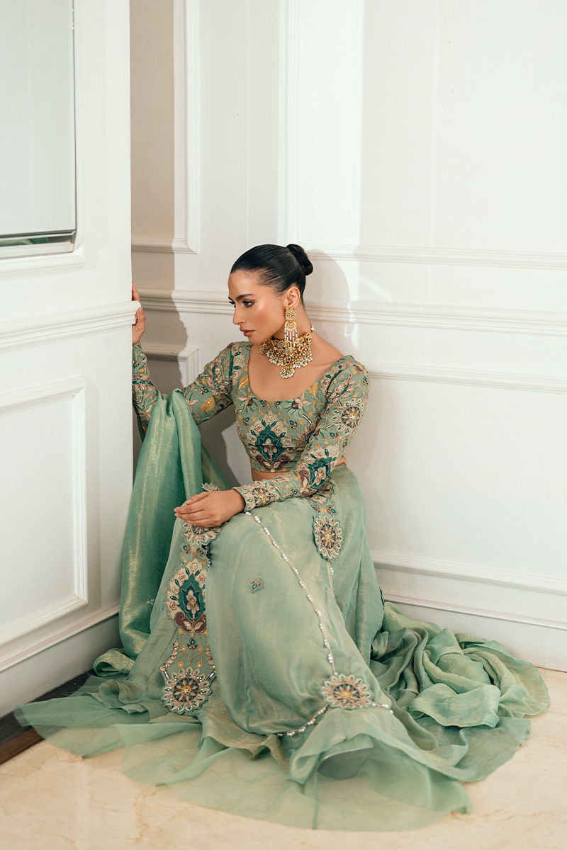 Amelia is a refreshing mint green georgette chiffon choli adorned with intricate handwork featuring zardozi and thread embroidery. It is paired with a masoori fabric lehnga detailed with 3D handwork zardozi brooches and handmade pearl and thread strings for a luxurious finish. The ensemble is completed with a masoori fabric dupatta, enhancing the graceful silhouette.