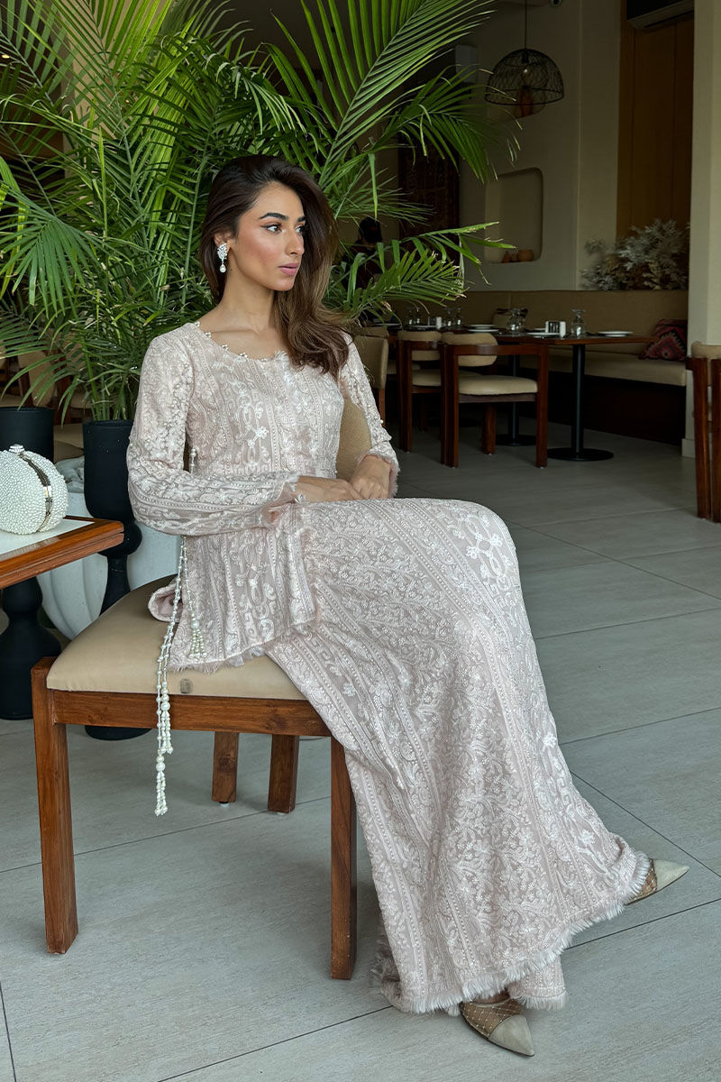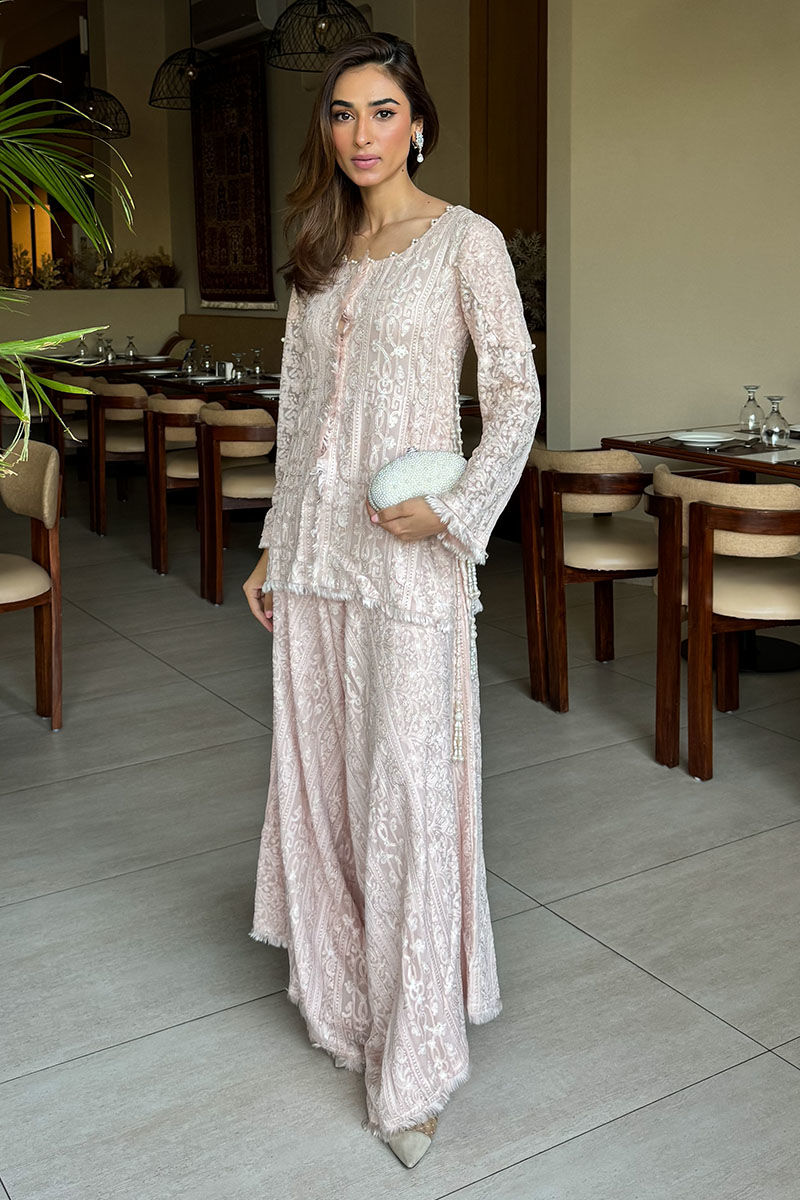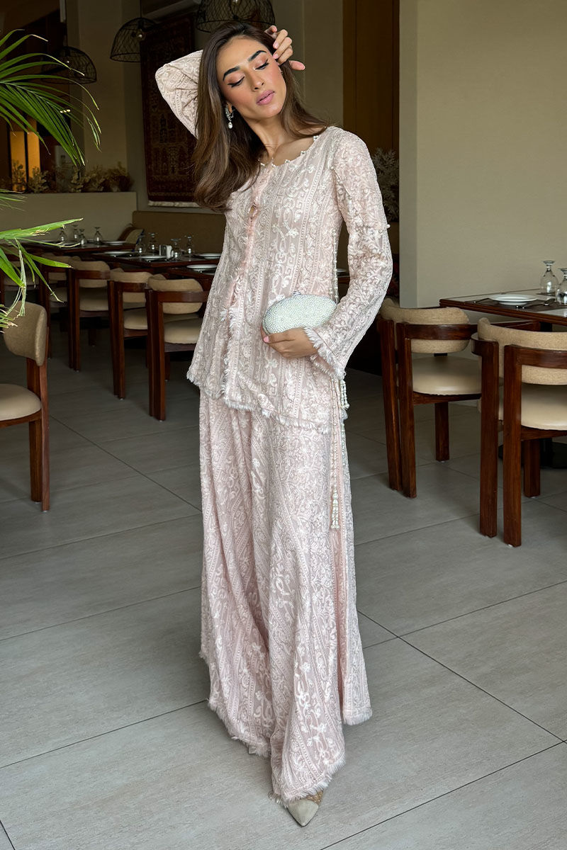 A pink self embroidered set with pearls danglings on the sides and sleeves of the shirt with thread bails on it.