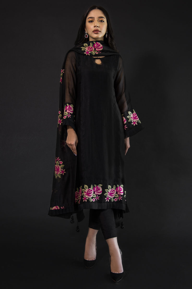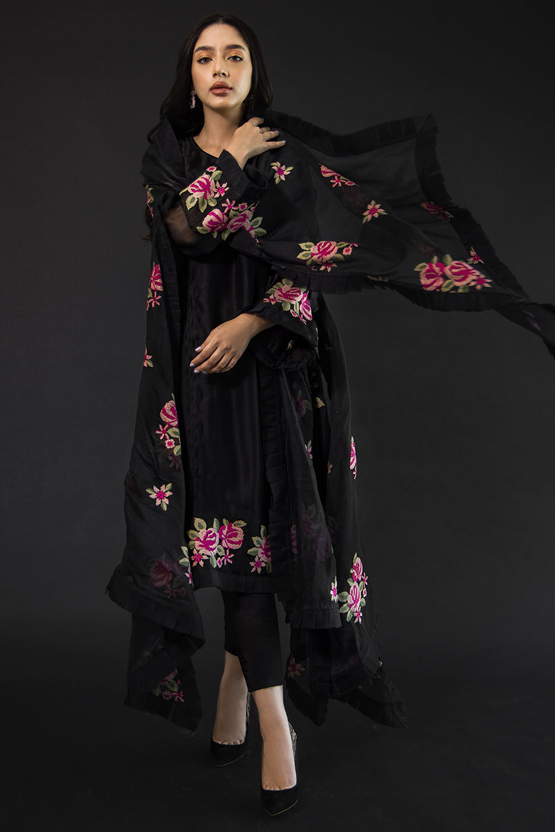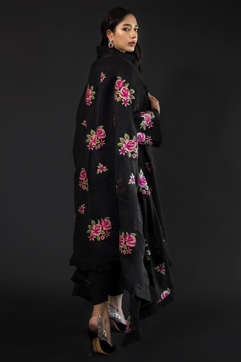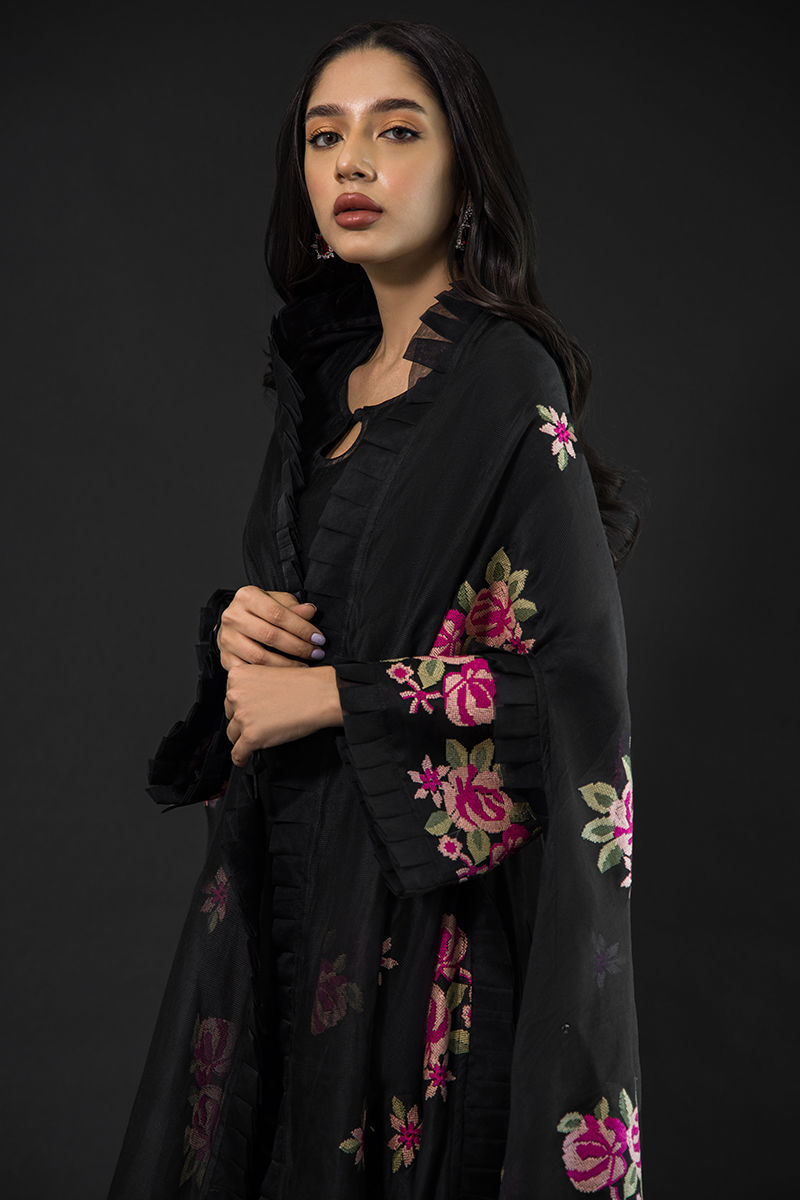 Black cotton net shirt with intricate embroidery and cotton silk lining with floral cross-stitch border on daman and sleeves with organza pleats, paired with delicate dupatta adorn with floral embroidery detailing with organza pleats all over dupatta andcotton silk pants. This modest attire is a statement of class.