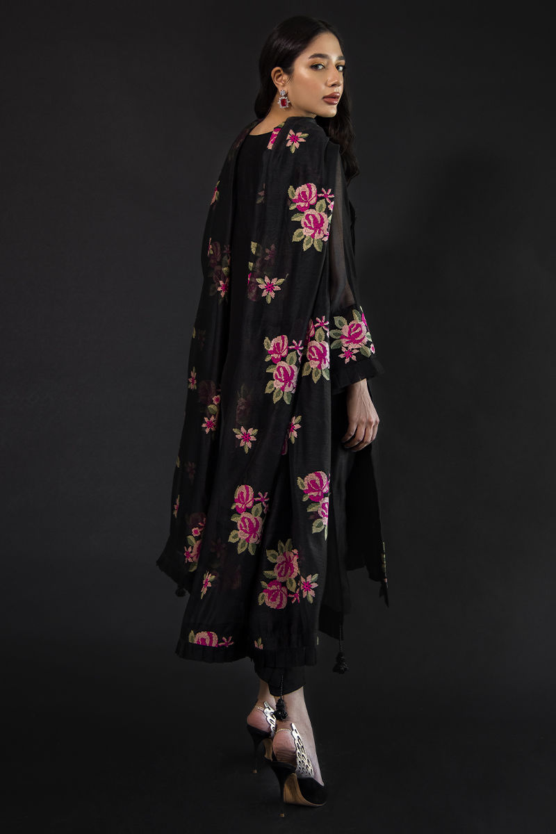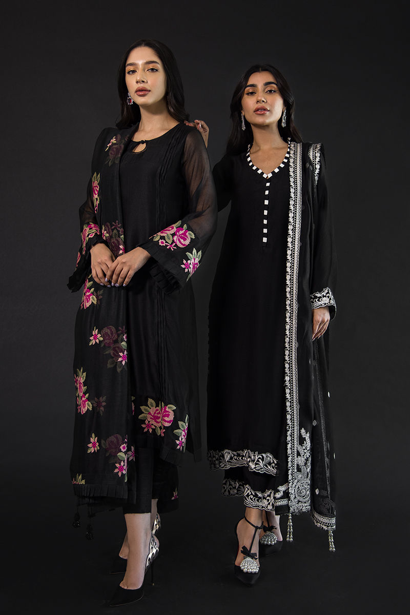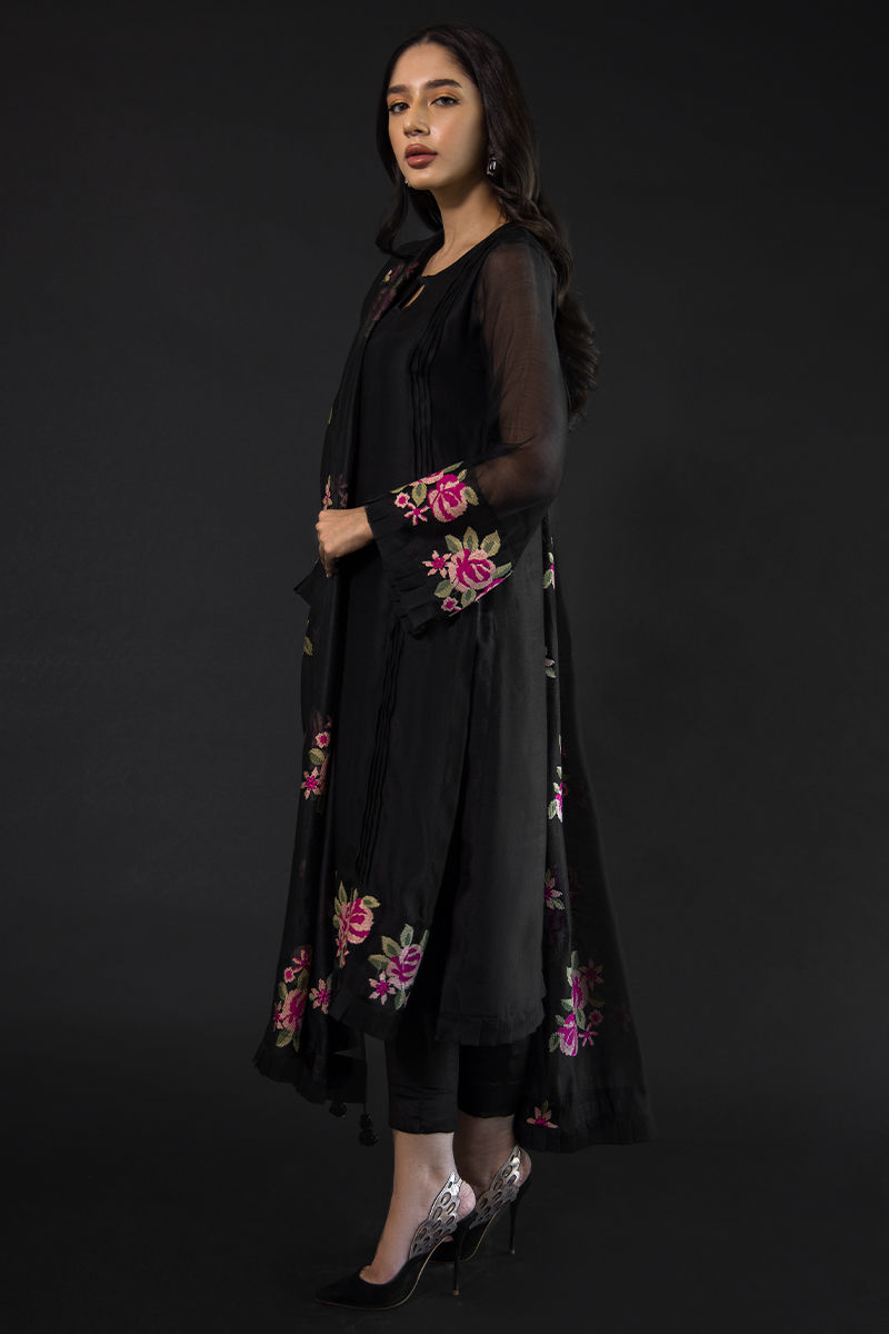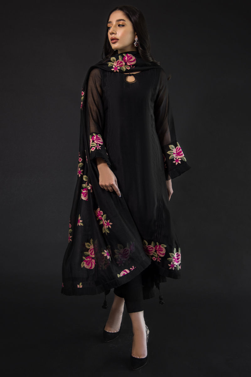 Black cotton net shirt with intricate embroidery and cotton silk lining with floral cross-stitch border on daman and sleeves with organza pleats, paired with delicate dupatta adorn with floral embroidery detailing with organza pleats all over dupatta andcotton silk pants. This modest attire is a statement of class.
