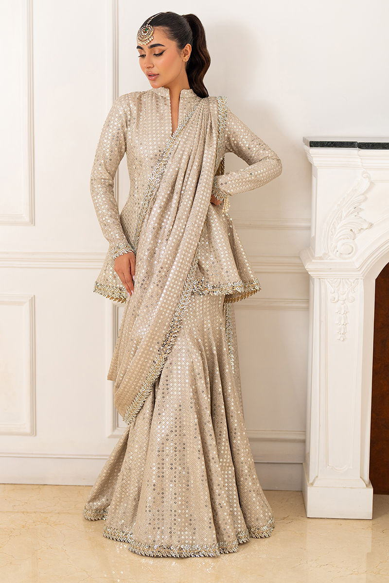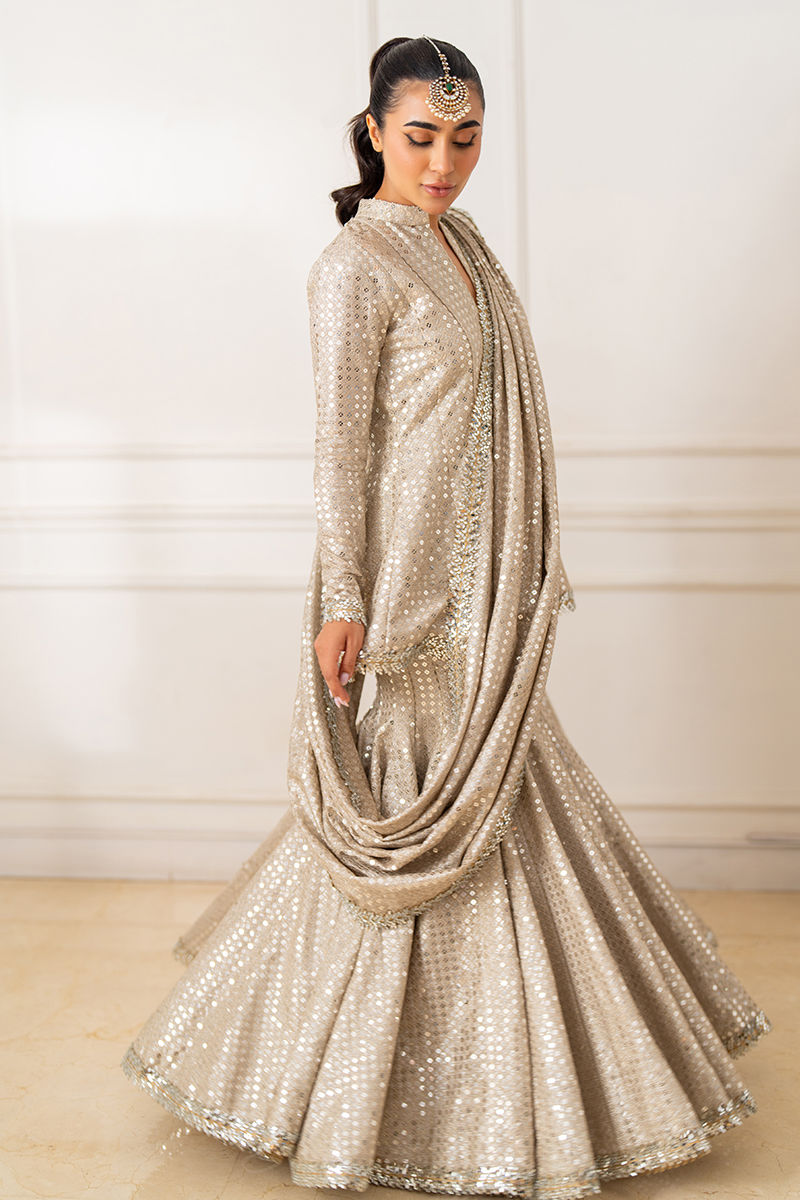 Shine brightly in this peplum lehenga with a draped dupatta, featuring intricate sequin work and a mirror lace border. A stunning fusion of modern elegance and traditional charm.