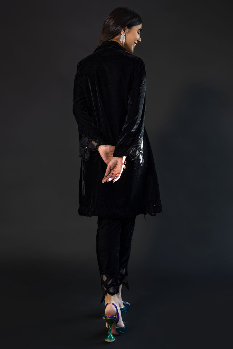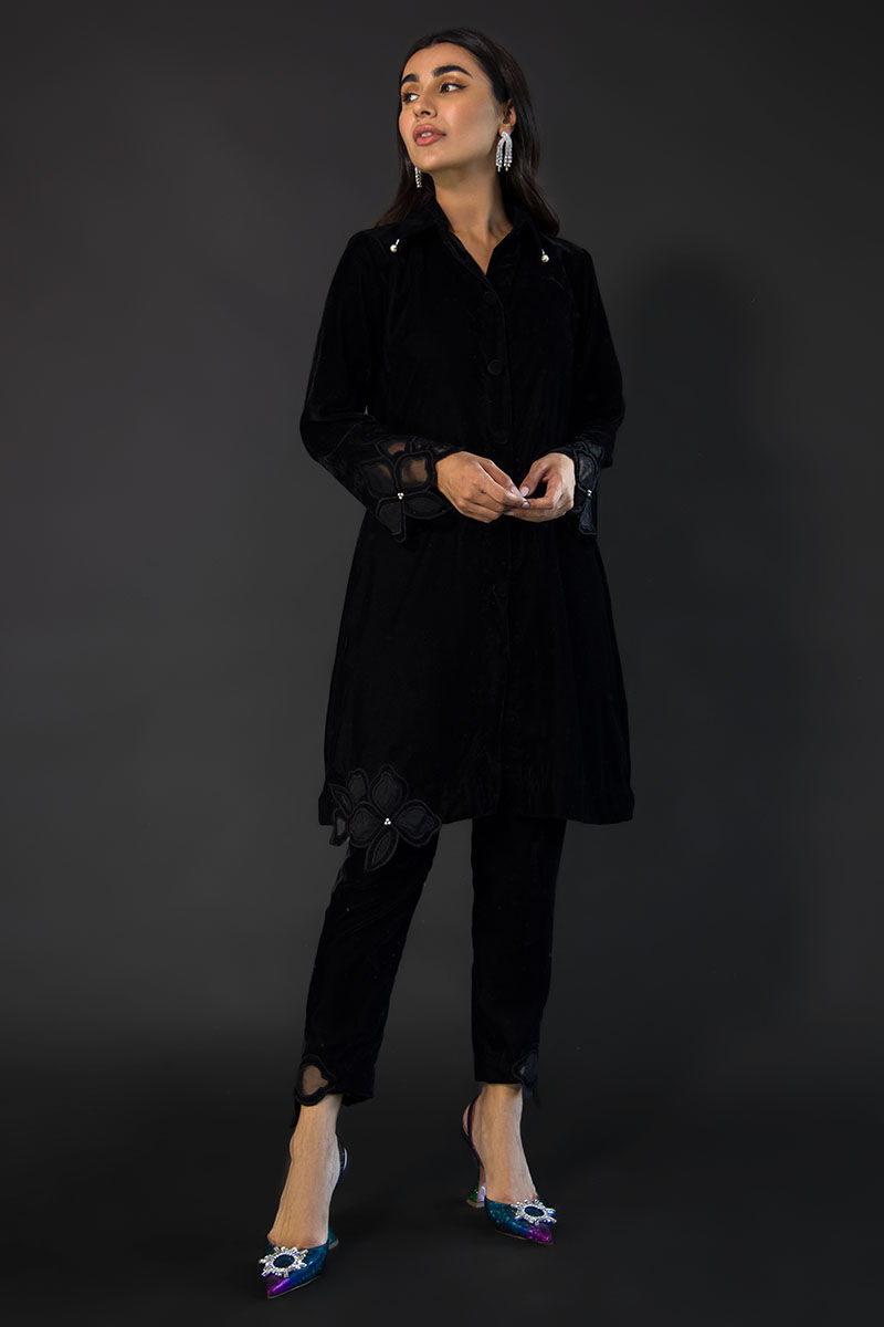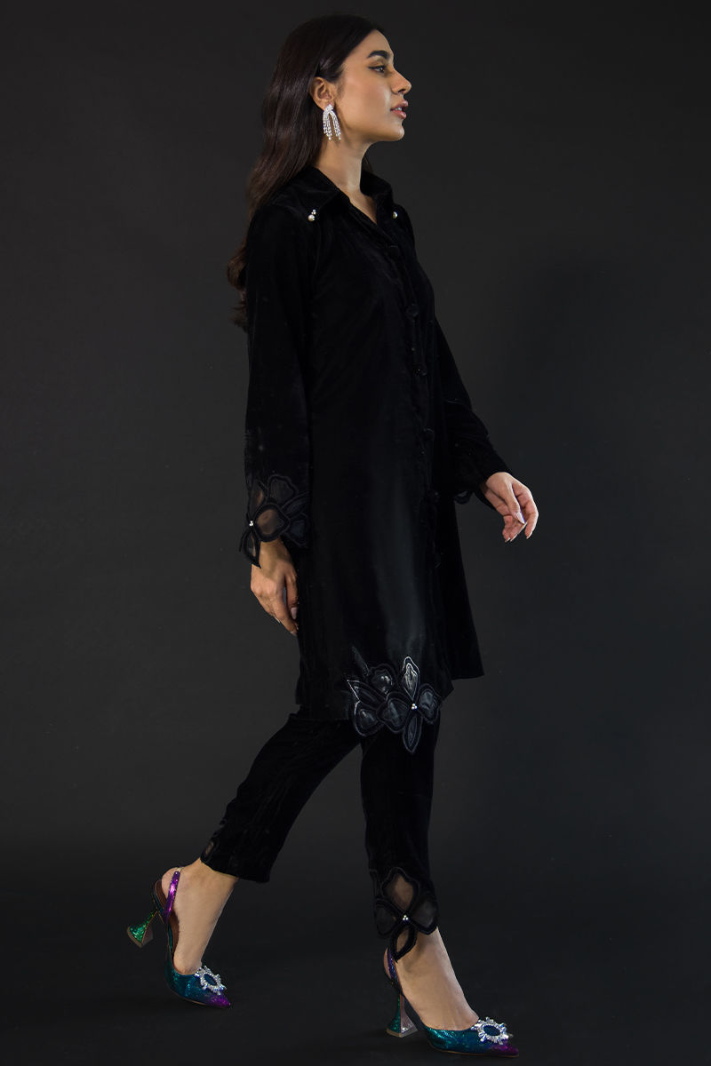 A breath-taking silhouette in black features intricate detailing embellished with pearls and 3D floral cutwork at the shirt hem, sleeves cuff, and trouser bottom edge. The shirt has velvet buttons on it and pearl detailing on the collar. exquisitely designed for a lavish event.