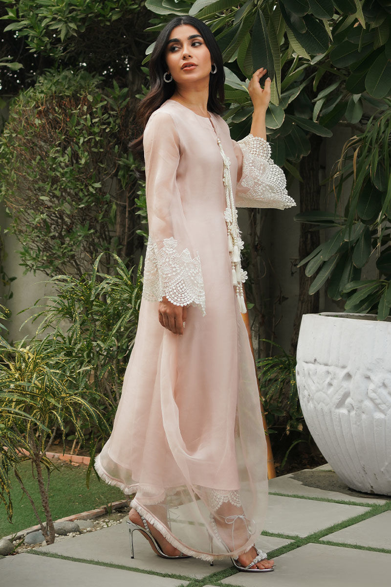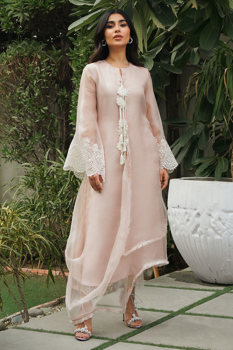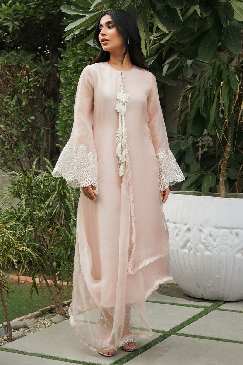 Step into elegance with a pink pure organza lined shirt featuring a pleated cut. The neckline is adorned with handmade thread pearl and floral tassels, complemented by meticulous thread finishing throughout the shirt. Embroidered cutwork appliqué border graces the sleeves, creating a sophisticated and stylish ensemble.