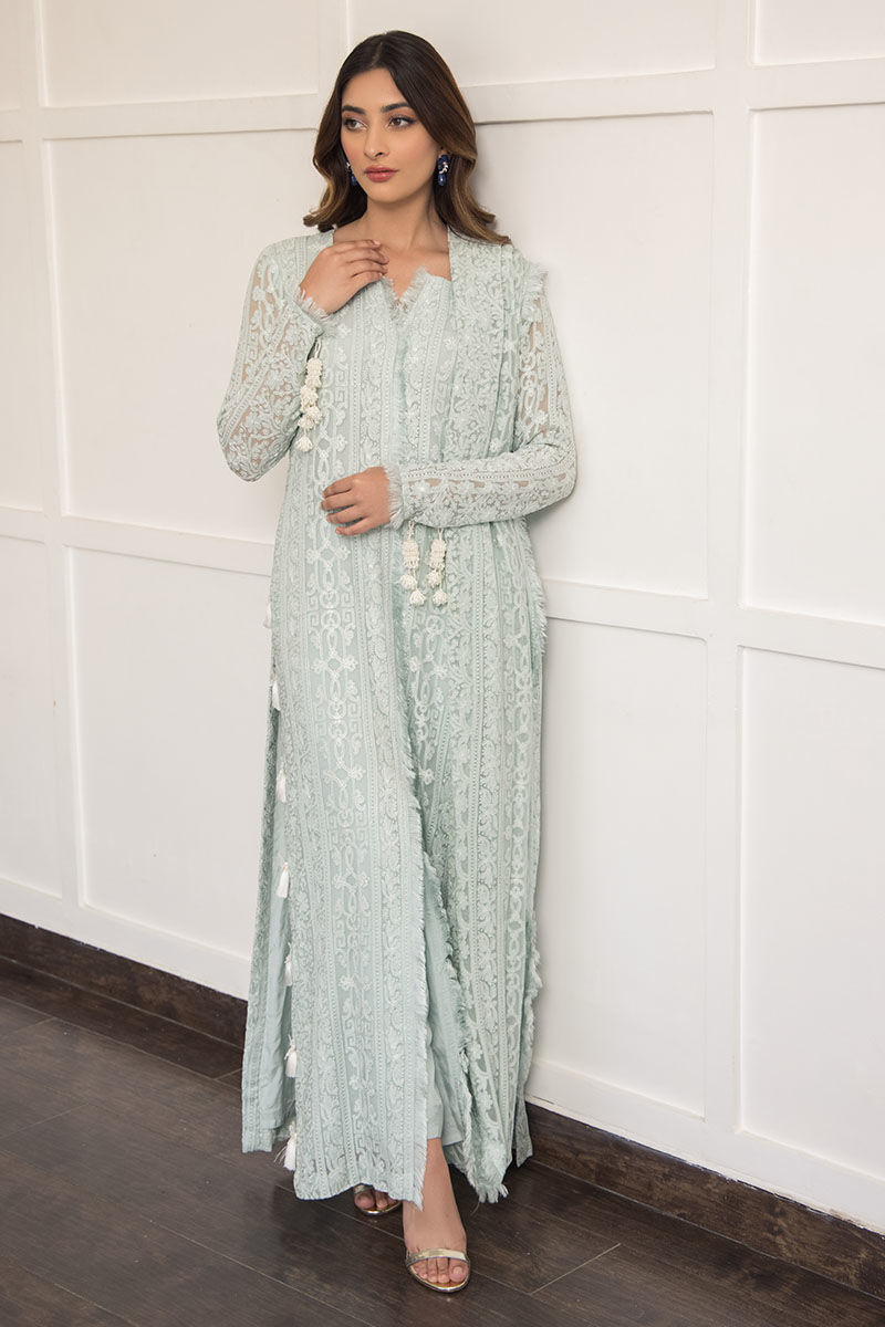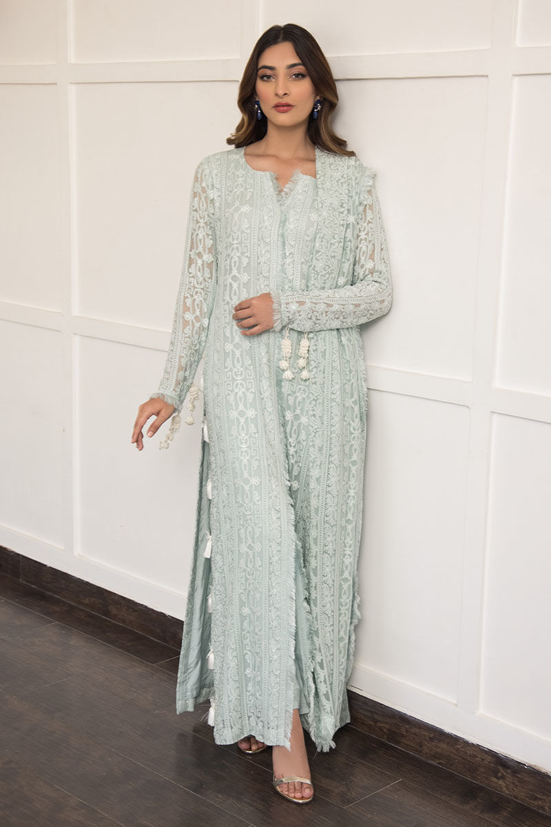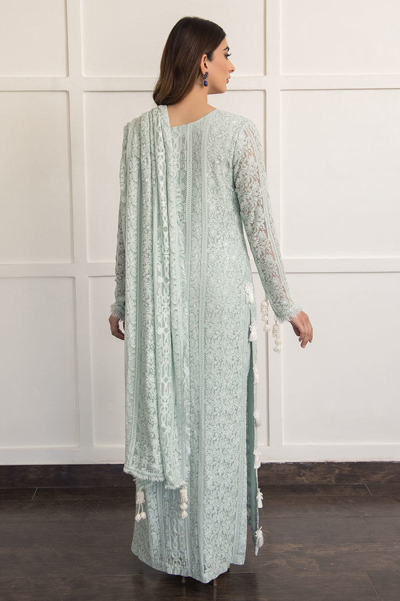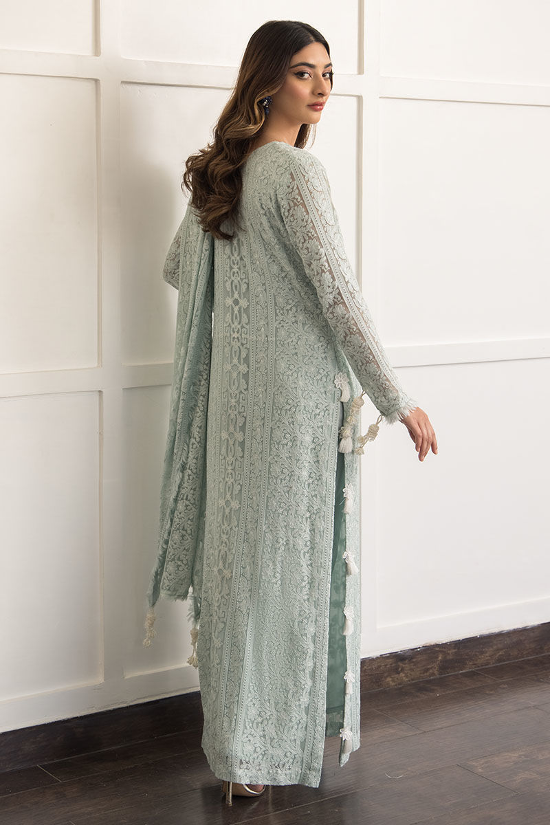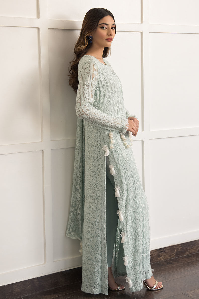 Bleu greenish blue hue made from georgette chiffon with attached cotton silk lining with handcrafted tassels on the sleeves and on the side slits of the shirt. Handcrafted frayed edges featured on the neckline and corners of the dupatta. Paired with cigarette cotton silk pants.