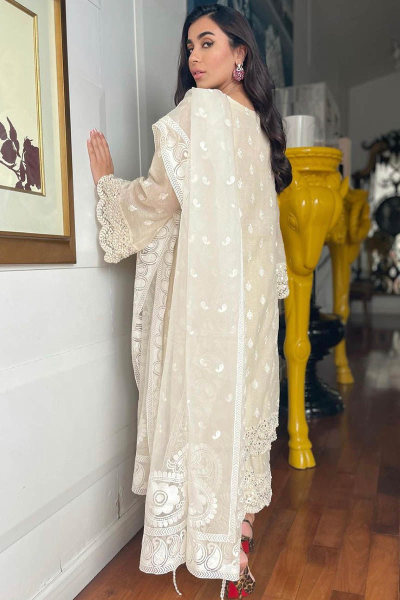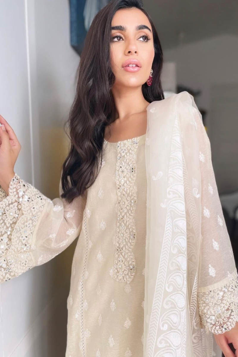 Pure cotton net motif shirt with lace, hand work, and matching pants and pure organza dupatta with embroidery and tassels.