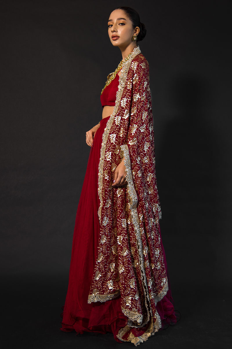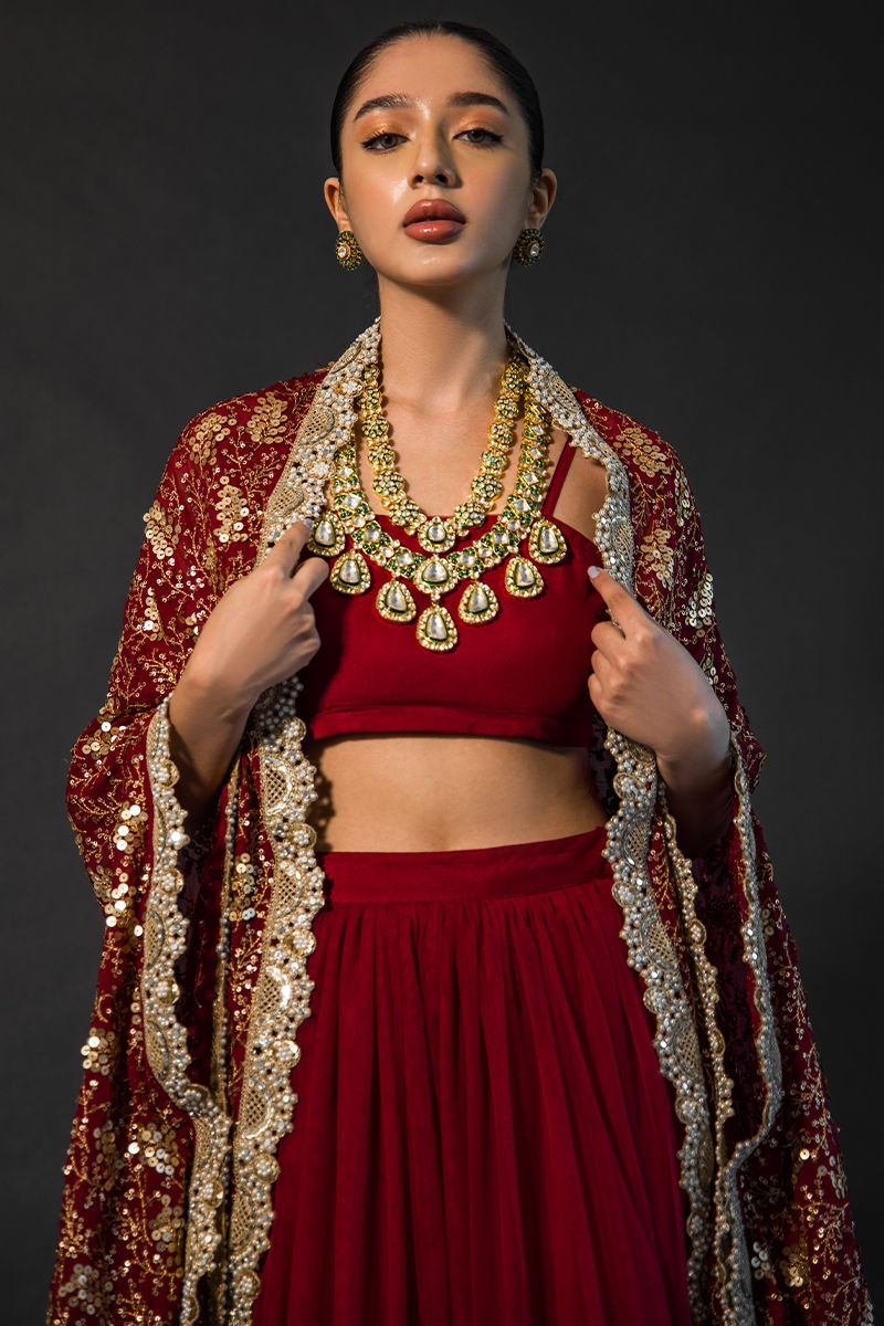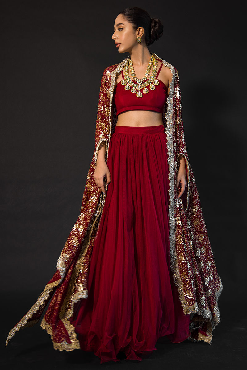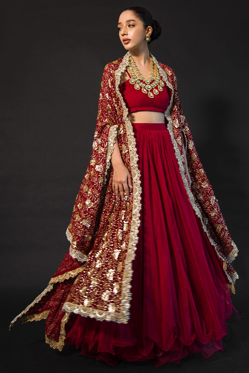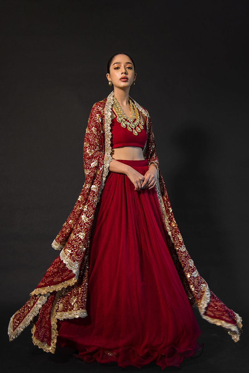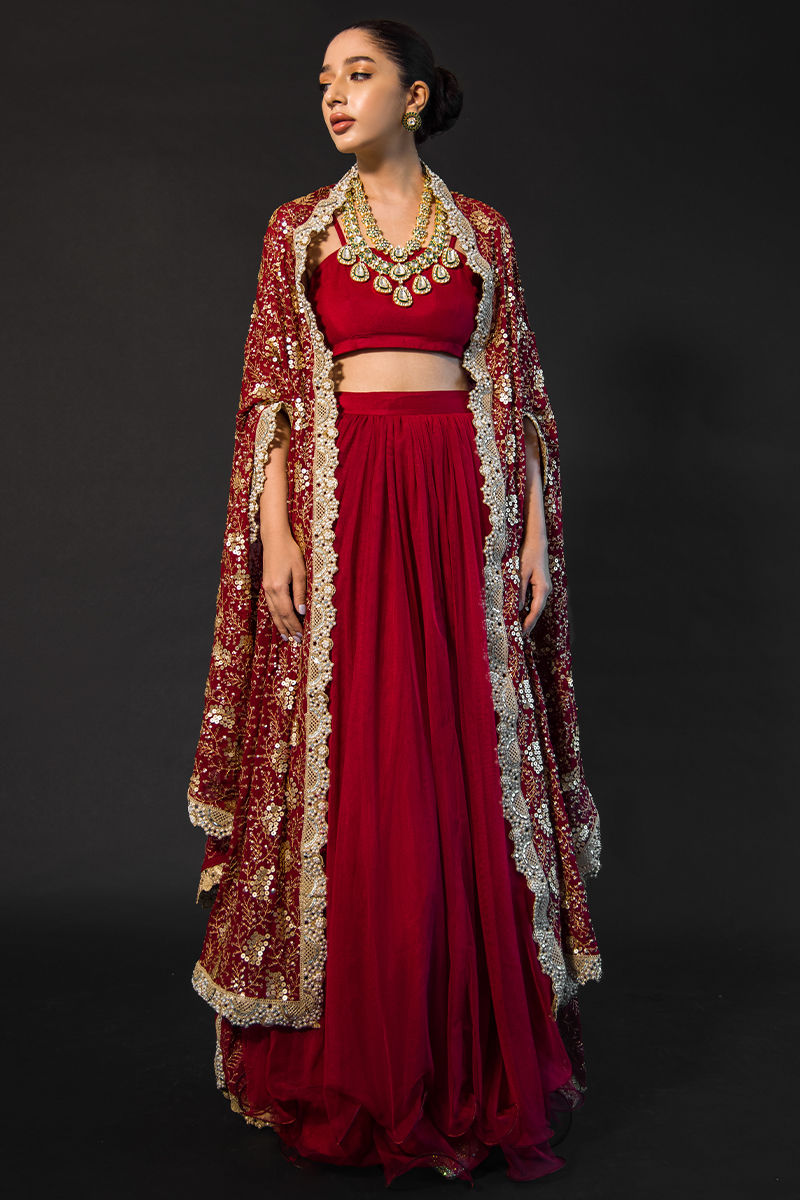Astonishing looks endure from dazzling lenghas and cholis in timeless hues and silhouettes. red net wired lengha with attached cotton silk lining; red net spaghetti strap choli with self-embroidered sequence cape The dupatta is embellished with pearls and scallop borders.