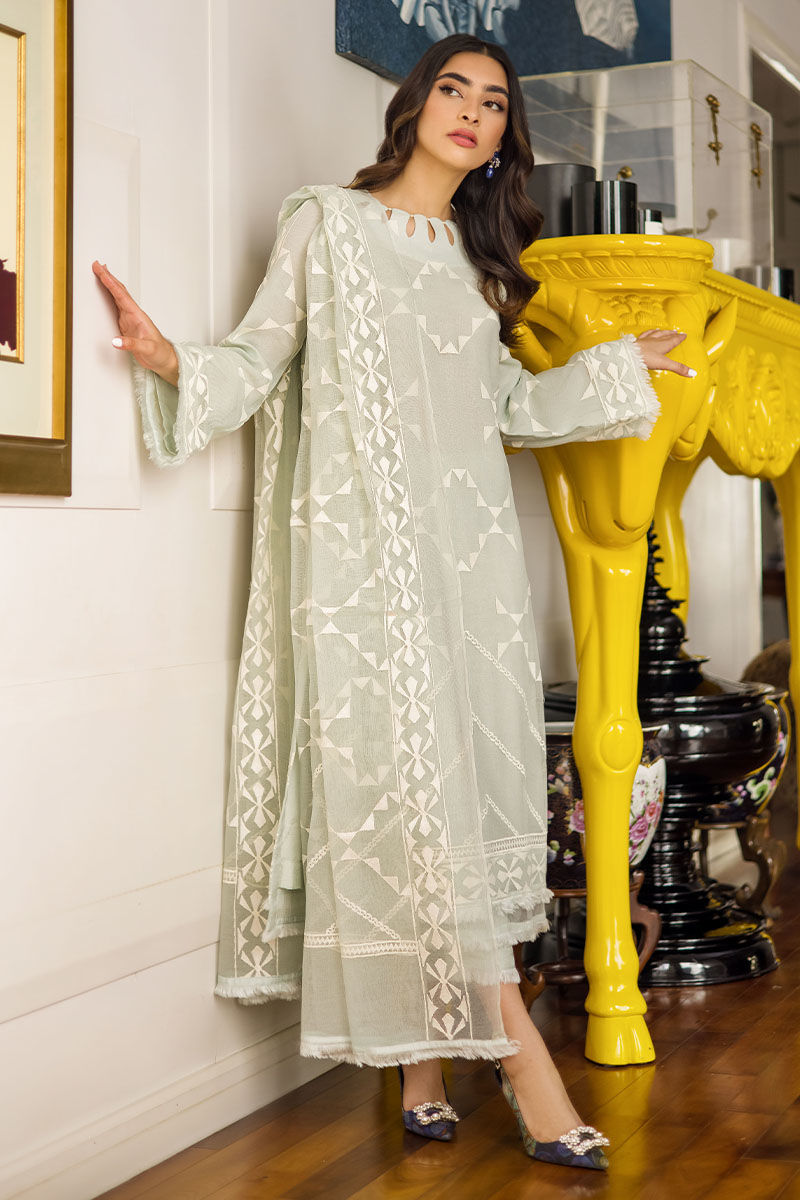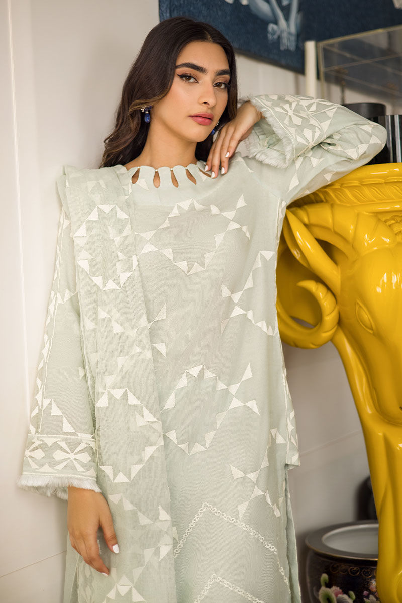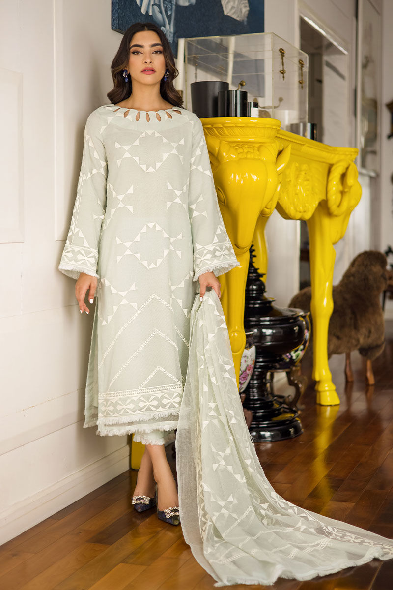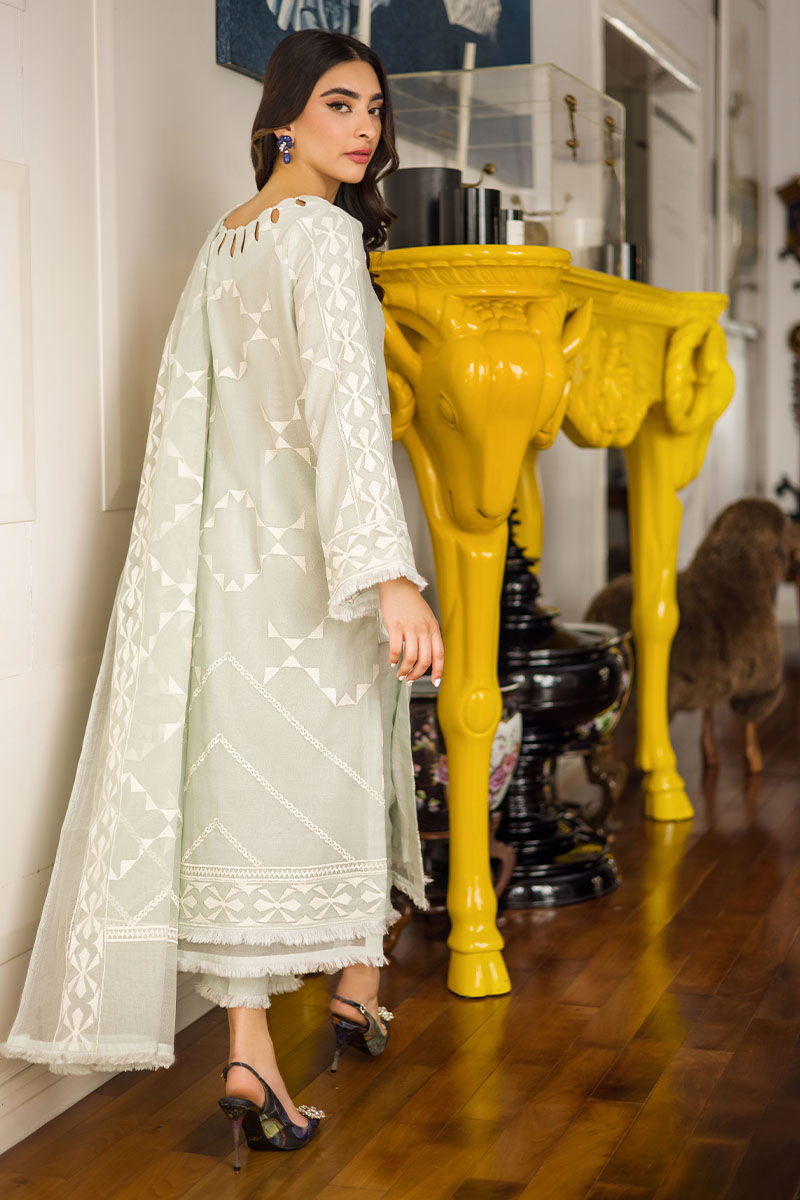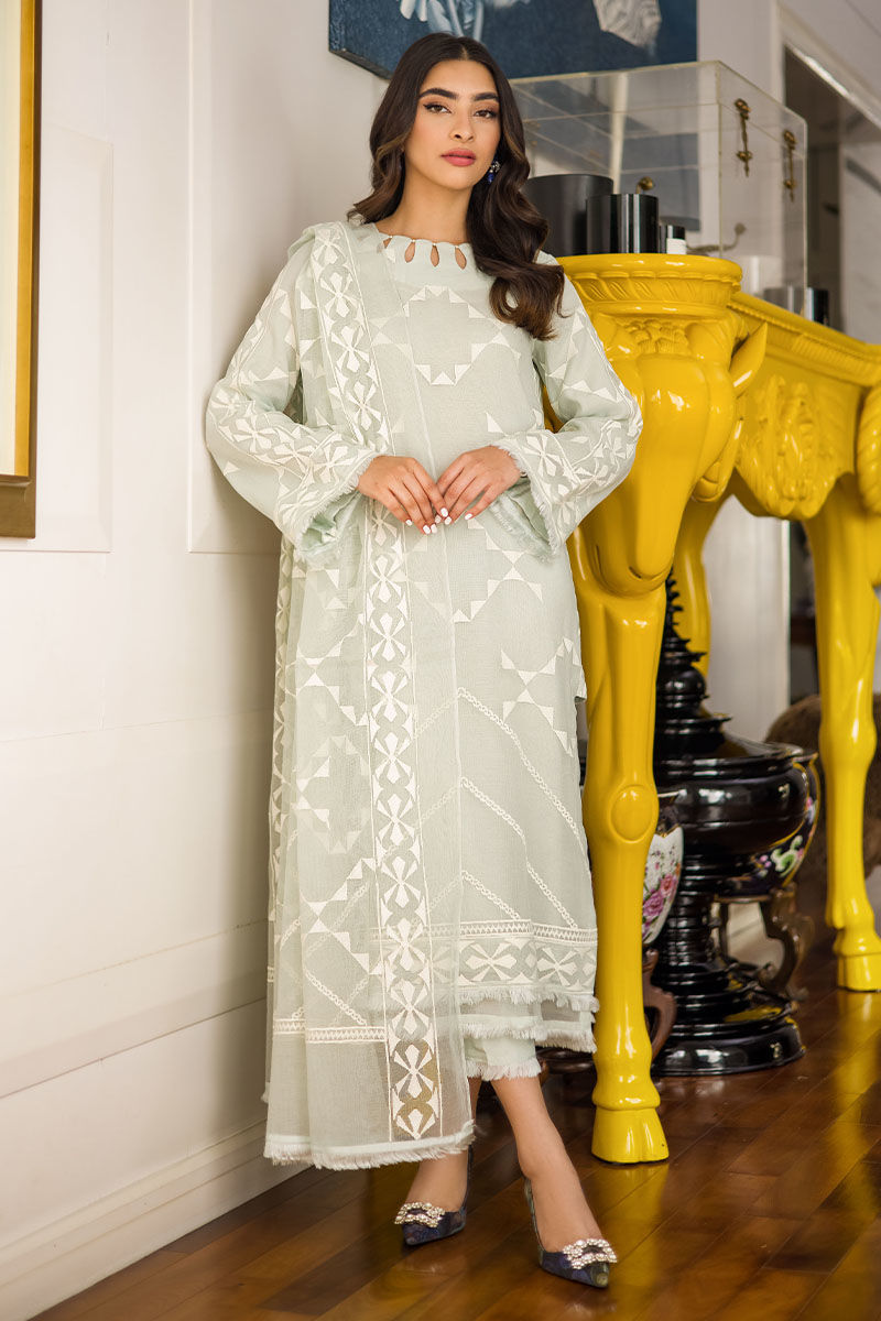 Introducing the stunning Ciara pure cotton net shirt with exquisite embroidery work all over, perfect for the fashion-forward woman who loves to make a statement. The pearl neckline on the shirt adds a touch of elegance to the overall look, while the attached cotton silk lining ensures comfort and durability. The hand thread work lace on the damaan and sleeves adds a touch of sophistication to this beautiful piece. The Dupatta is equally stunning with all-over embroidery and thread work lace, adding a perfect finishing touch to the outfit. Pair it with the cotton silk pants with all-over embroidery and thread work lace, and you have an ensemble that is both stylish and comfortable. Elevate your wardrobe with this piece that is sure to turn heads.