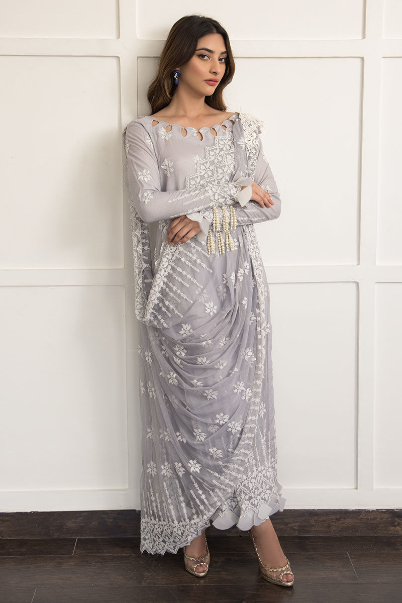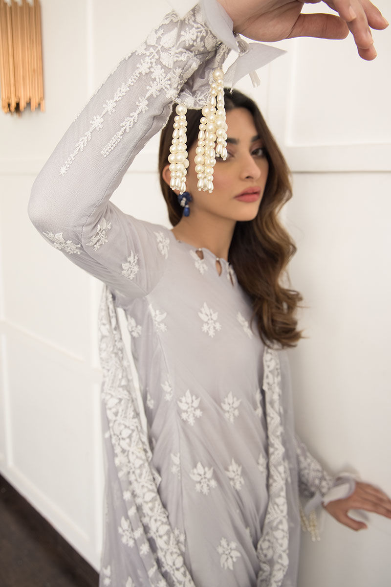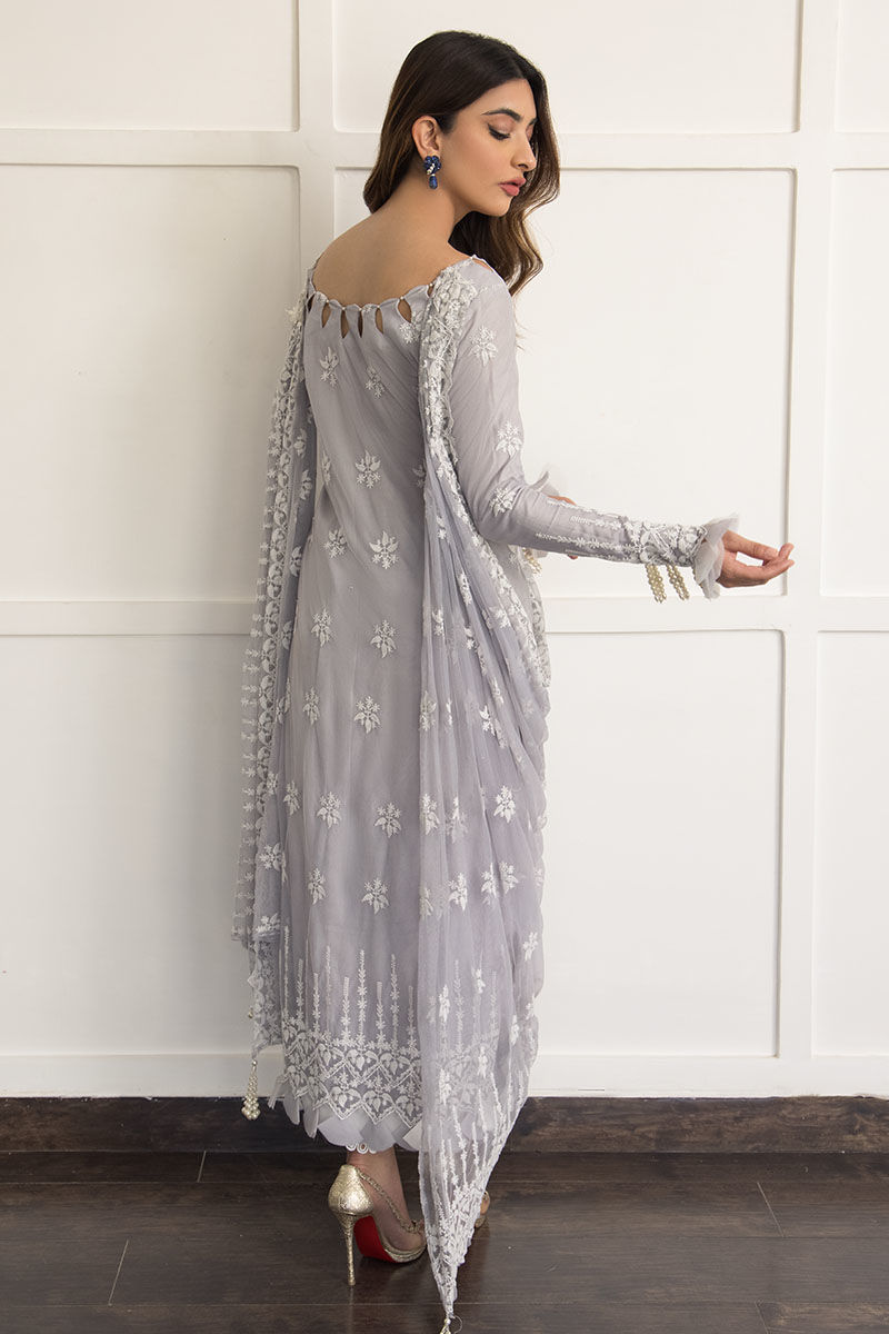 Clematis features a lovely lavender hue made from net with attached cotton silk lining with all embroidery all, featuring a cutwork neckline with pearls on it and handmade pearls tassel and handcrafted tukri work on the sleeves and damaan. Paired with cotton silk pants with attached draped dupatta with pearl tassels and an intricate 3D broach on the shoulder.