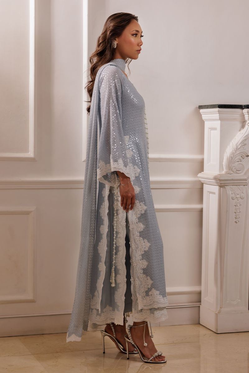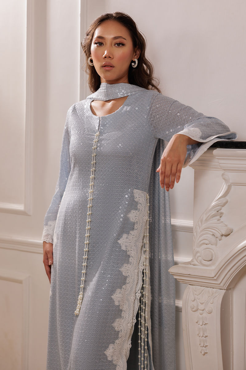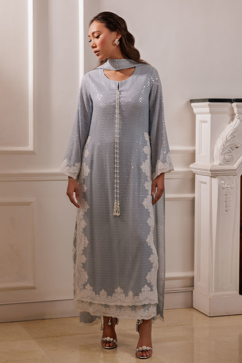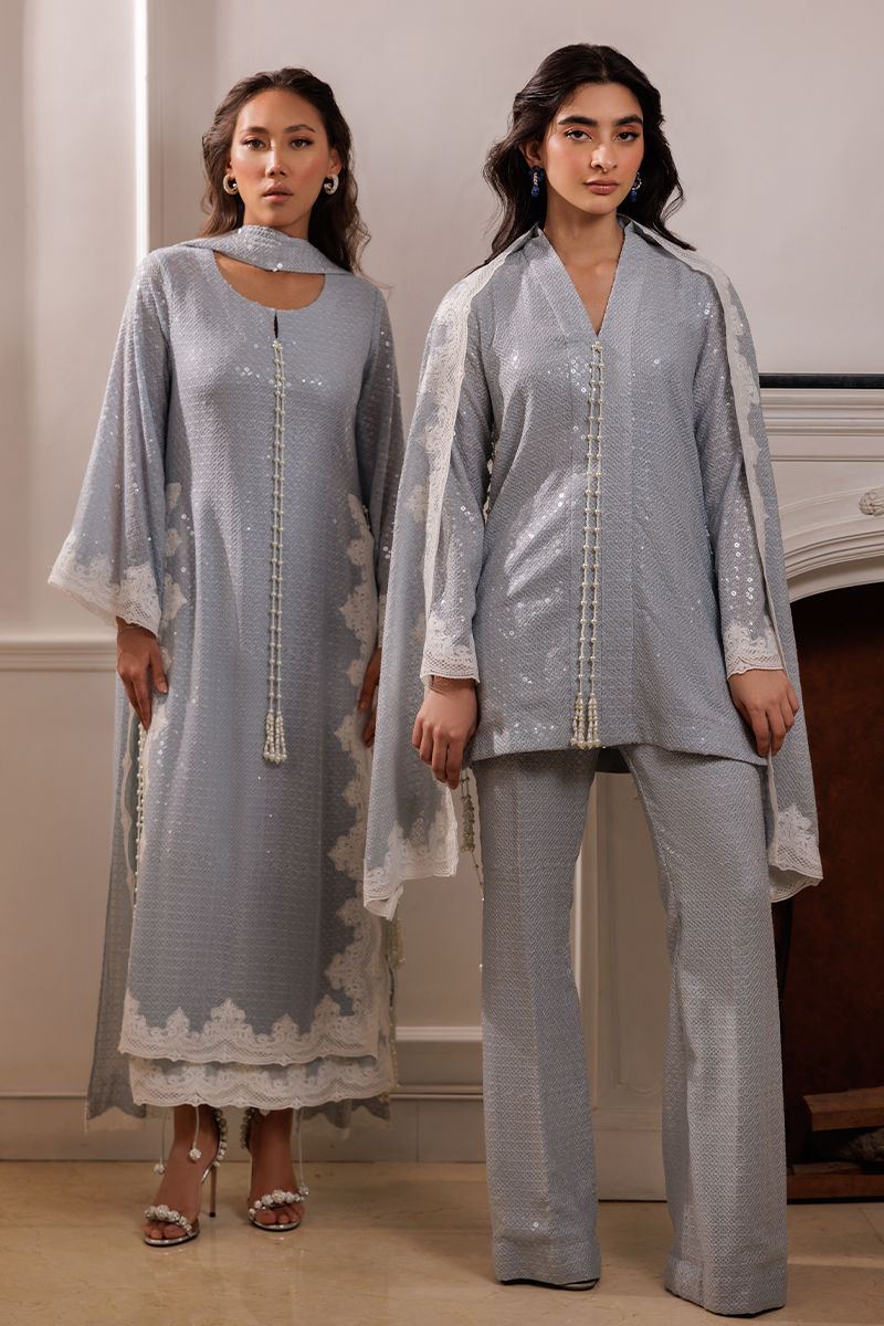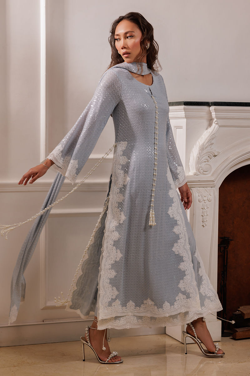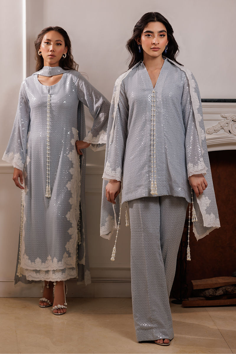 The Coco ensemble features a long bluish georgette shirt with sequin fabric, adorned with embroidered cutwork lace on the sides. Handmade pearl tassels on the sides add a refined touch. The set includes a pleated dupatta with a cutwork border and cotton silk pants, offering a sophisticated and balanced look.