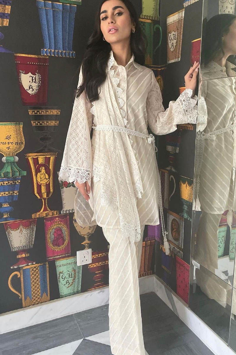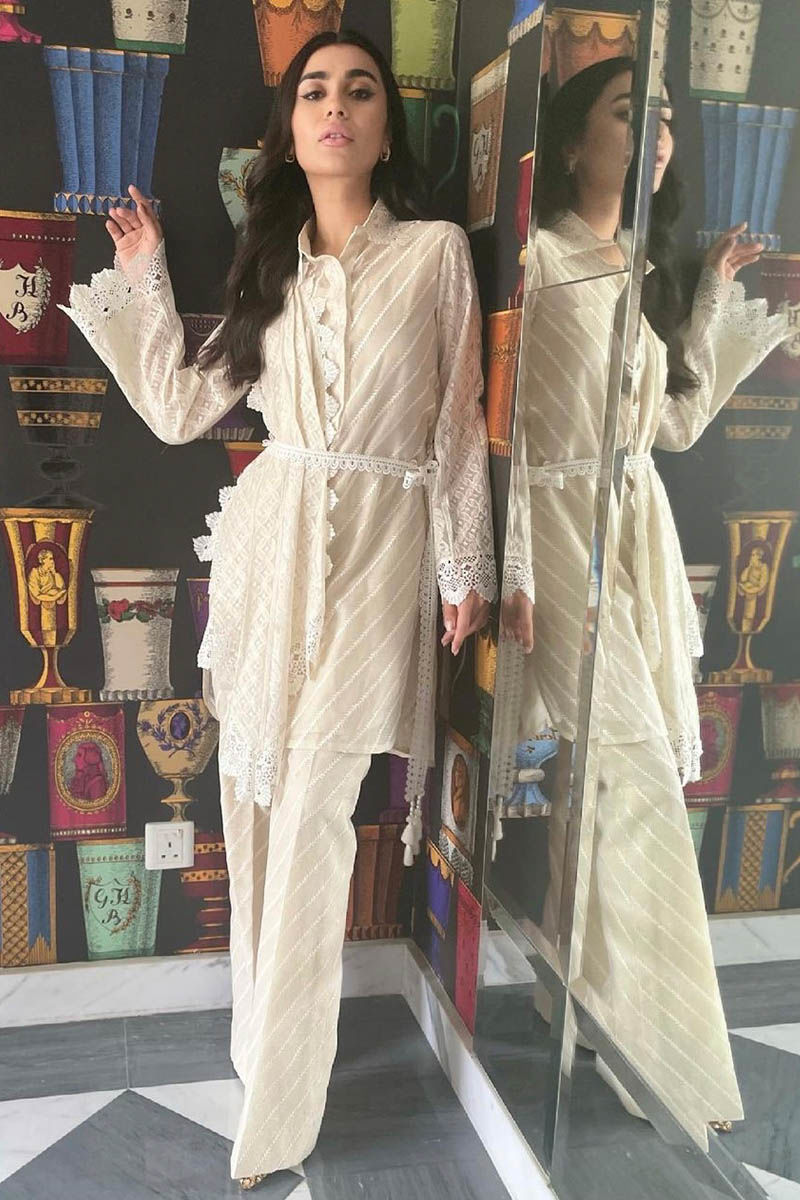 Self embroidered cotton net shirt with lace detailing and matching  palazzos pants and cotton net chikankar attached duppatta, loops lace belt added as well.