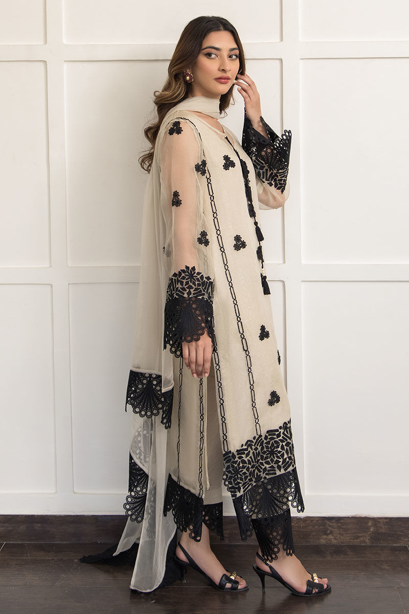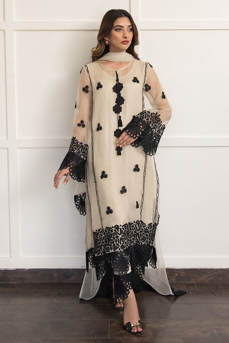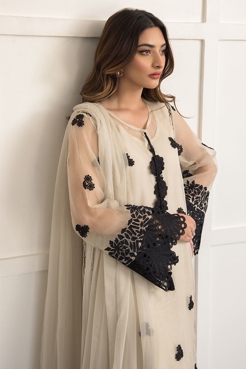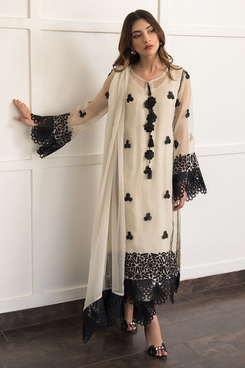 Accentuated with cutwork lace on the sleeves and damaan, paired with a chiffon duppatta with cutwork lace and cigarette pants with cutwork lace on the edges.
