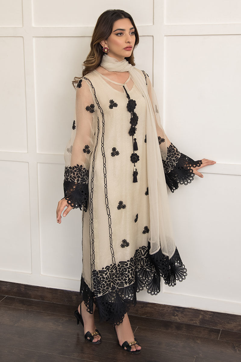 Dina is made from pure organza with separate cotton silk slip, featuring detailed 3D flowers and applique cutwork on the damaan and the sleeves with floral 3D handcrafted tassels on the neckline.