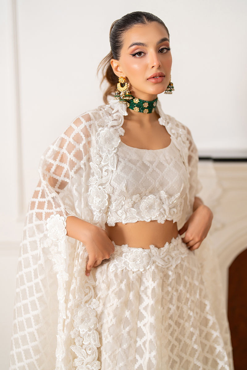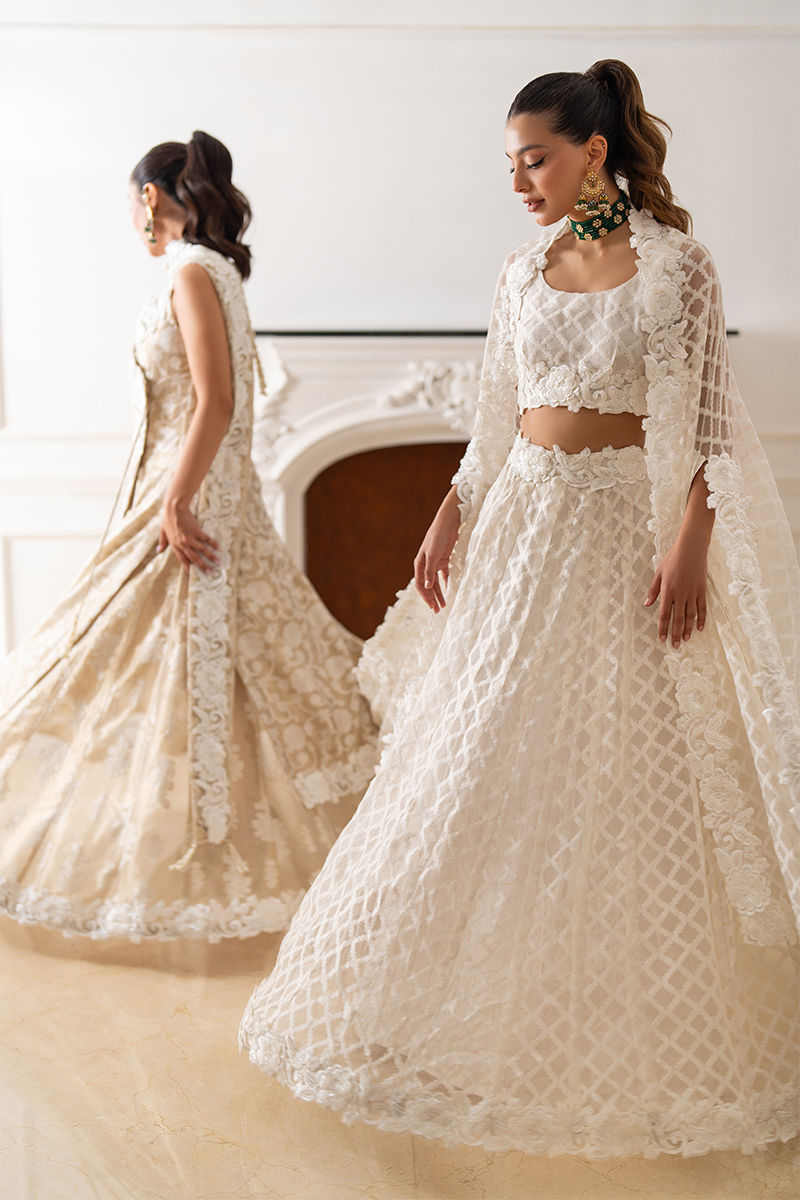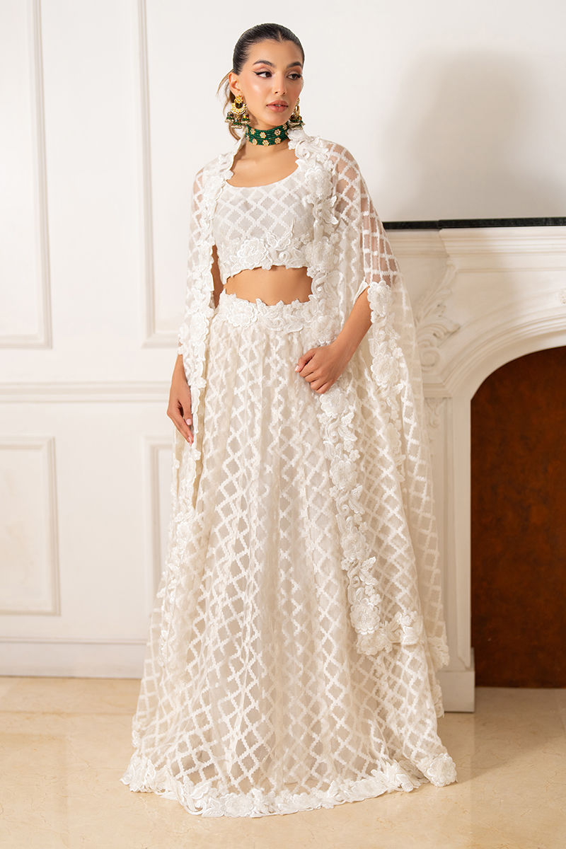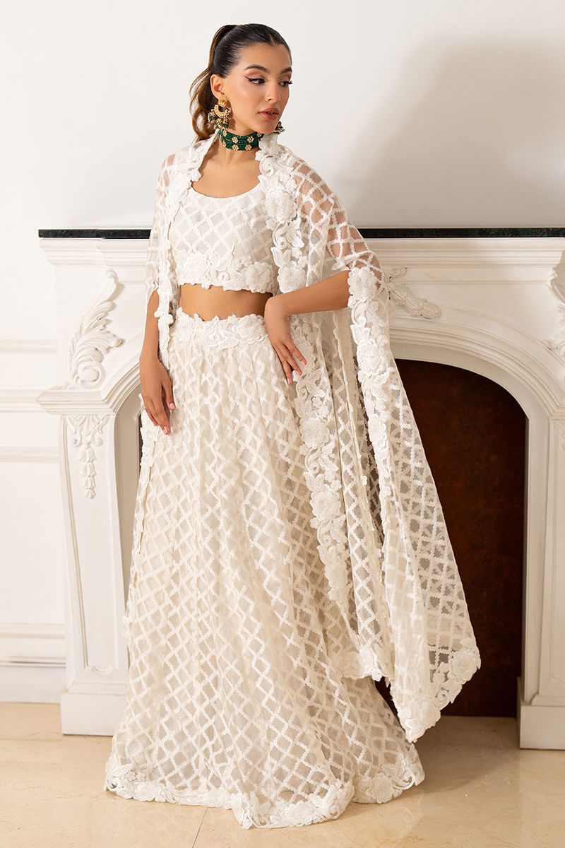 Experience ethereal beauty in this white cotton net lengha choli, featuring a delicate cape adorned with 3D floral lace. A perfect blend of grace and intricate detail.