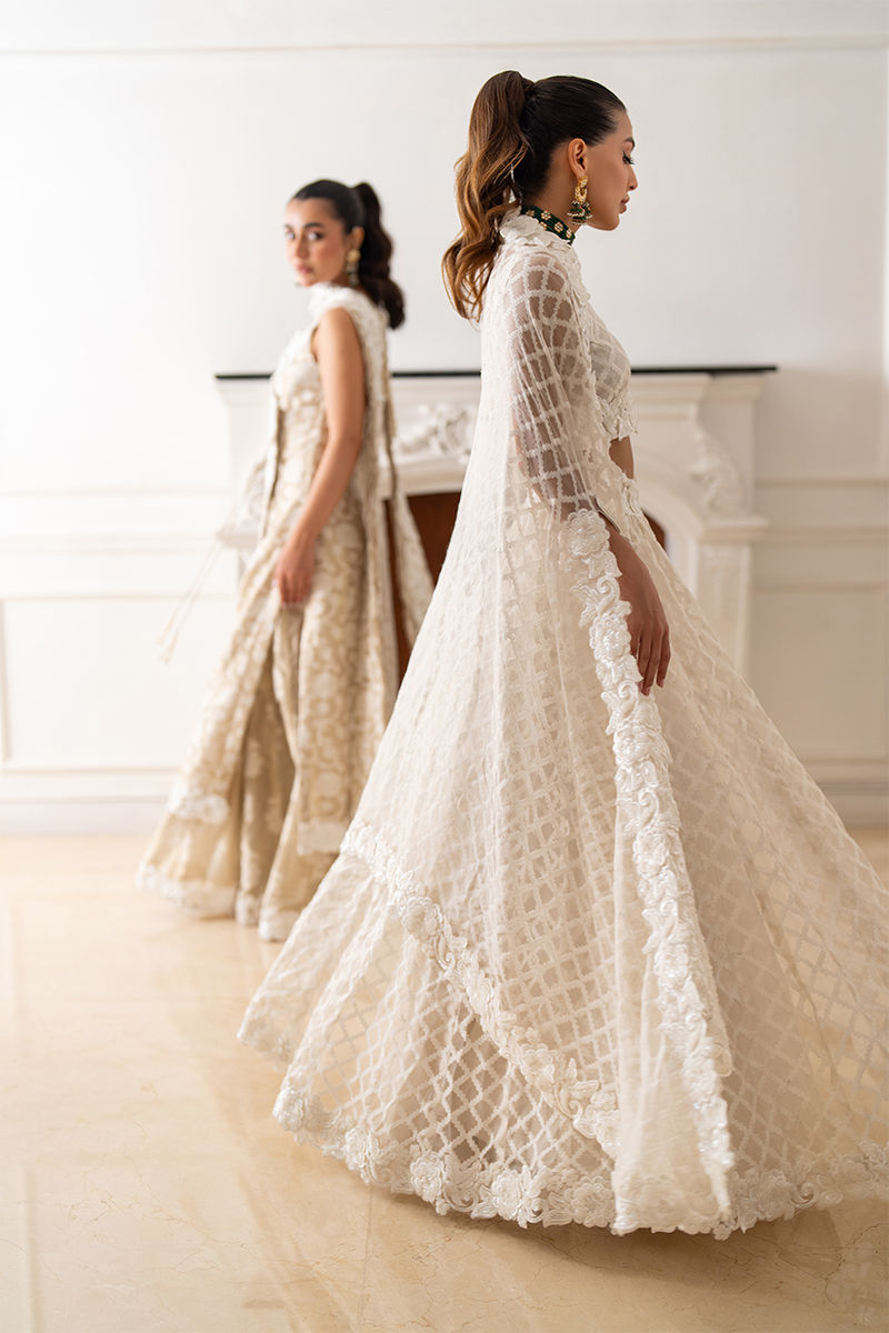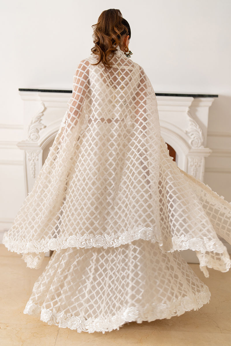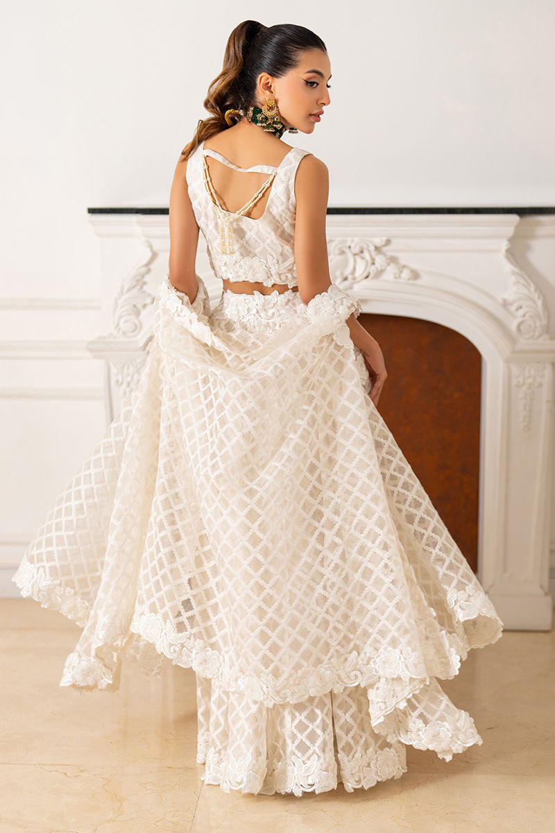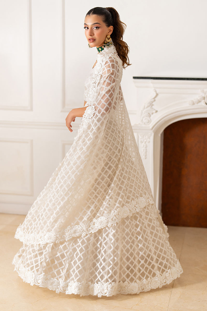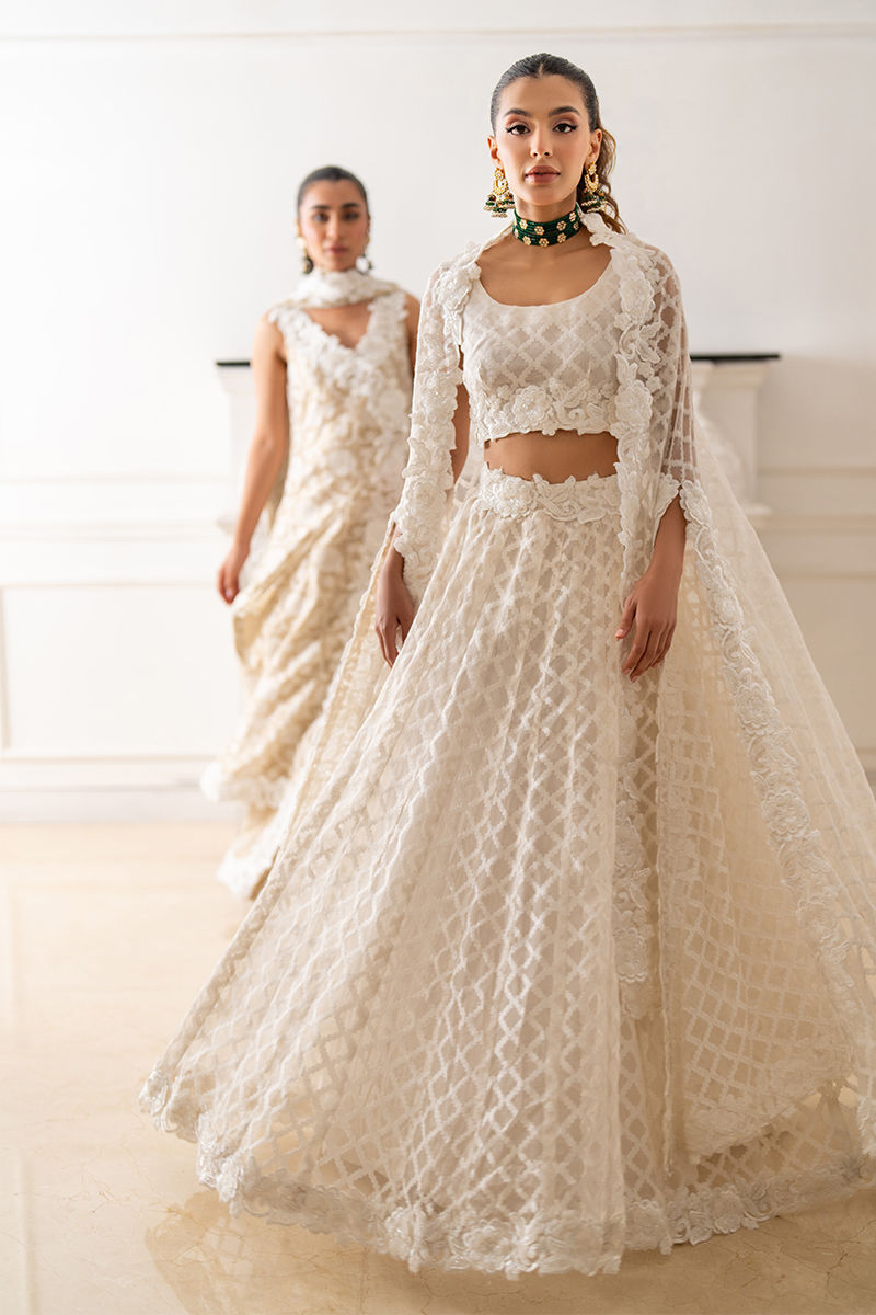 Experience ethereal beauty in this white cotton net lengha choli, featuring a delicate cape adorned with 3D floral lace. A perfect blend of grace and intricate detail.