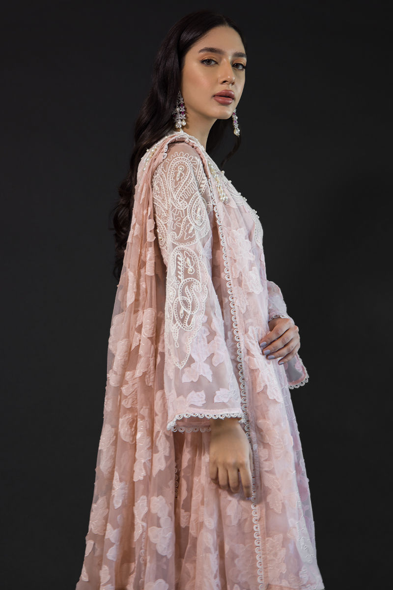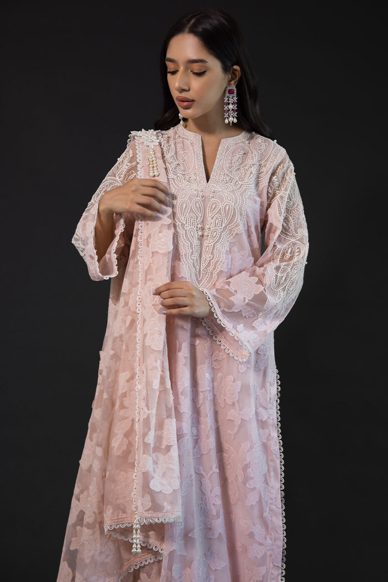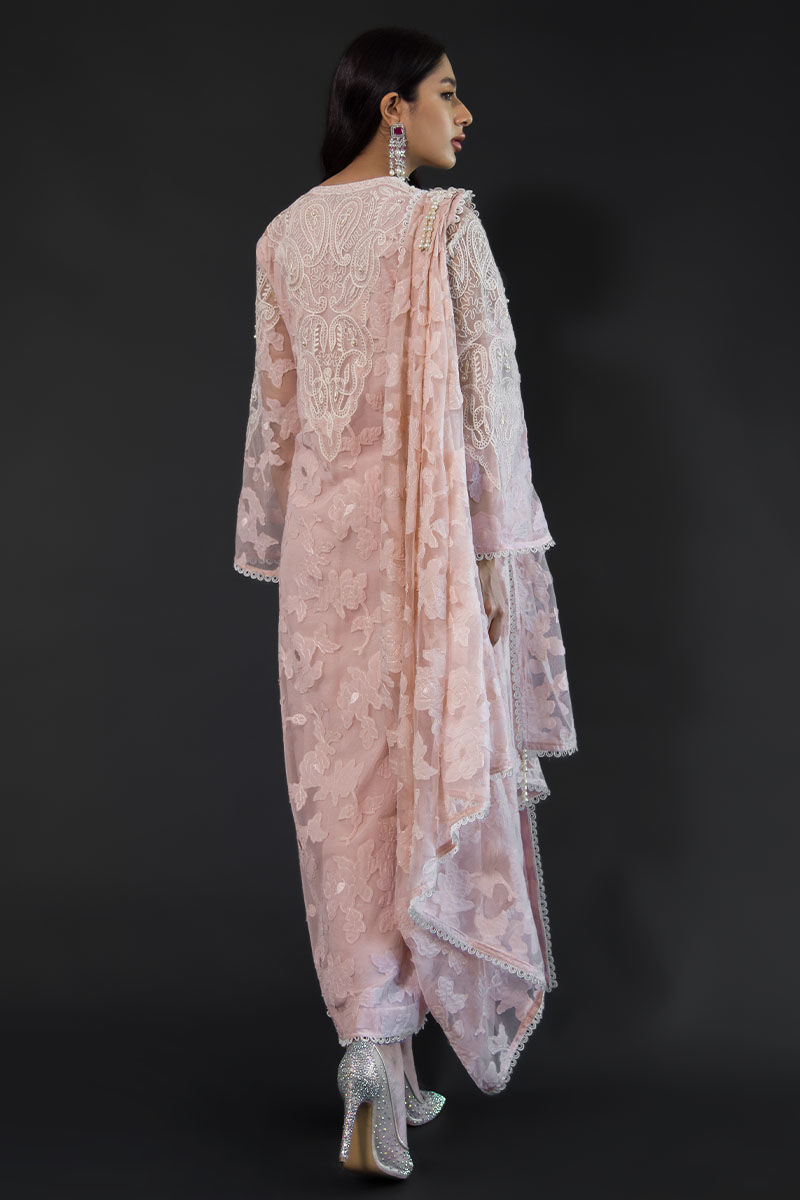 Emma has intricate embroidery and 3D floral work throughout, thread work embroidered on the front, back, neckline, and sleeves with pearl detailing, and loops and lace slits at the sleeves and daman. Straight cotton silk pants and a draped dupatta with a floral 3D broach on it and hand-made pearl tassels on the dupatta