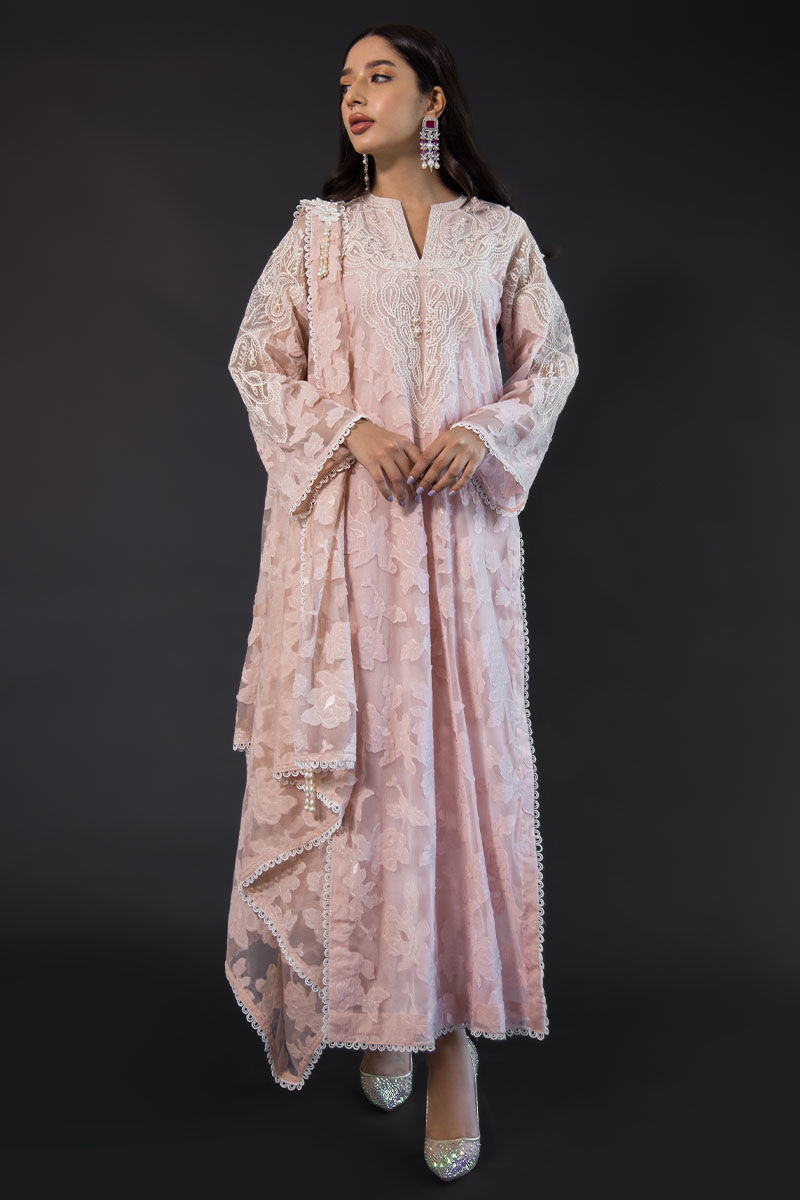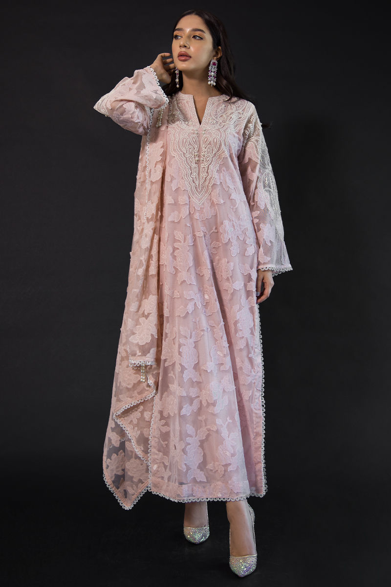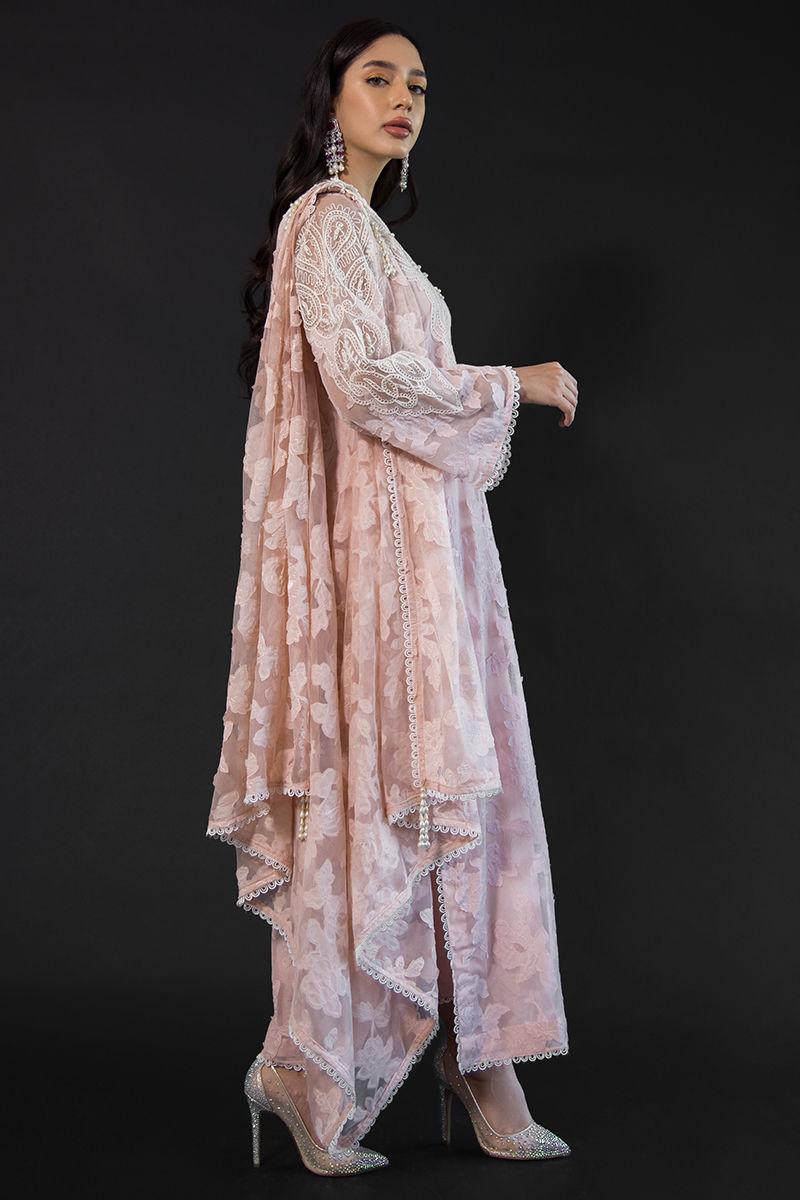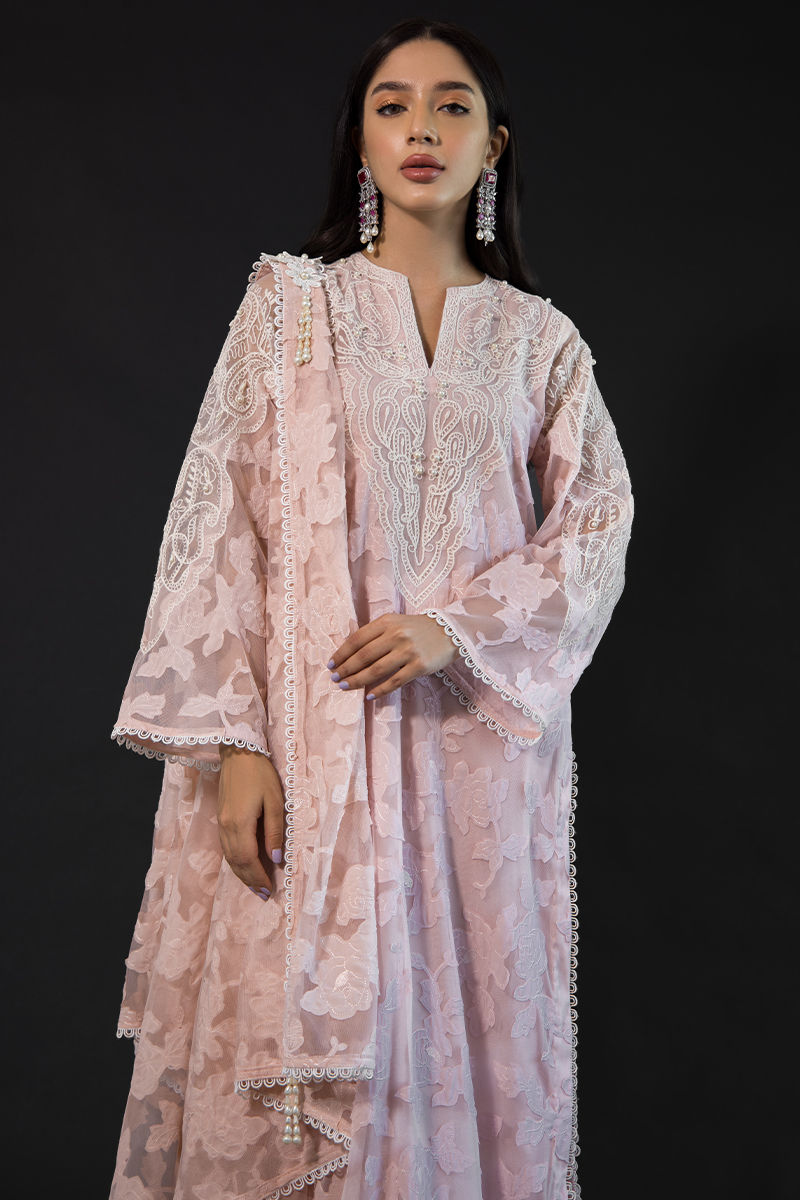 Emma has intricate embroidery and 3D floral work throughout, thread work embroidered on the front, back, neckline, and sleeves with pearl detailing, and loops and lace slits at the sleeves and daman. Straight cotton silk pants and a draped dupatta with a floral 3D broach on it and hand-made pearl tassels on the dupatta
