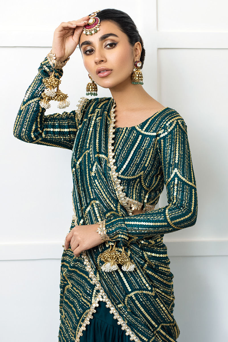 Statement net tiered lengha with pleats and pulled out thread detailing paired with a beautiful self embroidered and sequins worked choli with gold gota accents.The net lengha has cotton silk lining inside. Choli and dupatta with self embroidery and gold sequins work, with hand worked zardozi brooches at the back of the choli. The dupatta matches the choli and can be styled as shown in the picture, or any other way as well.