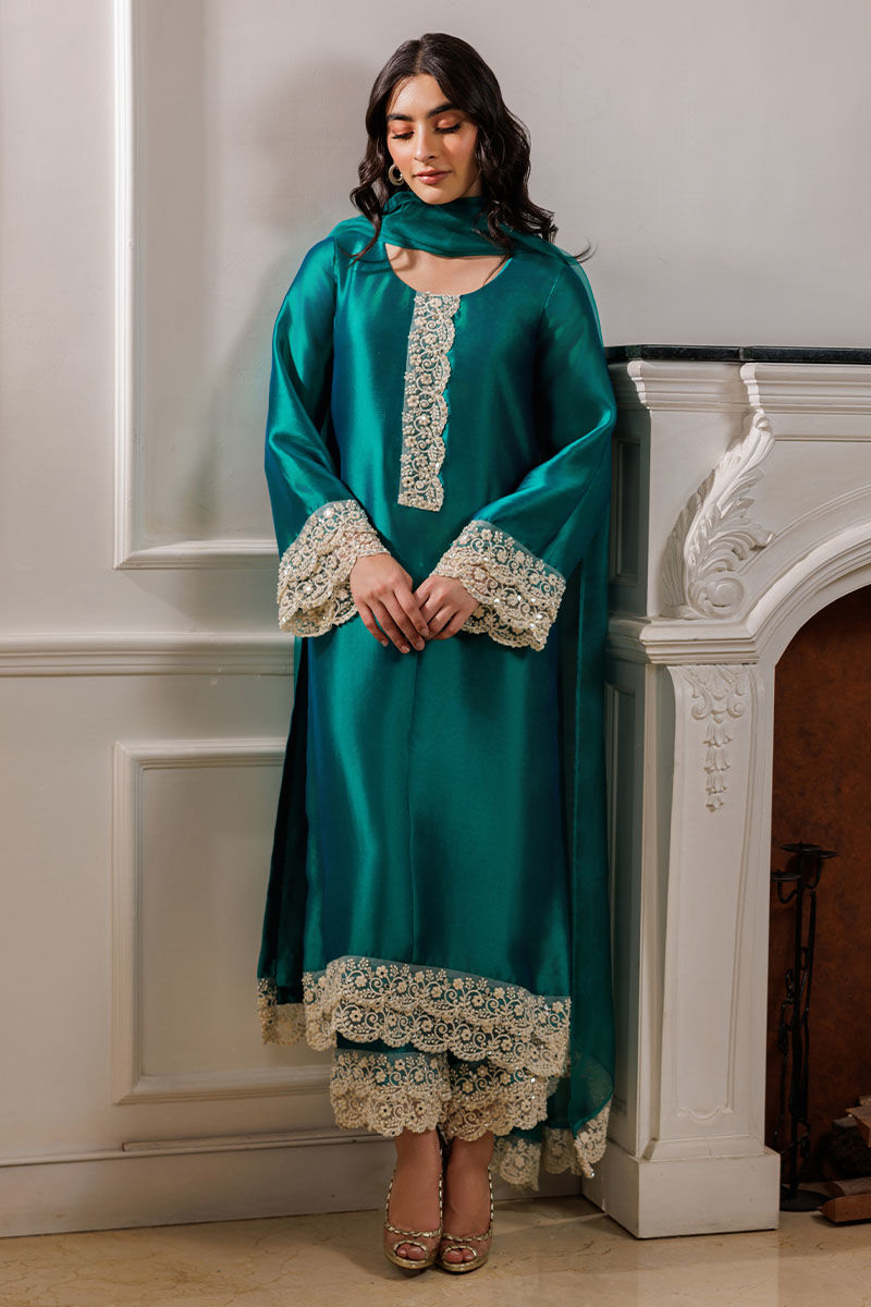 An elegant emerald green Sheesham silk shirt paired with matching culottes, featuring delicate pearl and threadwork embroidery. Intricately detailed borders adorn the neckline, sleeves, damaan, and pants, creating a refined and timeless look.