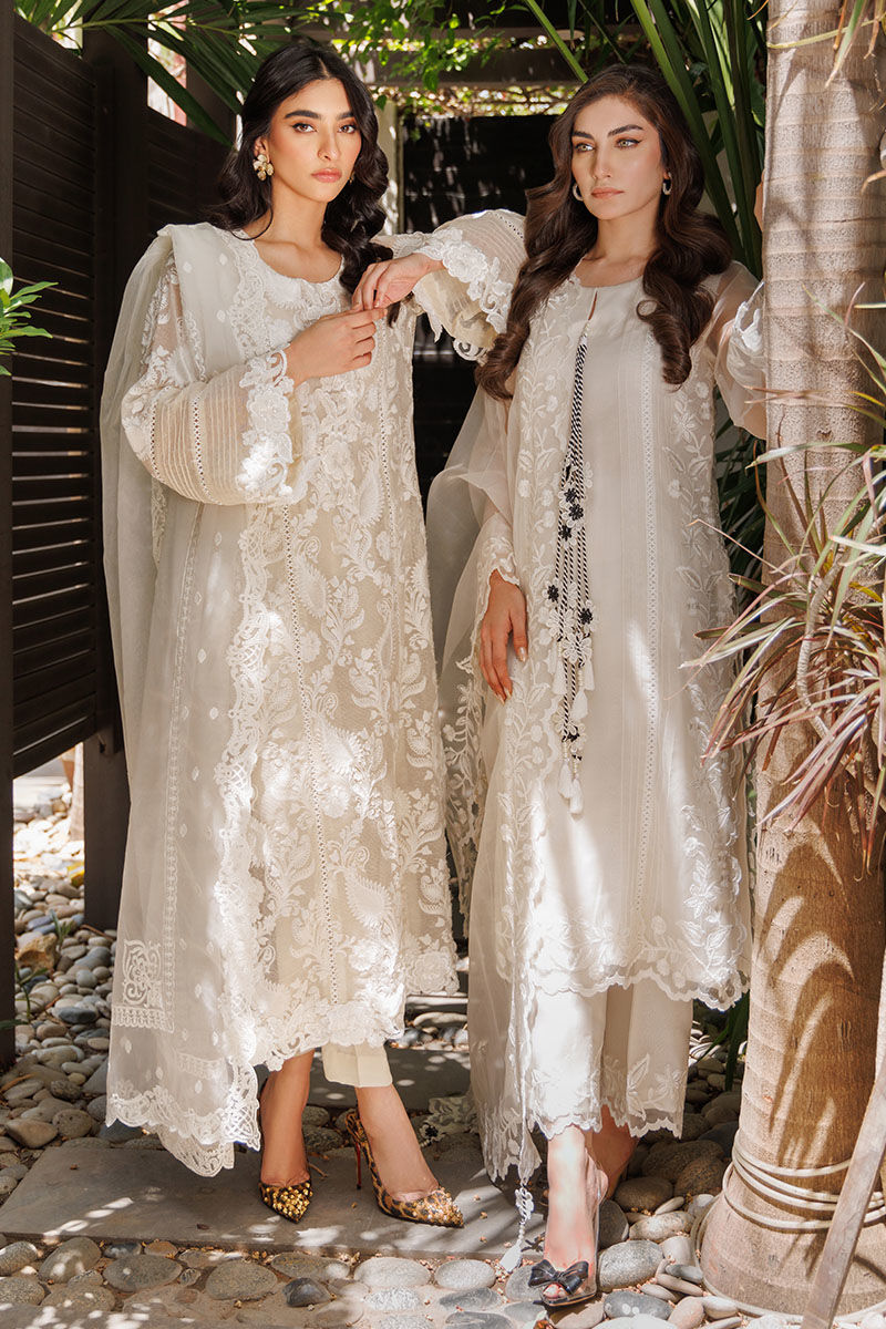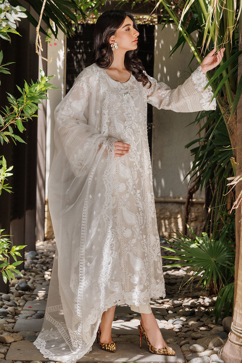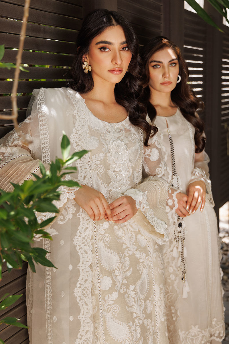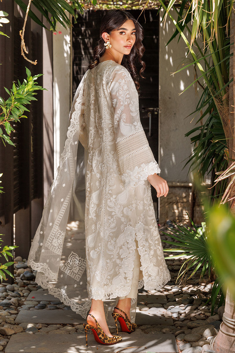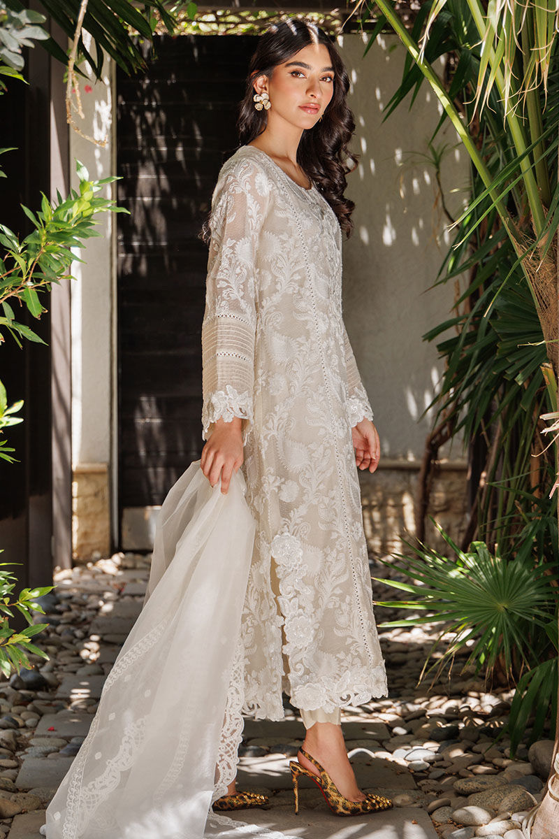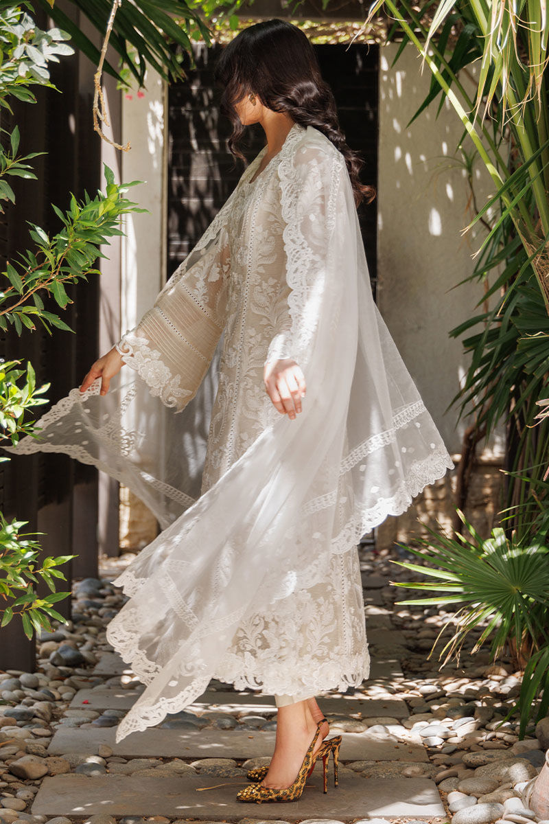 The garment is crafted from cotton net adorned with all-over embroidery and 3D cutwork lace, featuring the Daman and chaak sleeves embellished with pintucks and insert lace on the front and back.