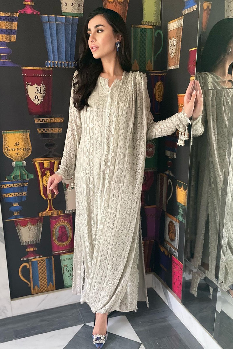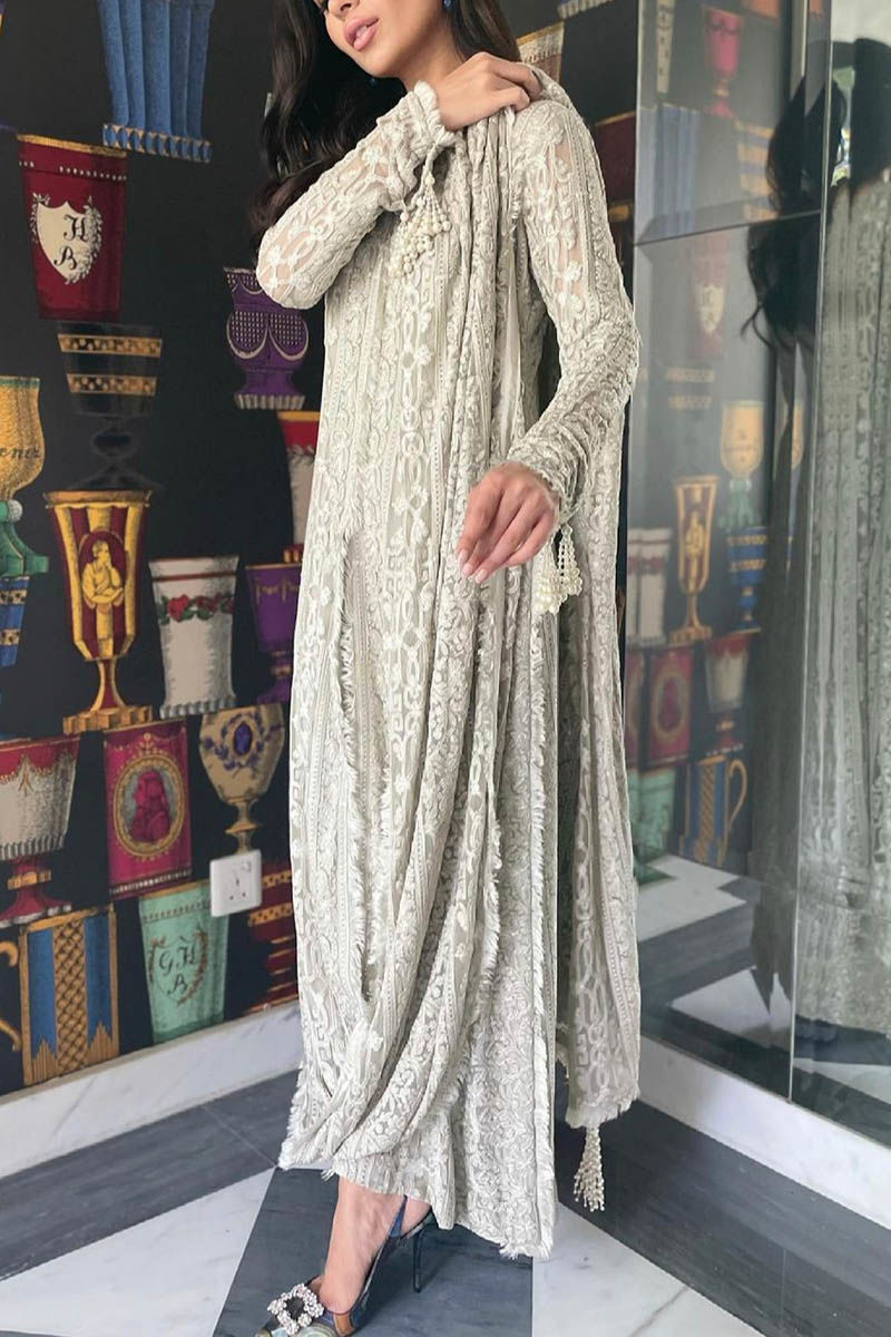 Color: Light Grey Fabric: Georgette Chiffon Work Details: Embroidery