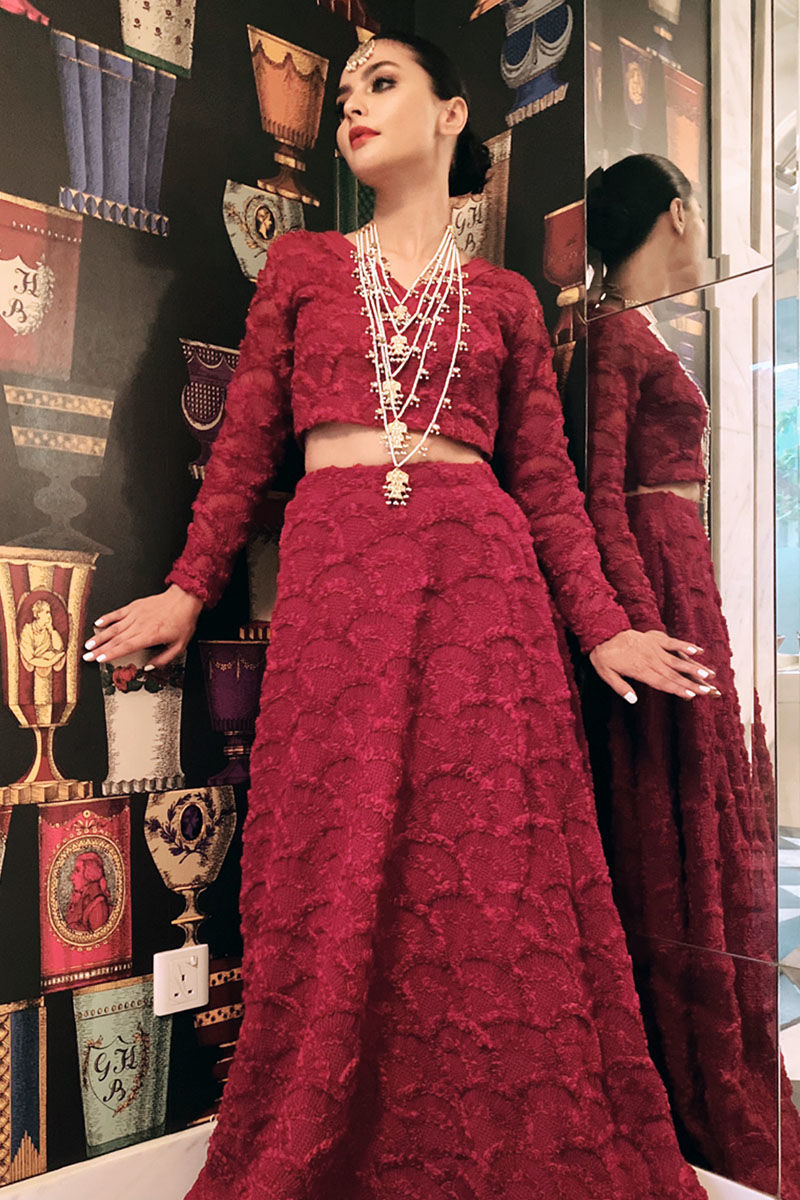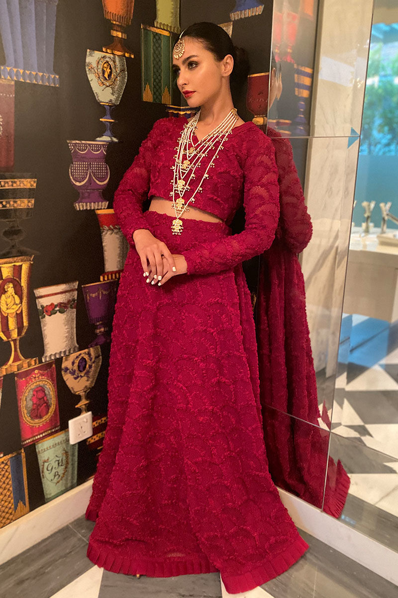 Deep red matching lengha choli with pleats detailing. Paired with same colour ruffled dupatta.