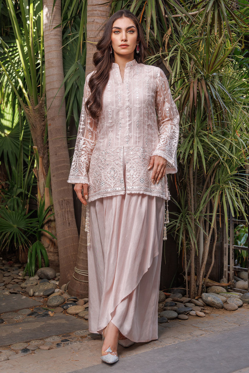 The ensemble includes a raw silk sarong with pleats in the front, paired with a shirt crafted from pure organza adorned with embroidery all over and hand-made pearl tassels on the sides.