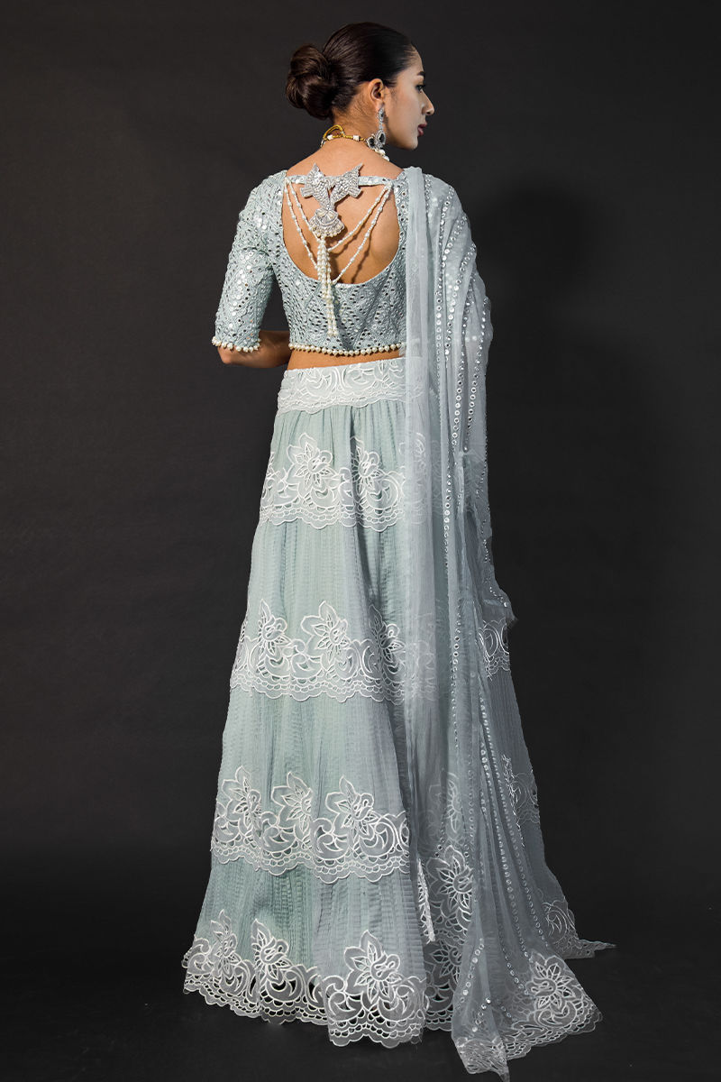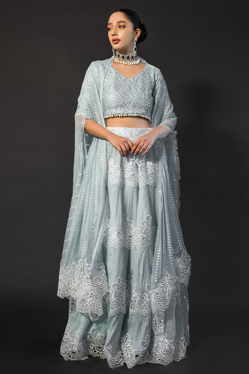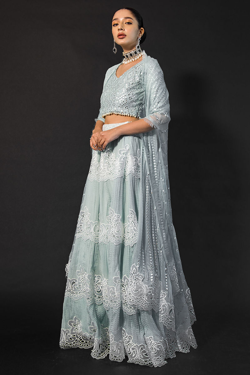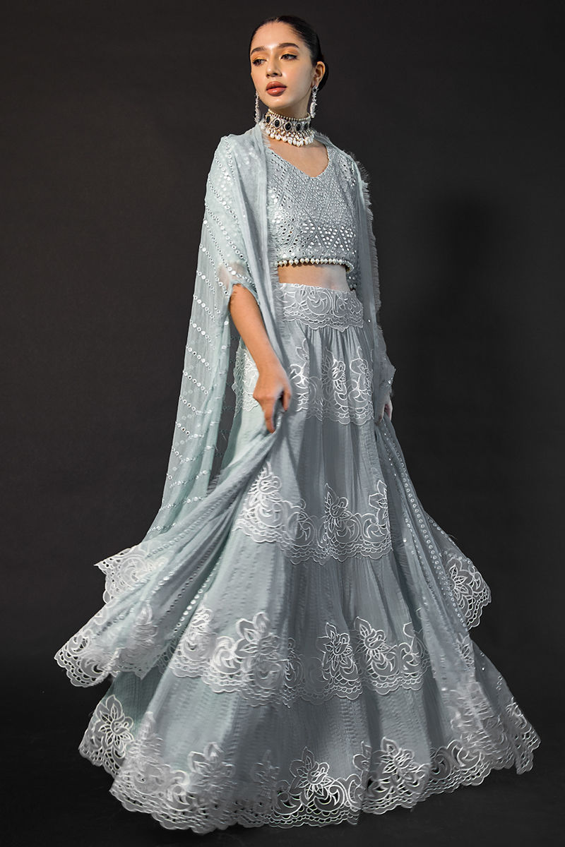 Winsome crush lengha and choli in an ice bluehue with delicate detailing. lengha with scalloped floral cutwork borders on crushed lengha with attached cotton silk lining and kankan, foil mirrored work Choli with pearl detailing on the choli and sleeves, with handmade zardozi brooches and pearl tassels. Cutwork floral border on the daman of the dupatta.