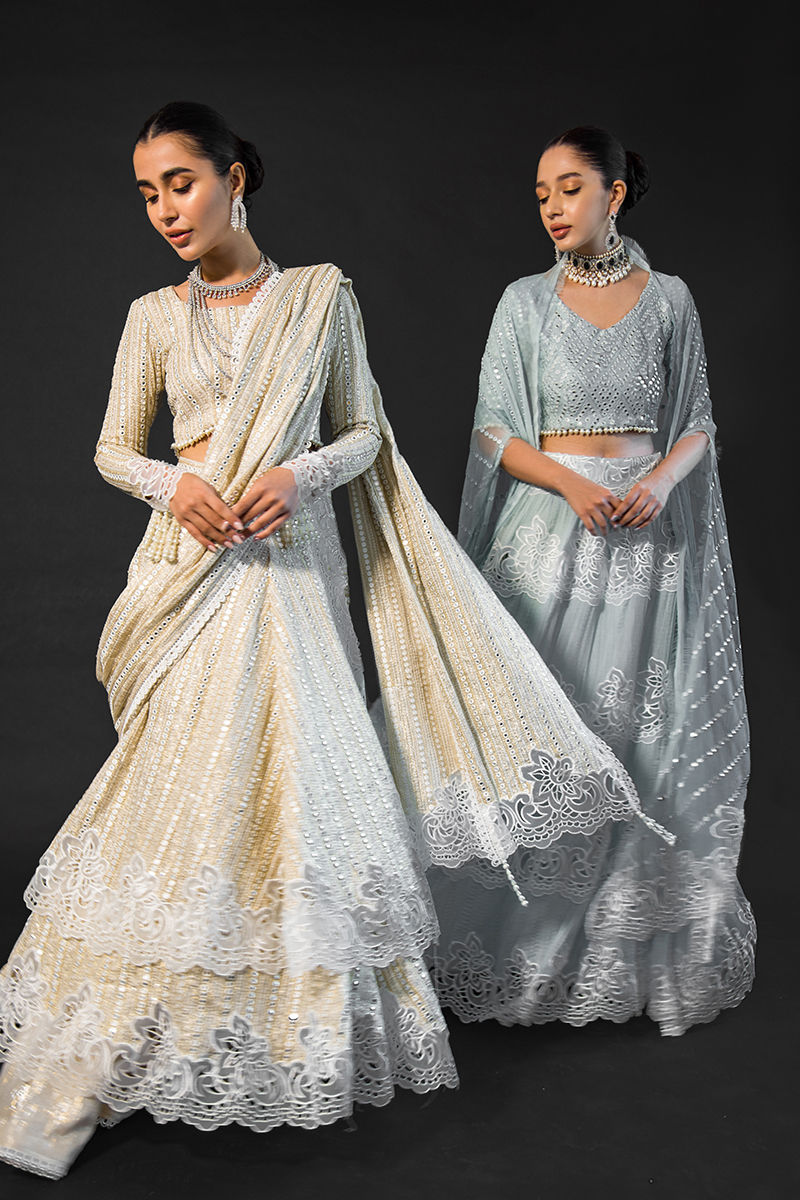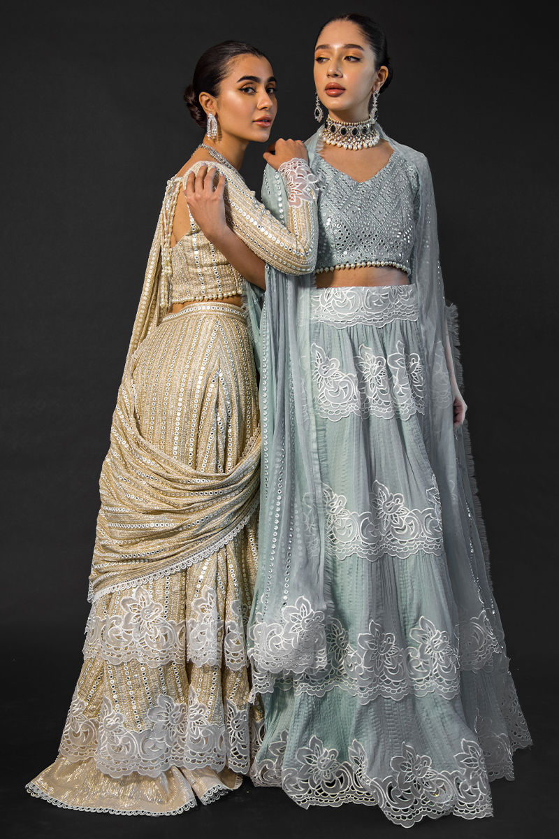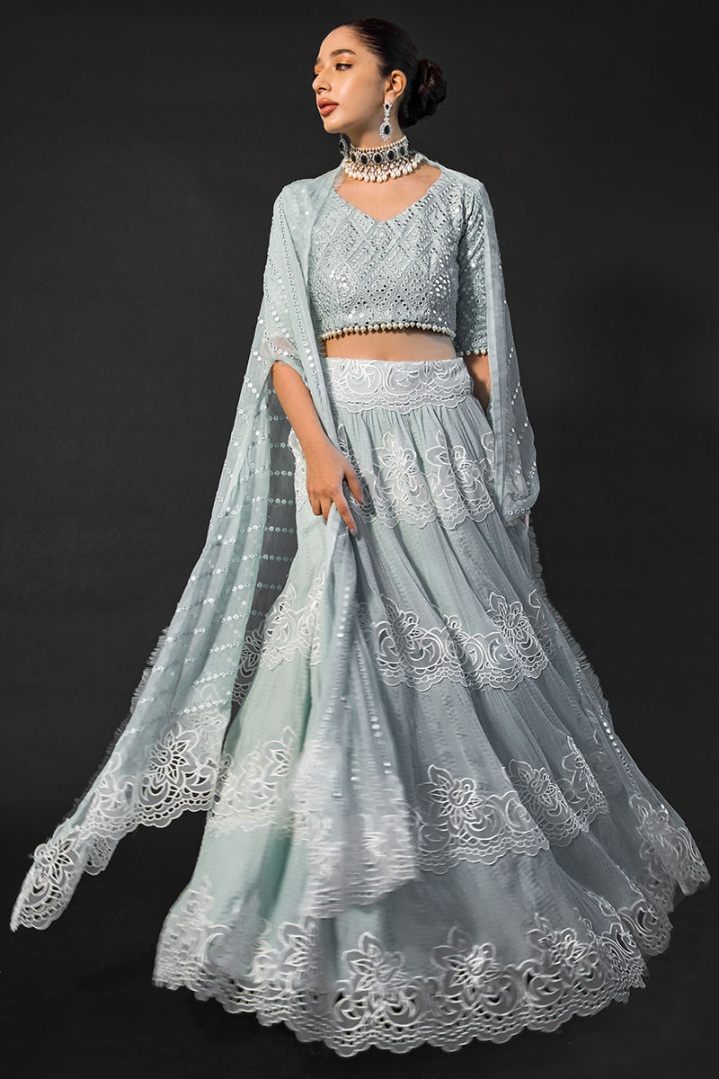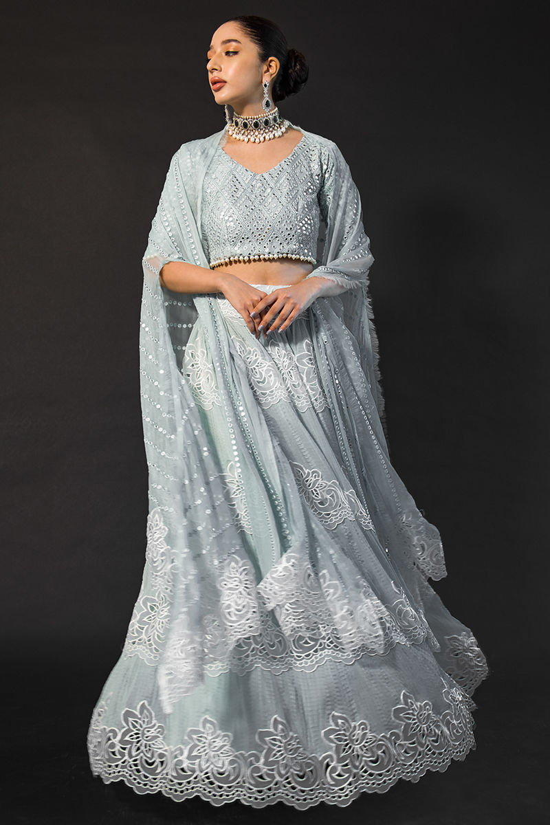 Winsome crush lengha and choli in an ice bluehue with delicate detailing. lengha with scalloped floral cutwork borders on crushed lengha with attached cotton silk lining and kankan, foil mirrored work Choli with pearl detailing on the choli and sleeves, with handmade zardozi brooches and pearl tassels. Cutwork floral border on the daman of the dupatta.