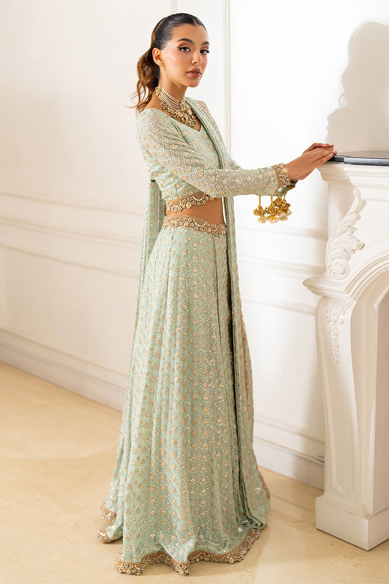 Radiate timeless elegance in this georgette chiffon lengha choli, featuring an attached draped dupatta with pearl and scalloped lace. Handmade tassels on the sleeves add a touch of artisanal charm to this stunning ensemble.