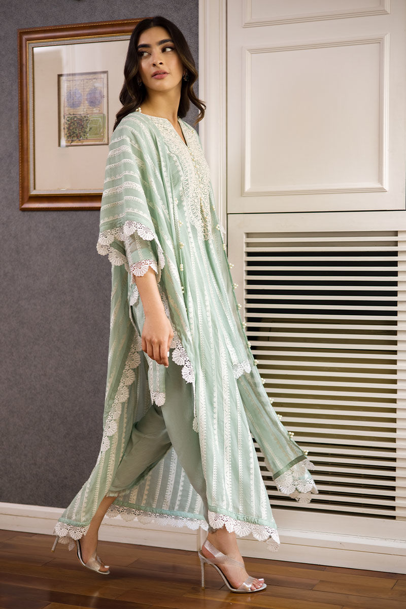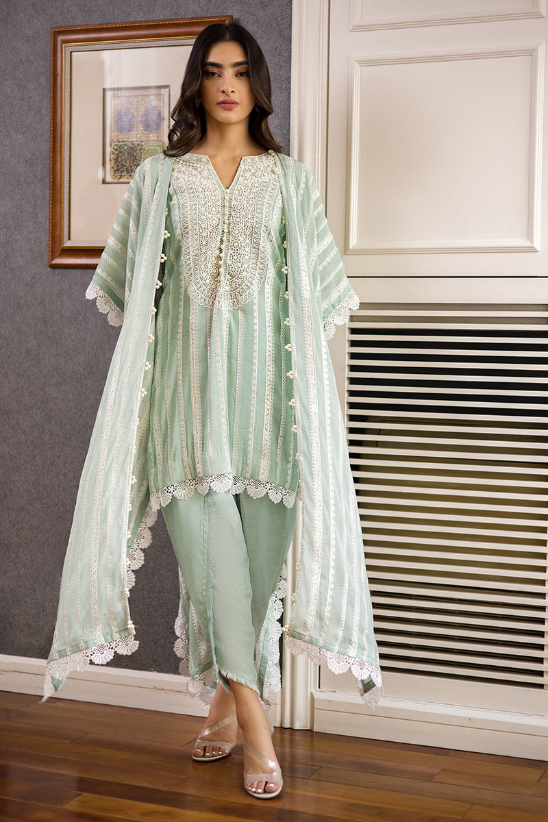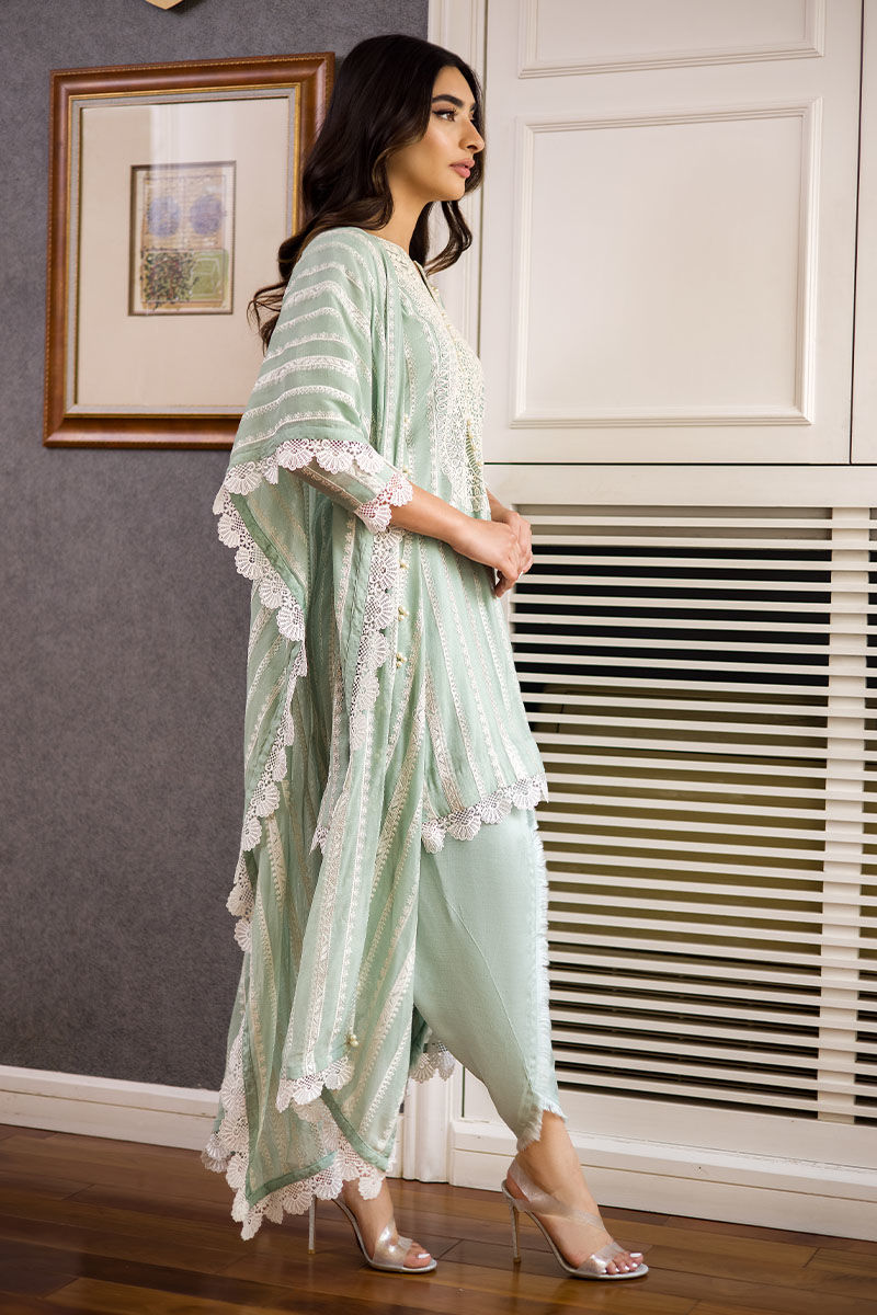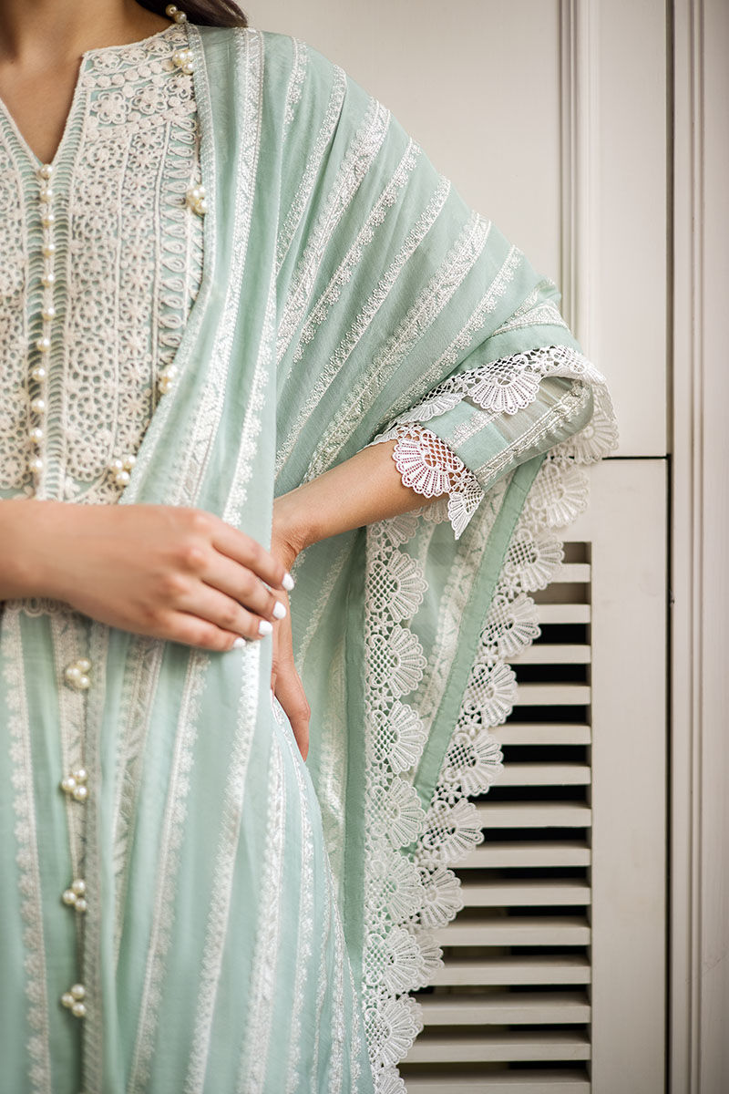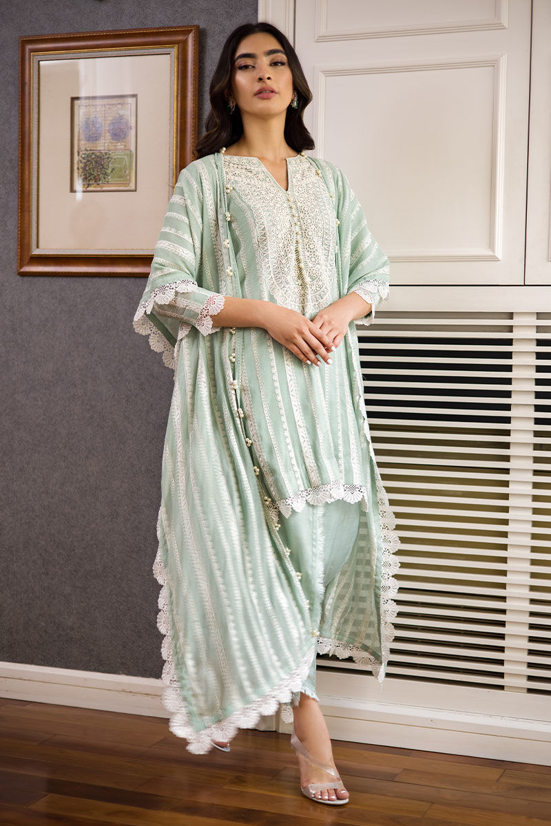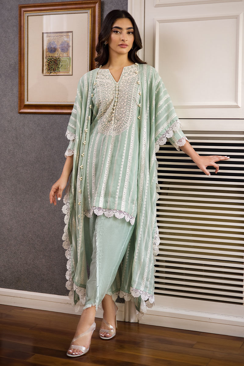 Introducing the breathtaking "Irma" ensemble, crafted with pure voil fabric and featuring exquisite thread embroidery on the shirt. The anchor thread work neckline adds a touch of sophistication to the garment, while the buttons provide a classic finishing touch. The cape embroidery Dupatta is a true work of art, not attached to the shirt and adorned with lace all over and pearl embellishments. Paired with a stunning tulip shalwar and Dupatta, this outfit exudes effortless elegance and grace. Experience the beauty of "Irma" and elevate your style game to new heights.