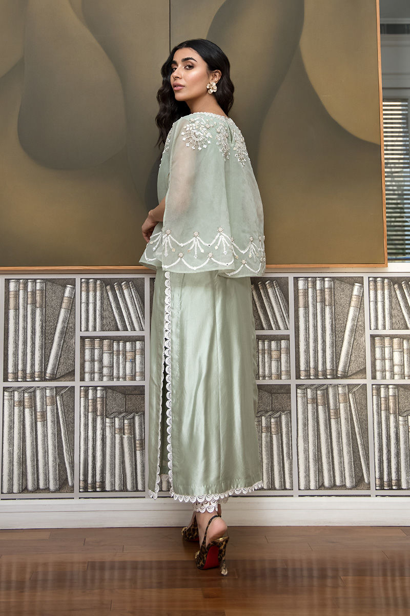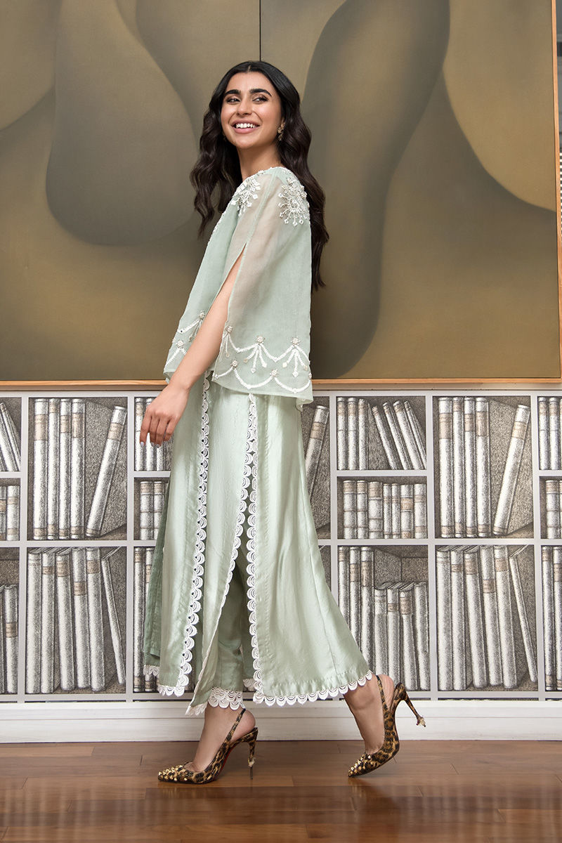 A regal mint green silk shirt with laces featured on the front and on the cigarette pants. Comes with attached lining and is accentuated with an intricately worked organza poncho with thread work and handmade beads embellishments.