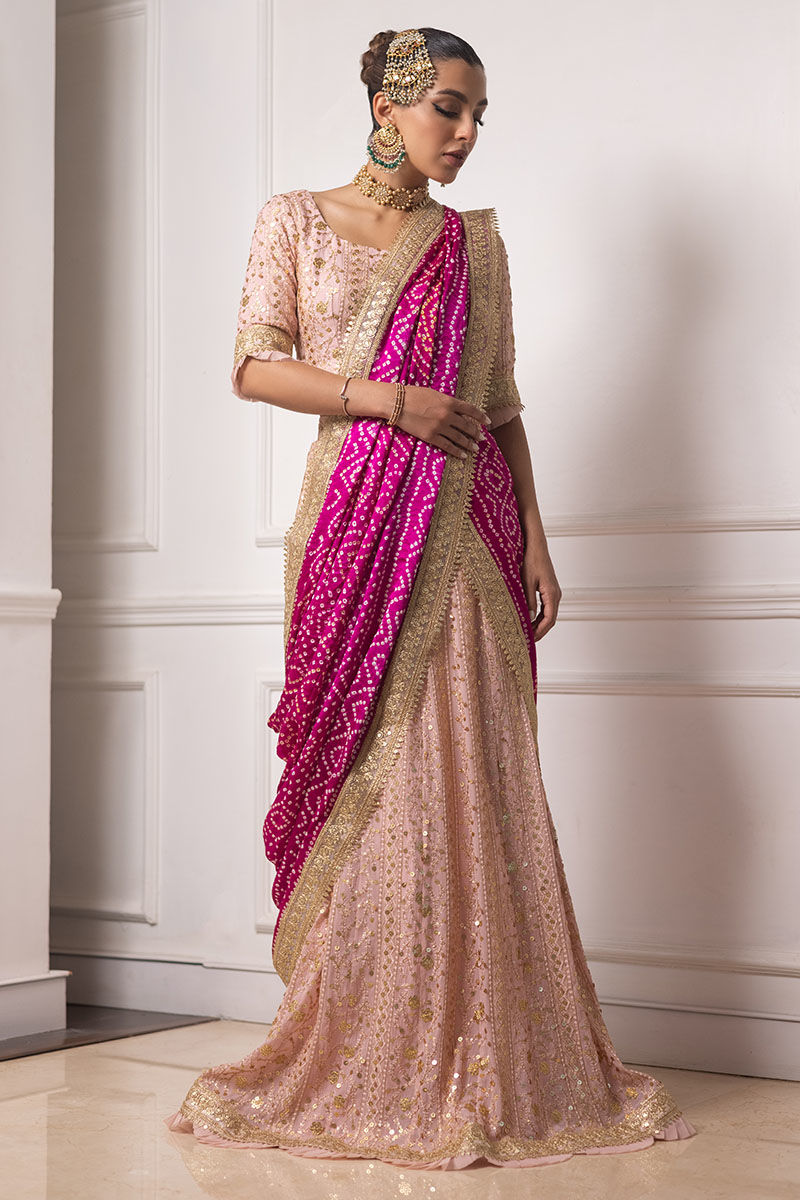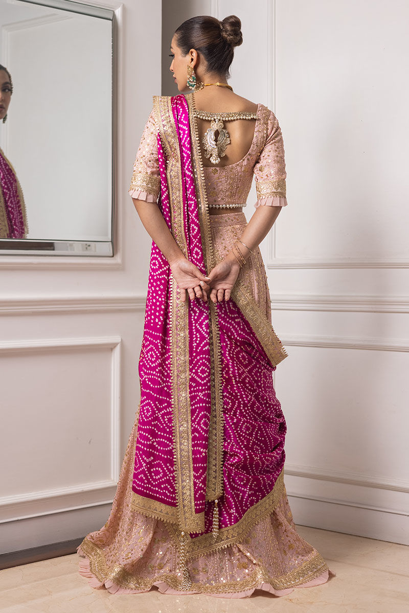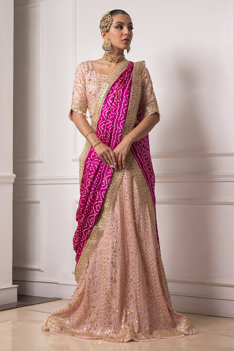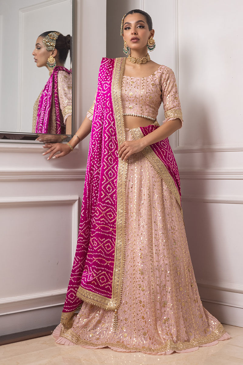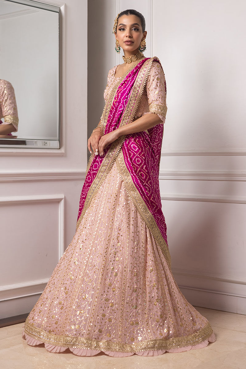 Embrace elegance in a pink georgette chiffon lengha choli adorned with intricate gold sequin work. The sleeves feature maroori borders with handmade scalloped pleats, while zardozi broaches embellished with pearls grace the back neckline. The lengha dazzles with gold maroori borders and scallop pleats at the hem, supported by cancan underneath. A pure silk magenta pink chunari dupatta completes the ensemble, enriched with gold maroori borders and delicate handmade tassels. This ensemble strikes a perfect balance between sophistication and drama.