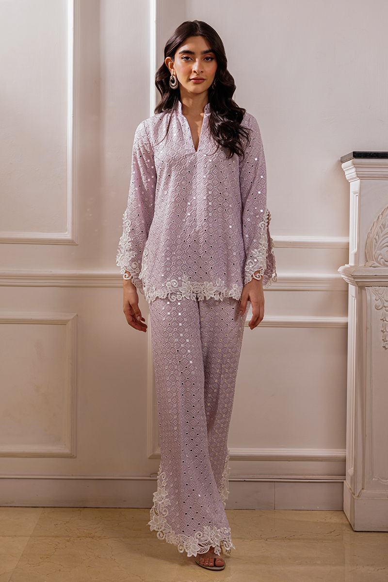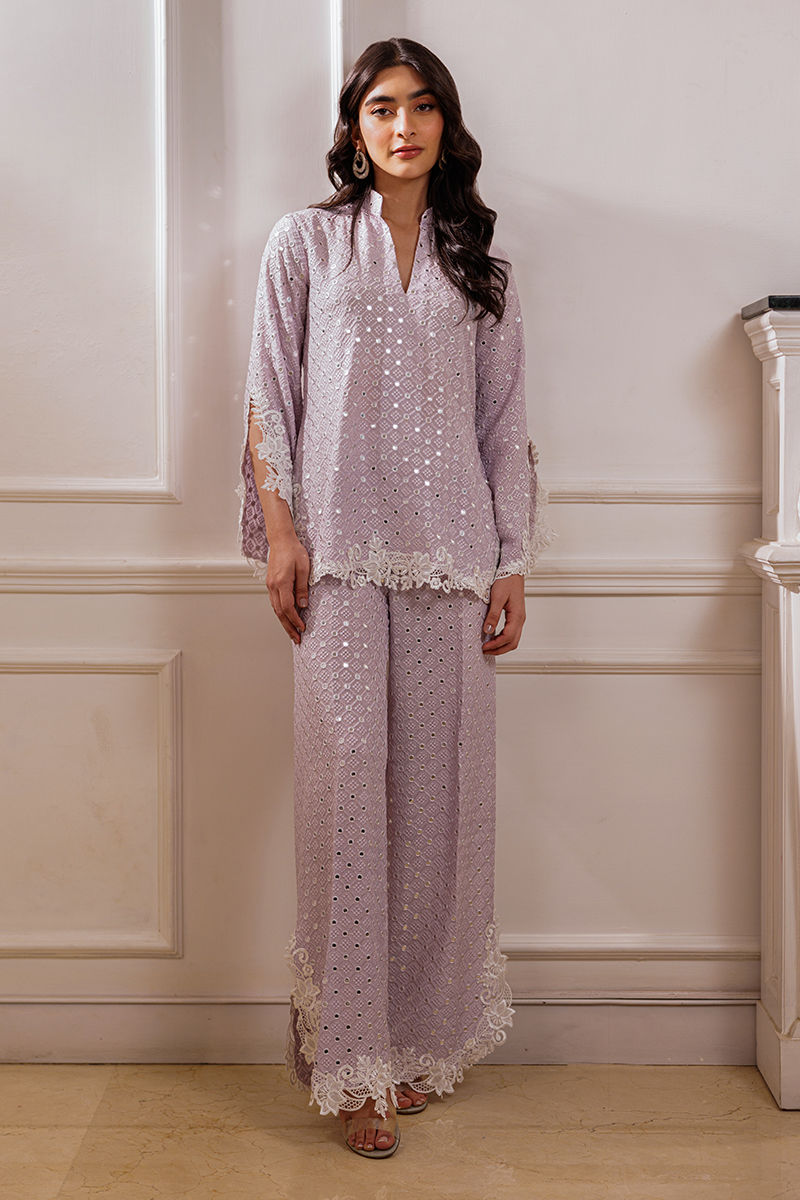 The Kelly separates feature a silk fabric adorned with foil and thread work, enhanced by appliqué cutwork and 3D detailing on the daman and sleeves. Paired with matching pants, this ensemble creates a refined, elegant look.