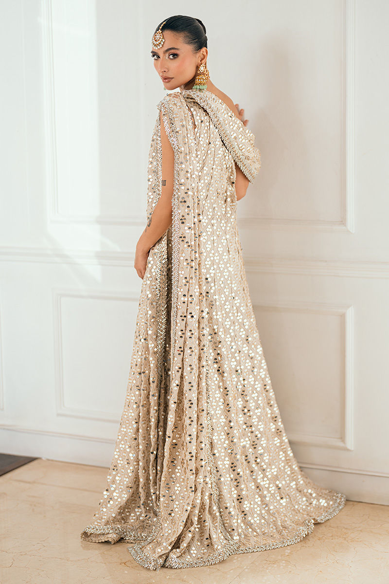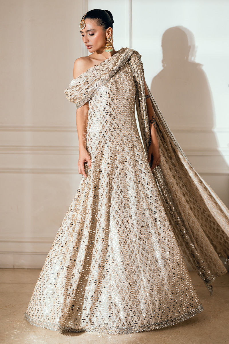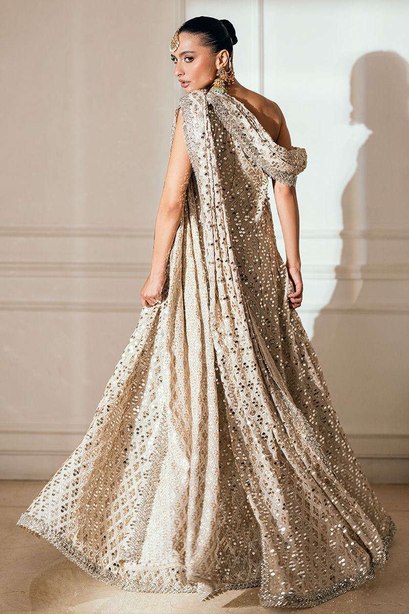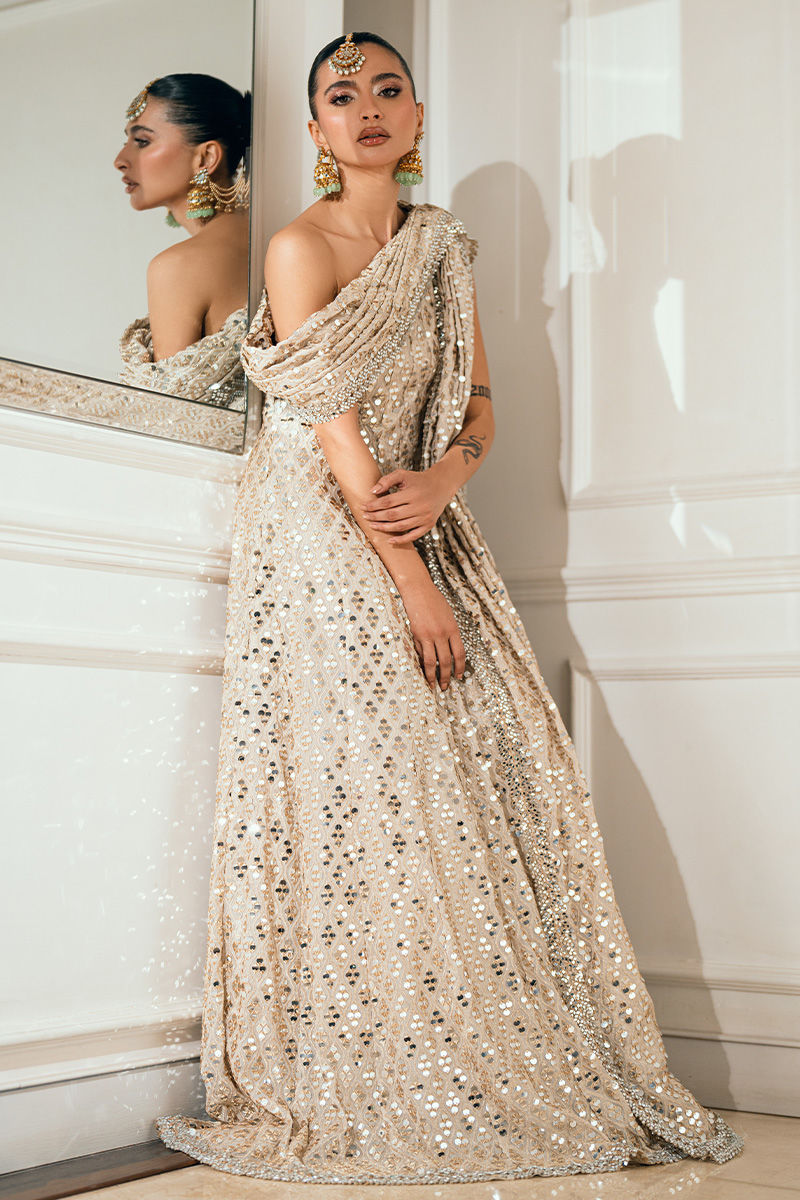 Laleh is a graceful chiffon peshwas adorned with intricate thread zara embroidery and foil work all over, complemented by a mirror-worked border on the damaan and dupatta. The dupatta is attached to the shirt, creating a seamless and elegant silhouette that exudes sophistication.