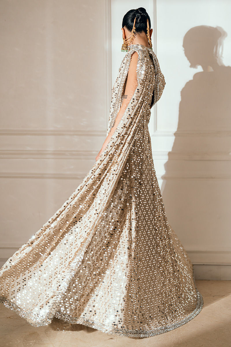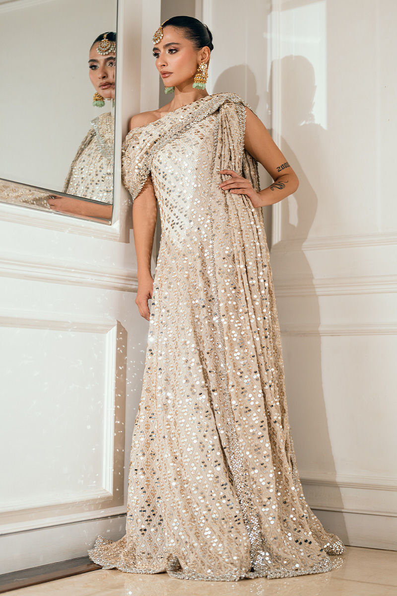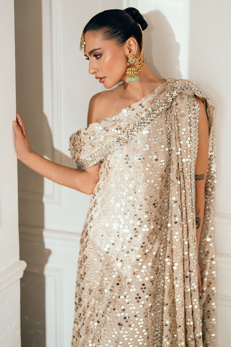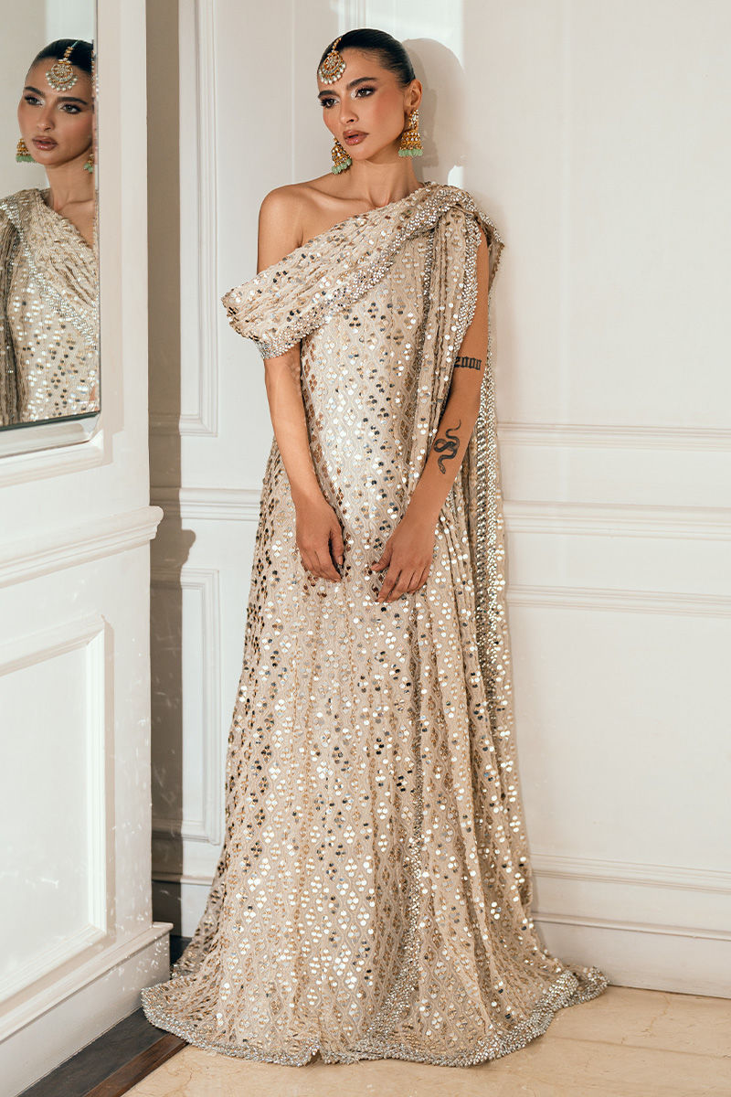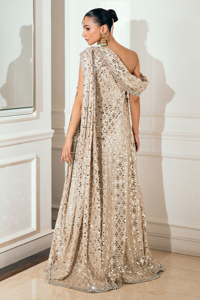 Laleh is a graceful chiffon peshwas adorned with intricate thread zara embroidery and foil work all over, complemented by a mirror-worked border on the damaan and dupatta. The dupatta is attached to the shirt, creating a seamless and elegant silhouette that exudes sophistication.