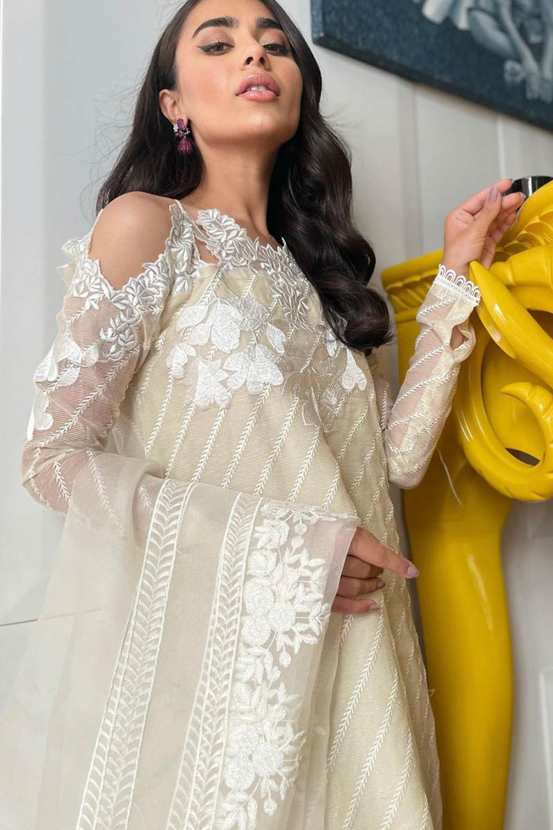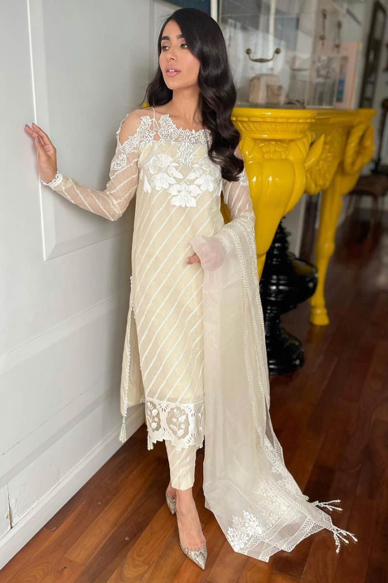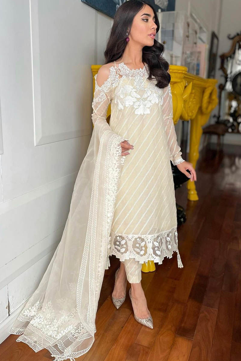 Cut out fully machine embroidered shirt with floral accents on neckline and a beautiful border with tassels, and matching cigarette pants. Pure organza dupatta with embroidery and tassels.