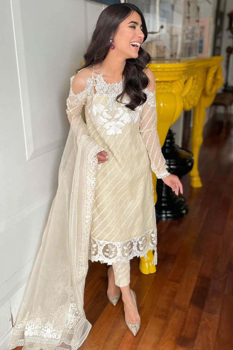 Color: Ivory Fabric: Cotton Karandi Net Work Details: Embellished