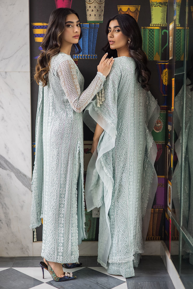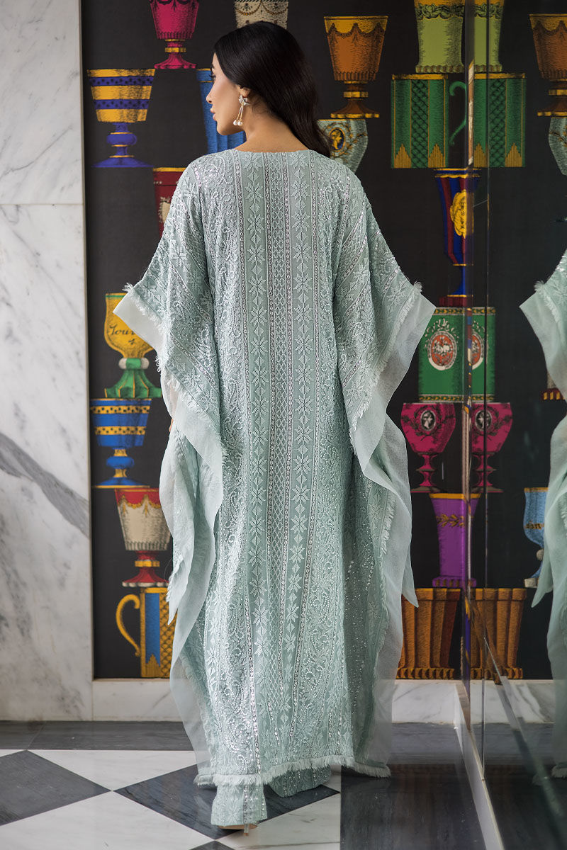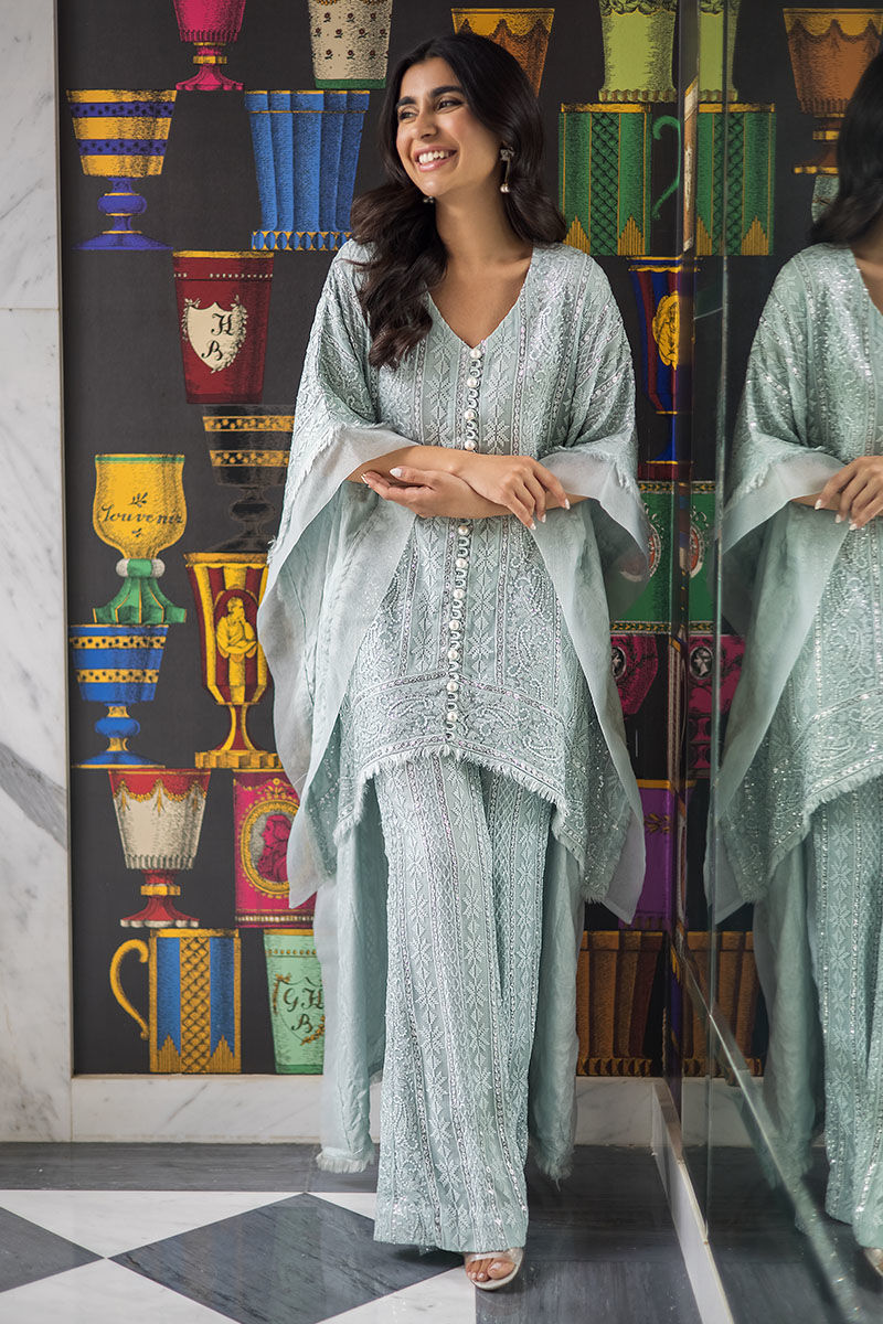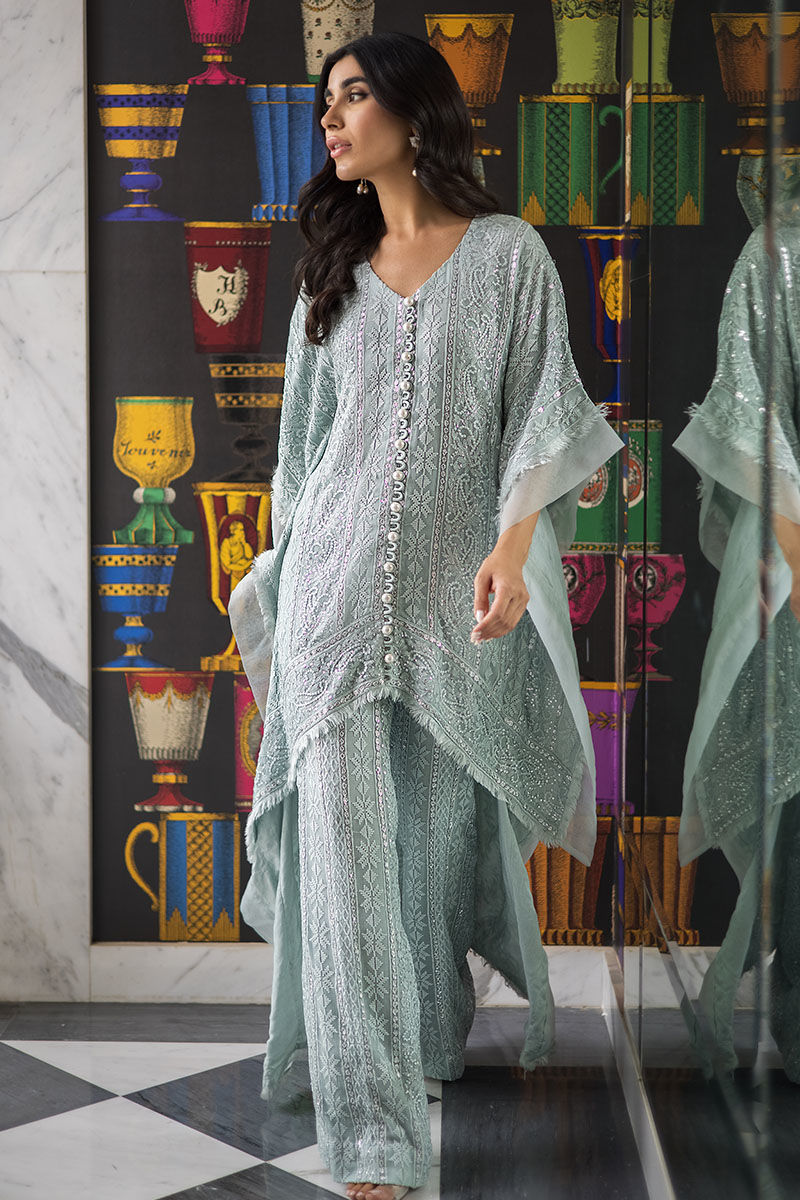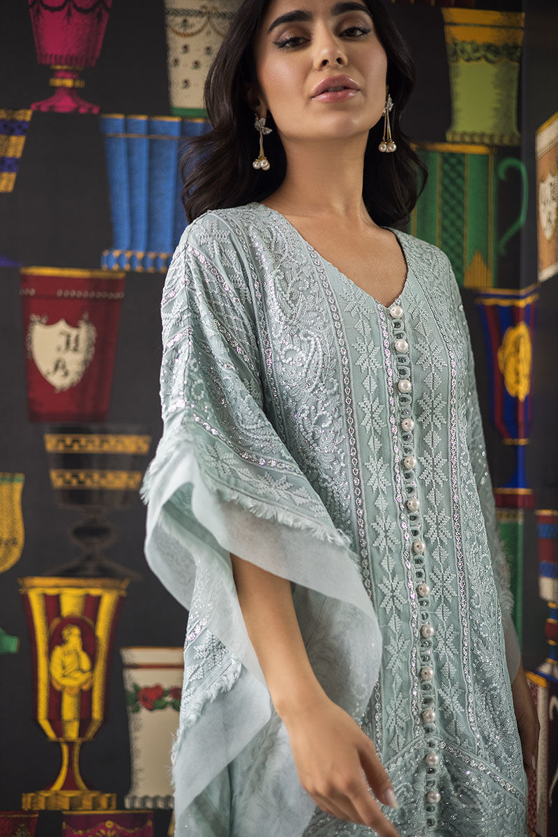 Maha high low with Poncho cut sleeves with organza edgings with handmade thread bail all over. Georgette chiffon with self-embroidery and sequence work on it with handmade loops on the neckline with pearls on it and matching self-embroidery pants with it