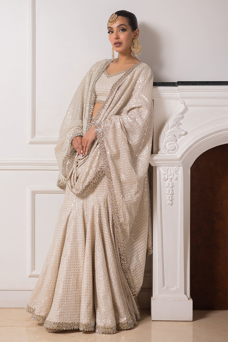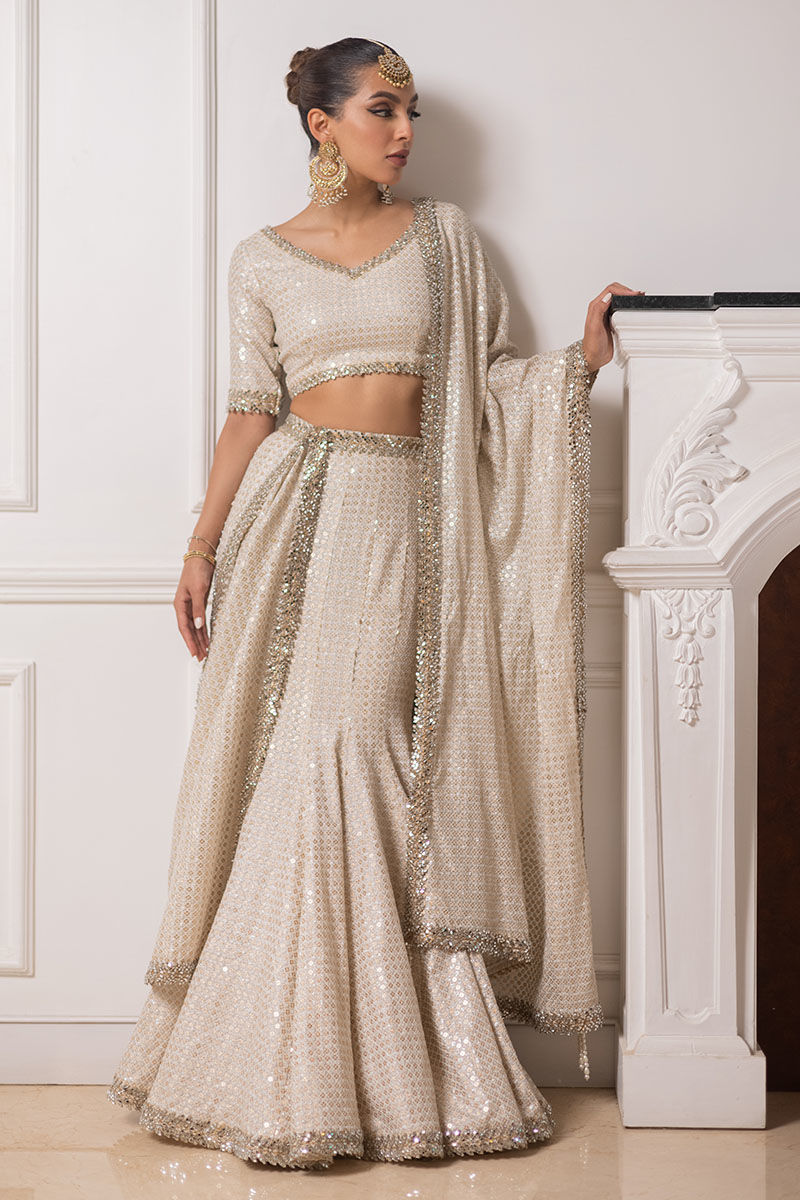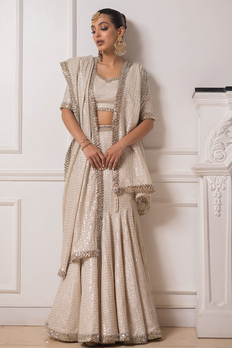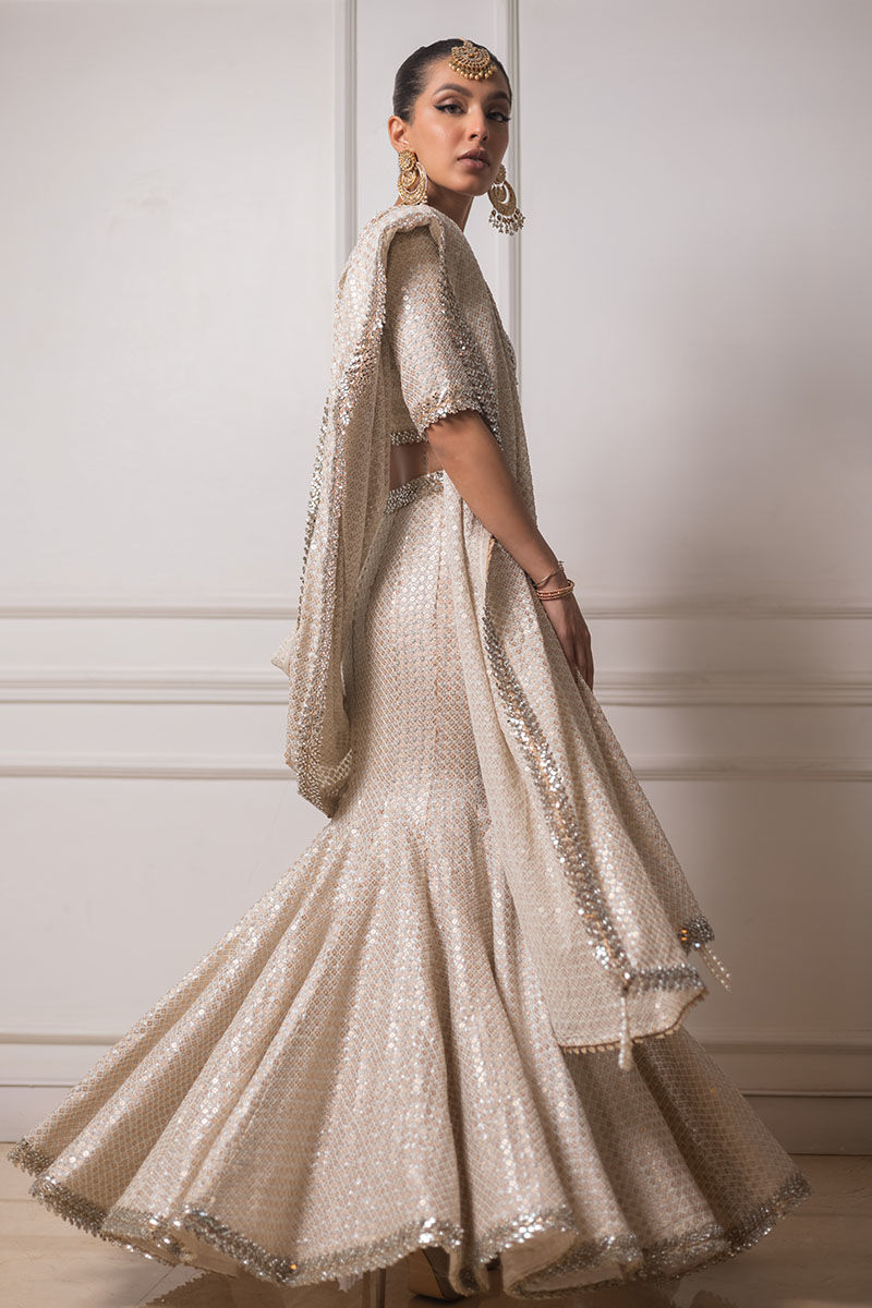 Drape yourself in pristine elegance with a white lehenga choli embellished entirely with exquisite sequin work. Mirror work borders adorn the choli, lehenga, and dupatta, adding a touch of opulence. Handmade pearl tassels, a zardozi, and stone broach accentuate the choli's back. The fitted lehenga features kalis and a striking mirror work border at the hem, creating a mesmerizing ensemble that balances sophistication with flair.