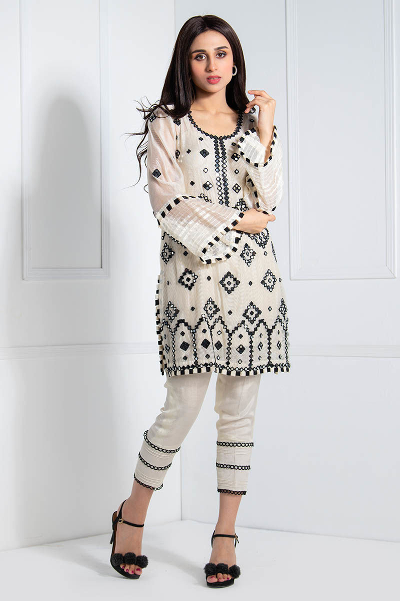 Pure cotton net with mirror work and thread and square tukris, paired with cotton silk pants.