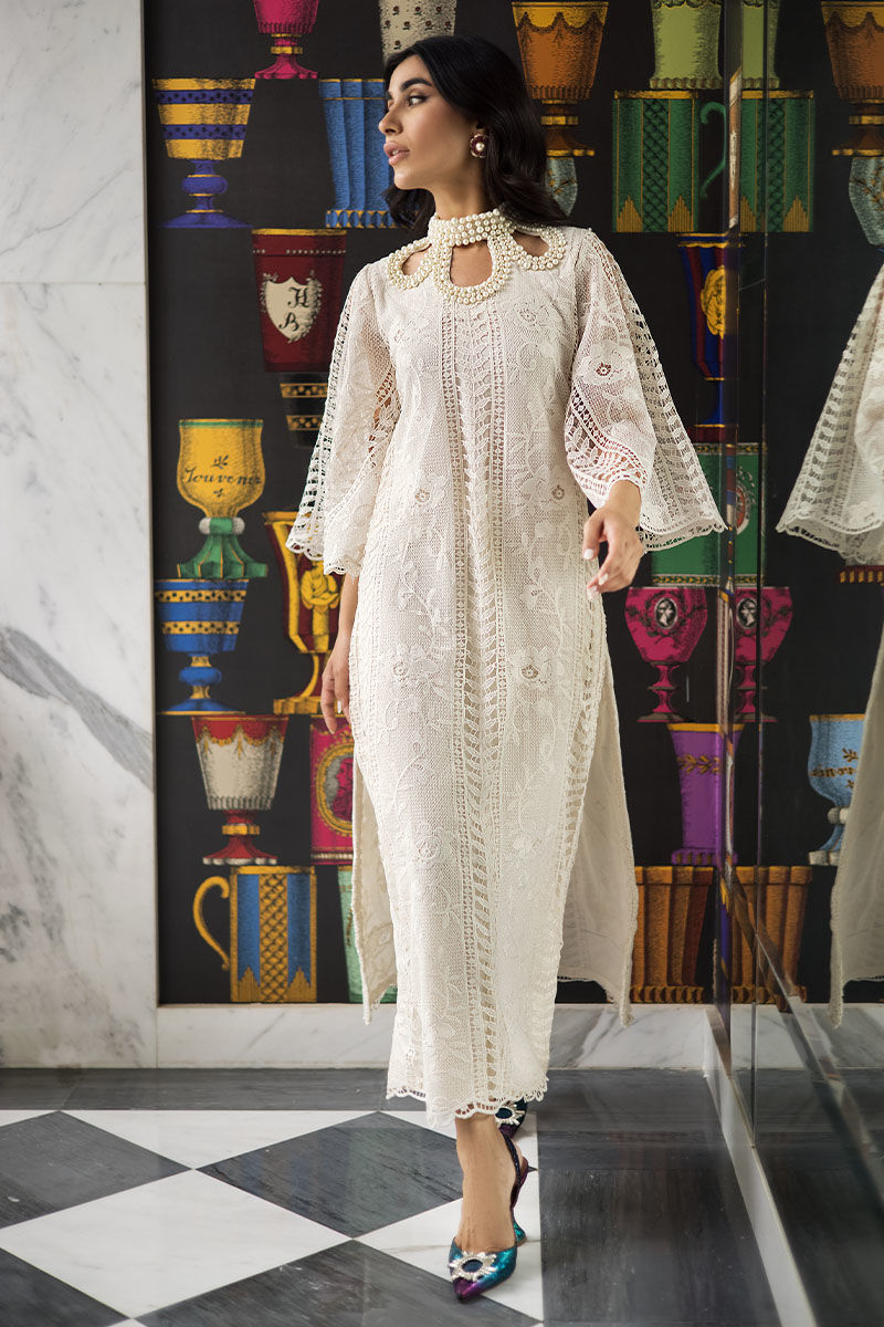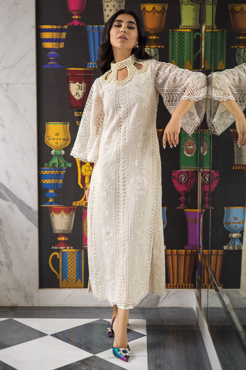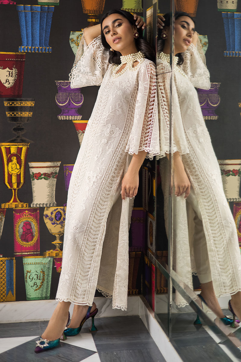 A resplendent ensemble showcasing sublime craftsmanship represented in threads of genuine pieces of art. Maya is an Ivory lace cutwork shirt with handmade pearl embellishments on the neckline with cotton silk pants and Baloon sleeves. This is truly an exquisite ensemble that oozes regality.