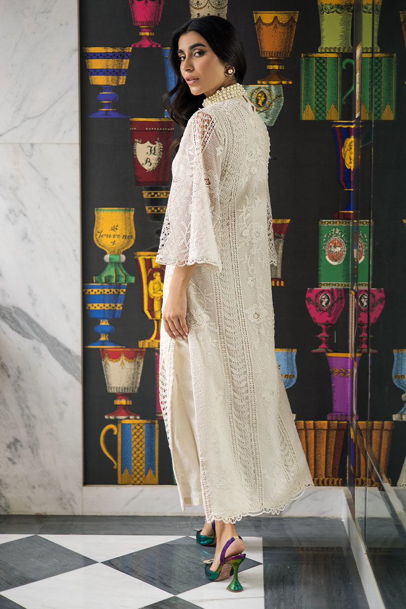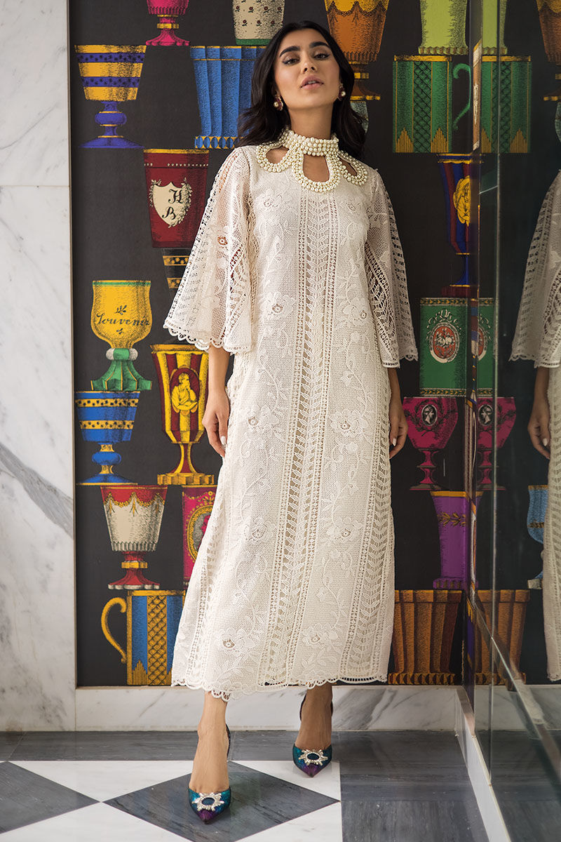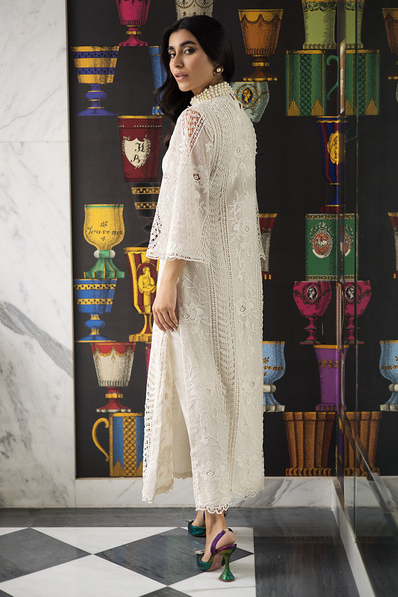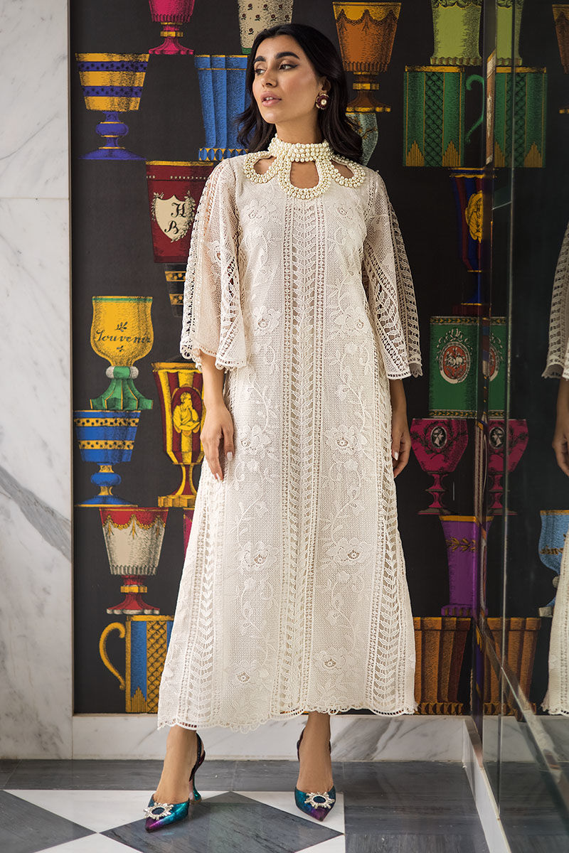 A resplendent ensemble showcasing sublime craftsmanship represented in threads of genuine pieces of art. Maya is an Ivory lace cutwork shirt with handmade pearl embellishments on the neckline with cotton silk pants and Baloon sleeves. This is truly an exquisite ensemble that oozes regality.