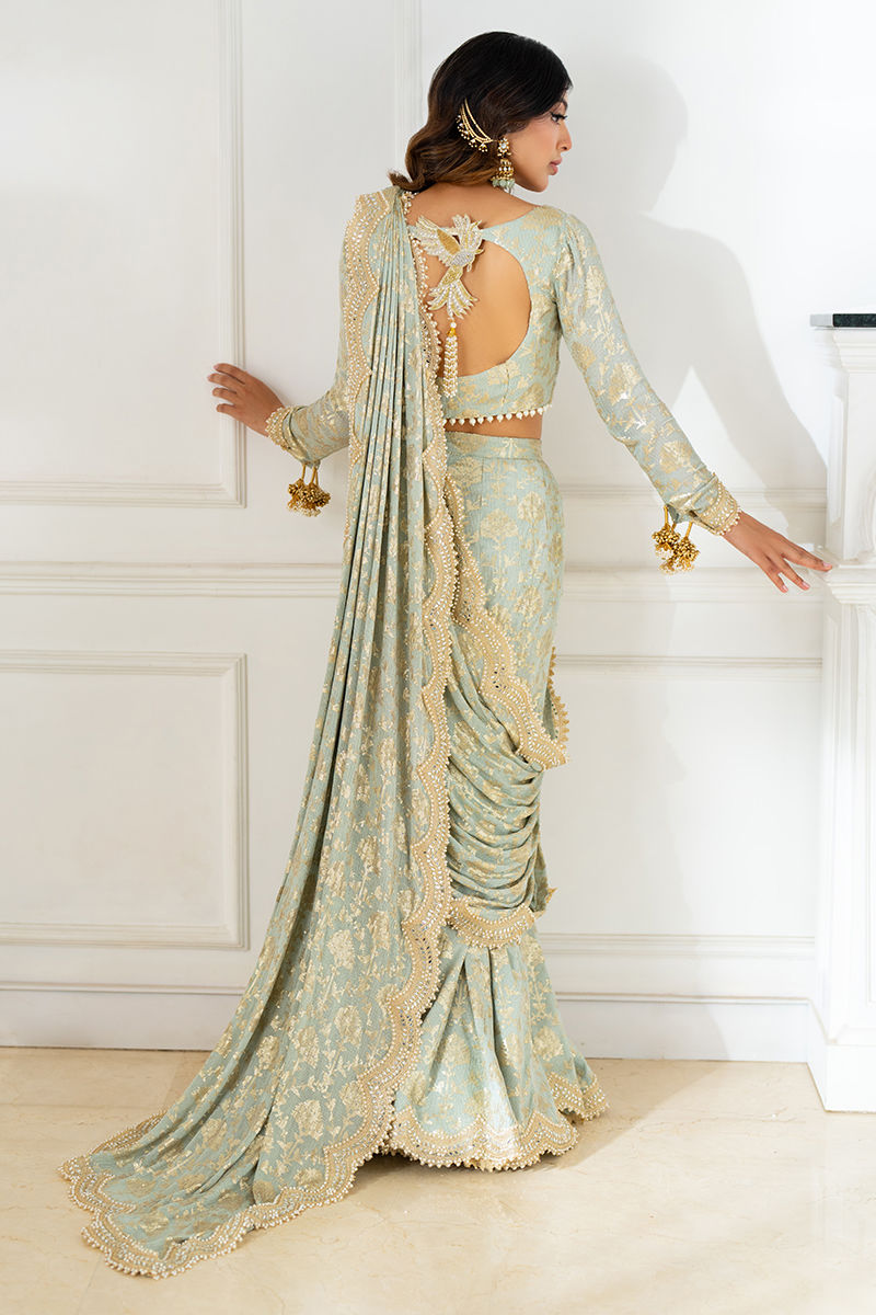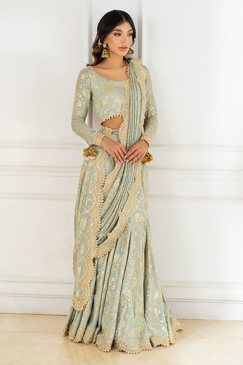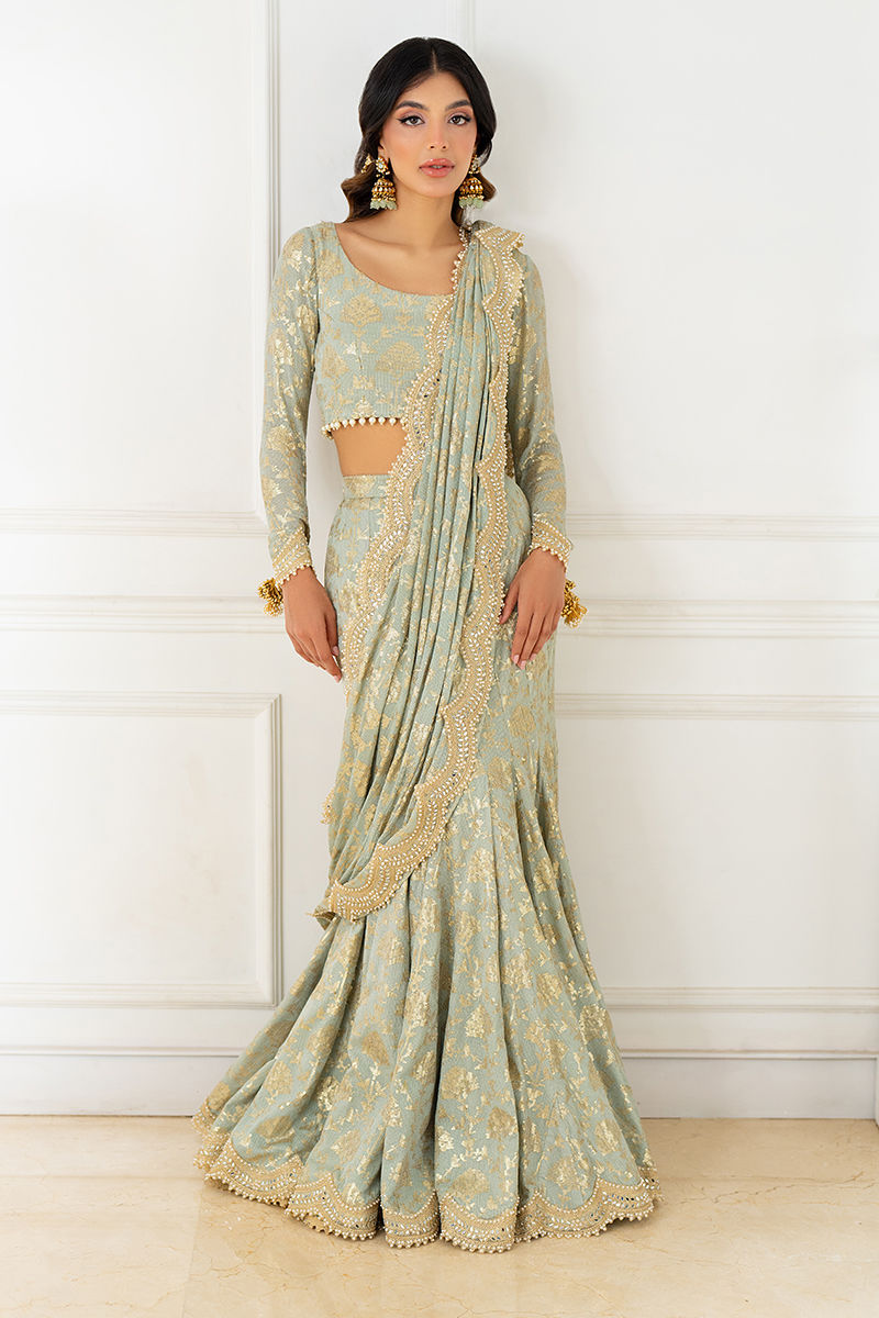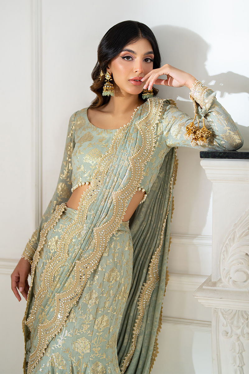 Color: Green Fabric: Gorgette Chiffon Work Details: Zardozi, Pearl And Tassels