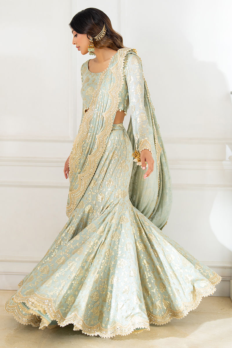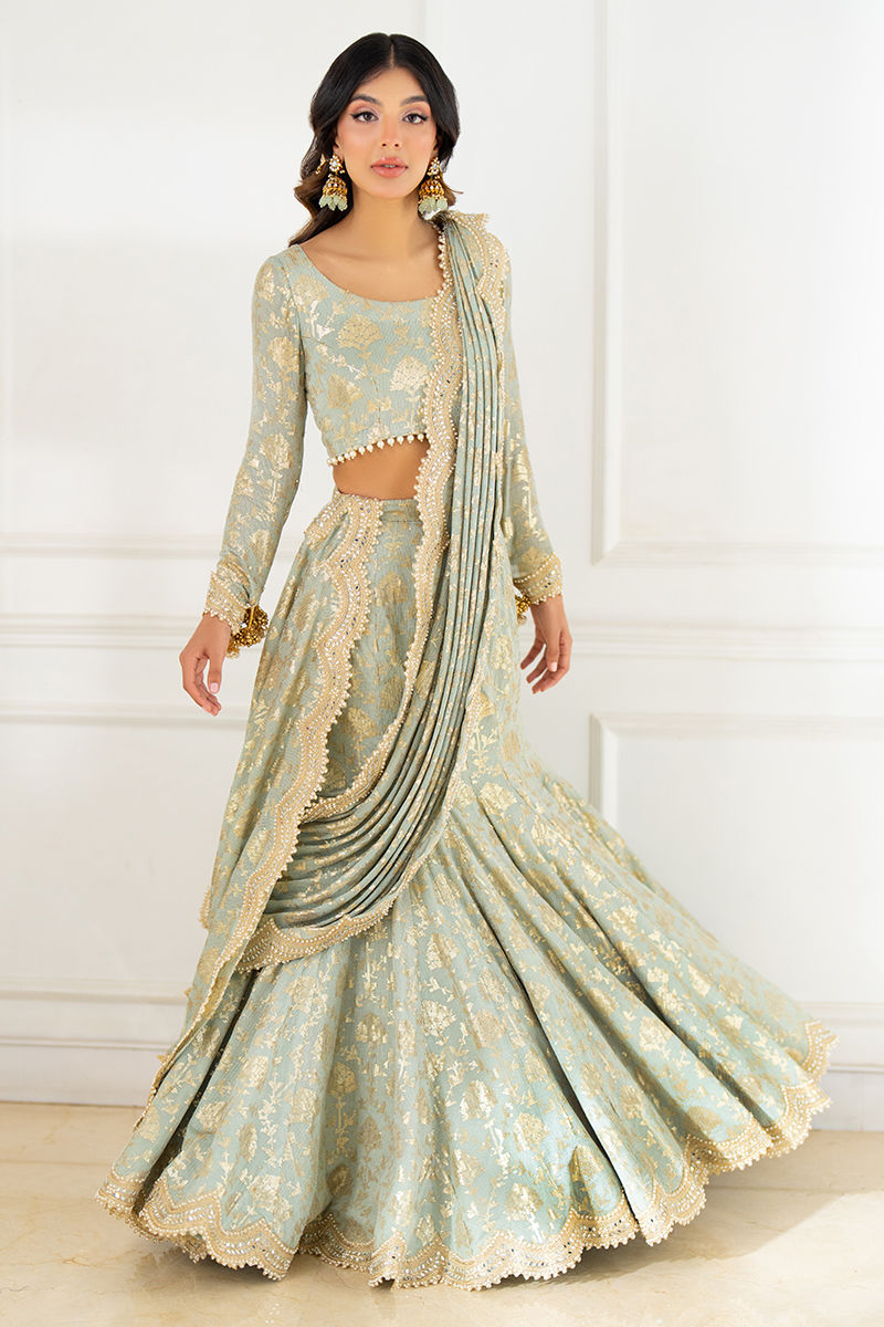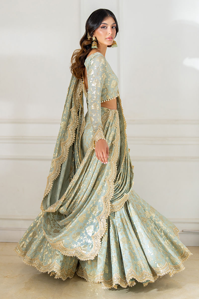 Exquisite elegance meets intricate craftsmanship in this green georgette chiffon lengha choli, adorned with scalloped pearl and zari lace, handmade tassels, and a stunning zardozi broach at the back.