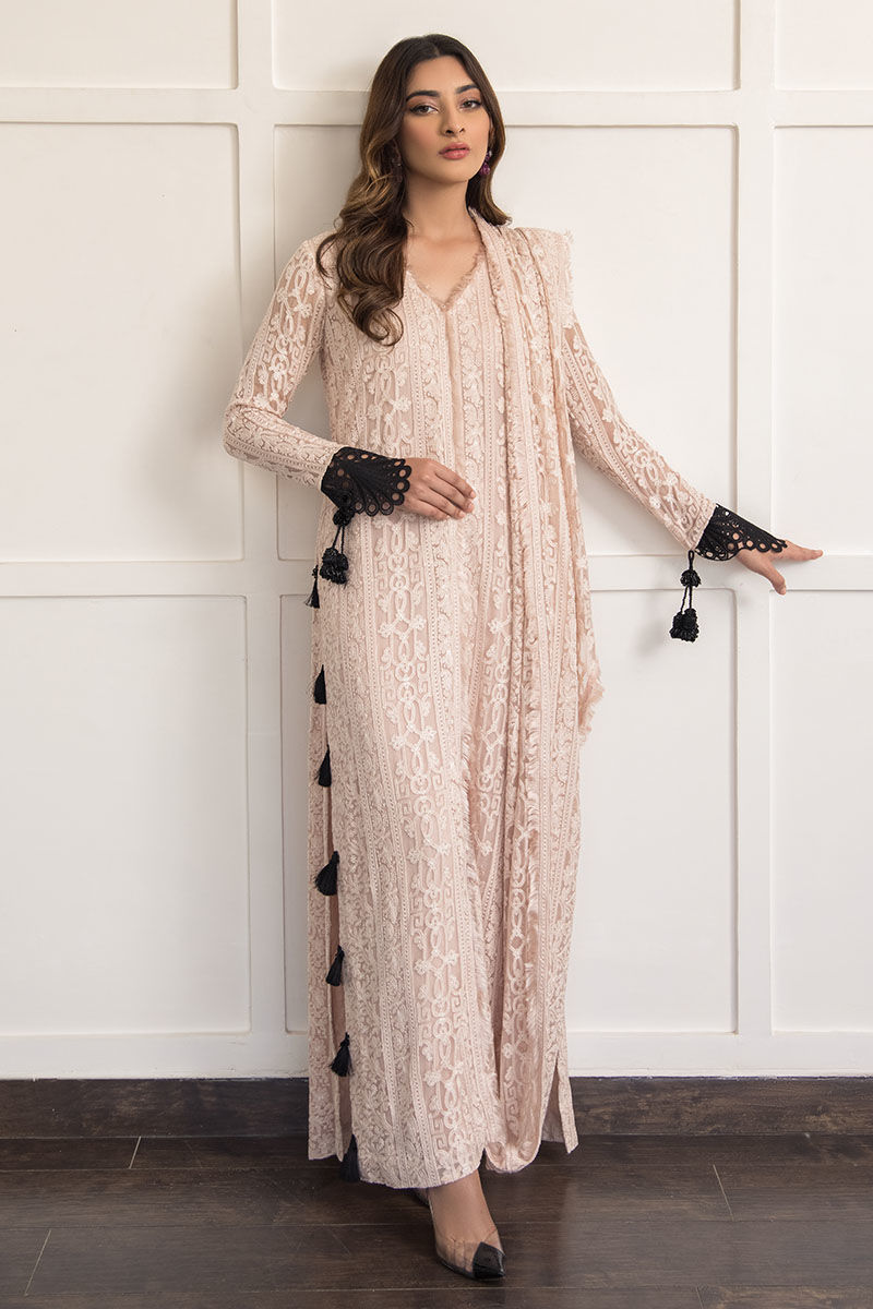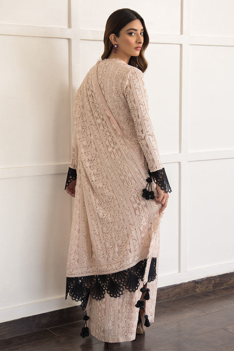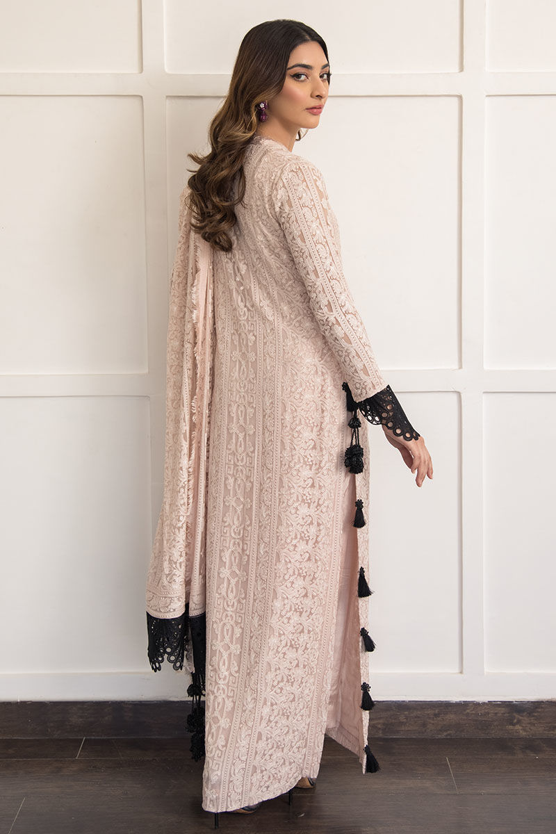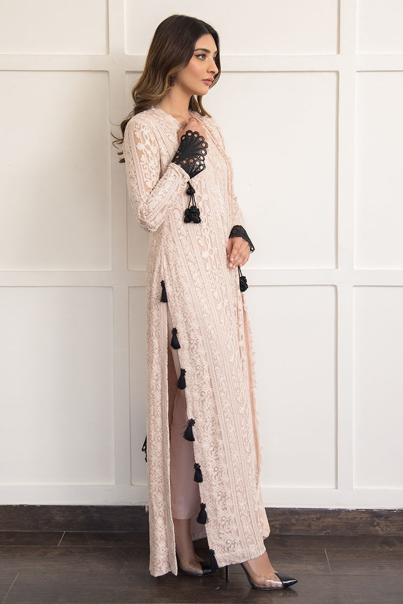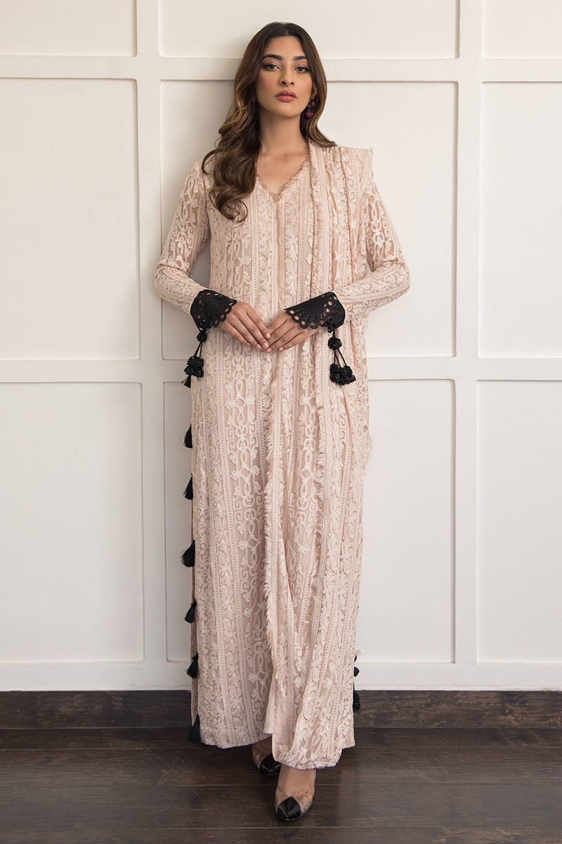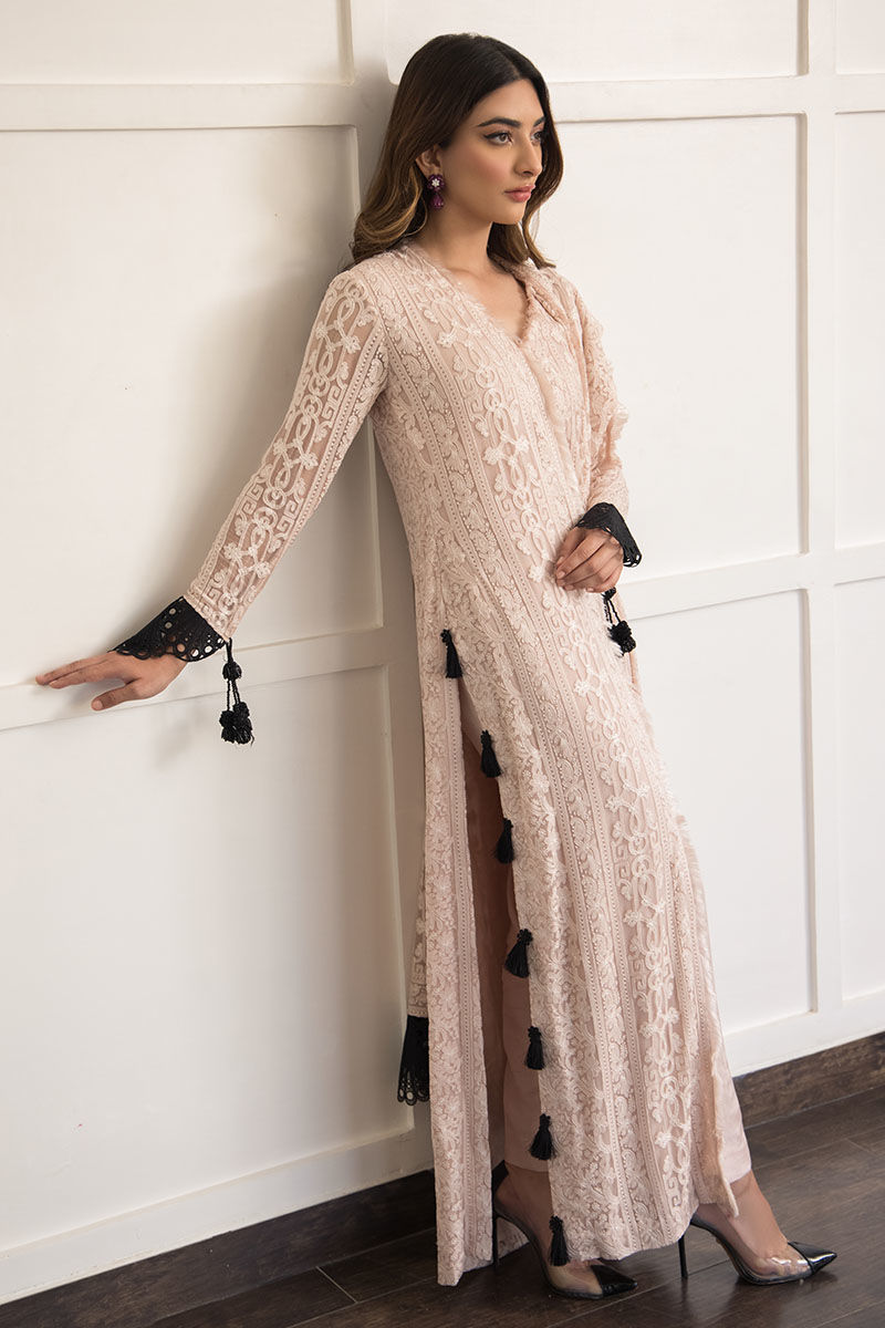 A summery pink made from georgette chikankari with contrasting black cutwork lace on sleeves and on the borders of the attached duppata with handmade tassels on the side slits and hand crafted beaded tassels on the sleeves. Frayed edges on the neckline and corners of the dupatta. Paired with cigarette cotton silk pants.