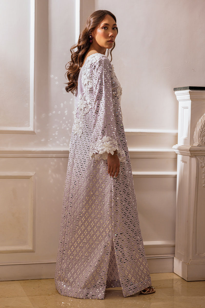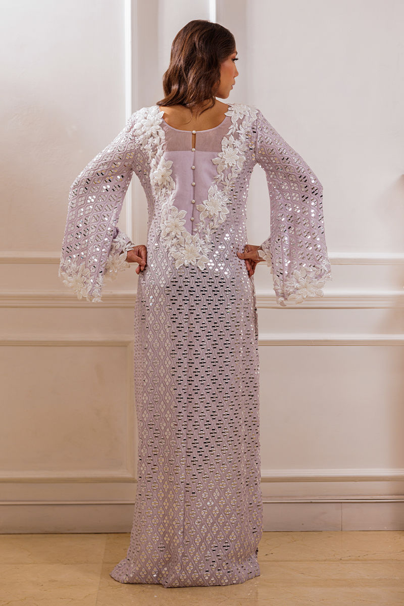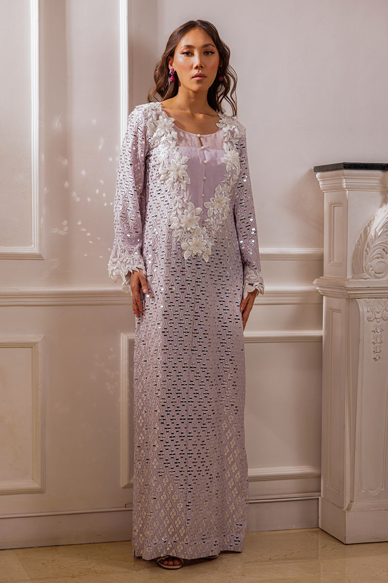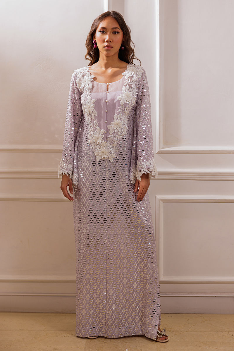 The Myza lavender silk kaftaan shirt features intricate embroidery and foil work, enhanced by cutwork 3D floral details on the neckline. Pearls embellish both the front and back neckline, as well as the sleeves, adding a touch of elegance. The shirt is designed with a side slit for added flair.