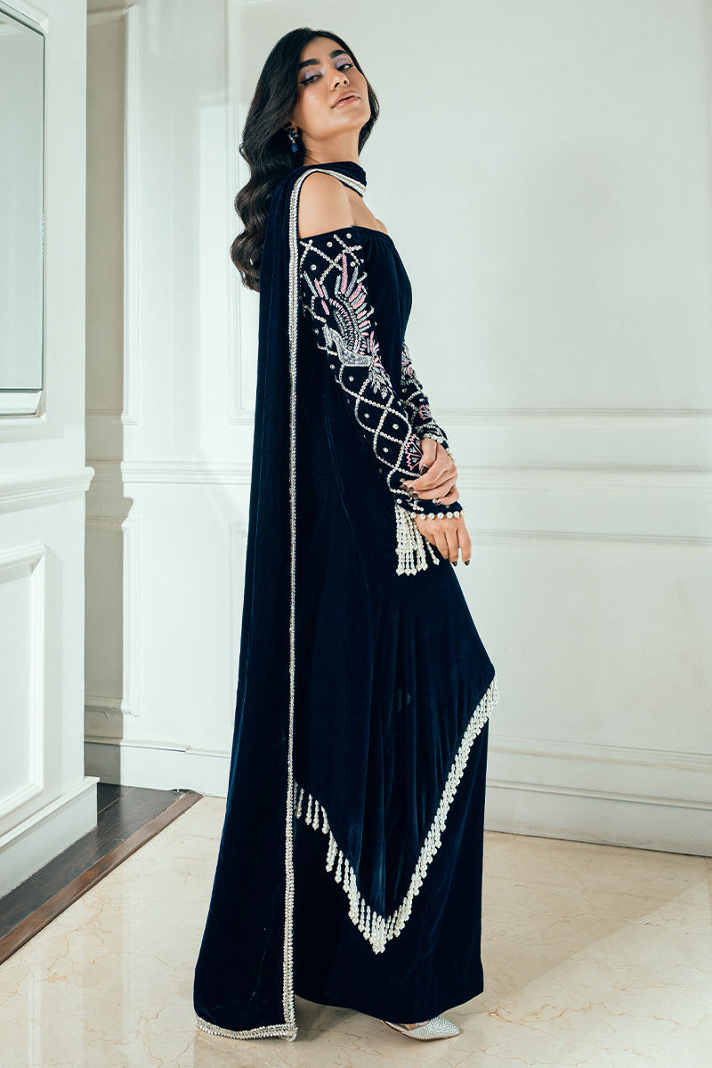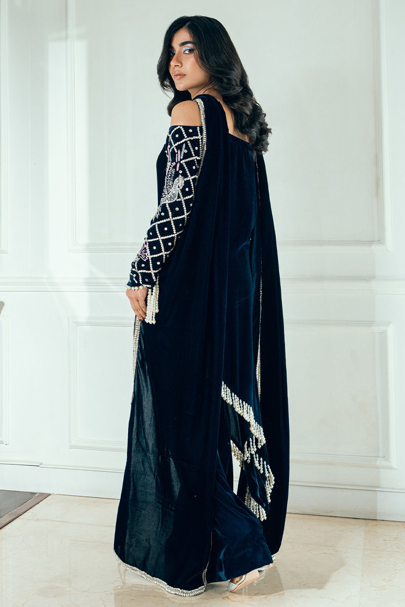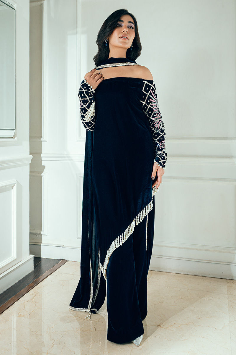 Natty blue velvet slanted-cut shirt features handmade pearl tassels on the hem and sleeves, along with diamante-worked sleeves highlighted with thread and zardozi embellishments.
