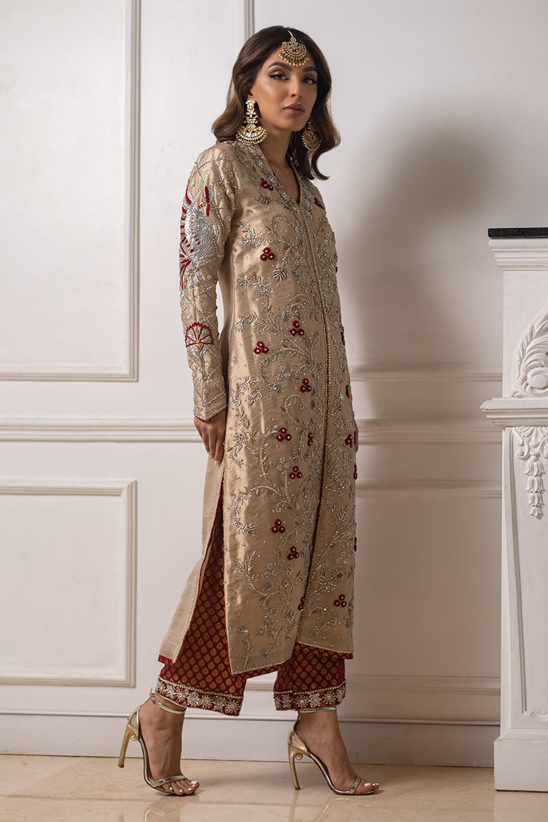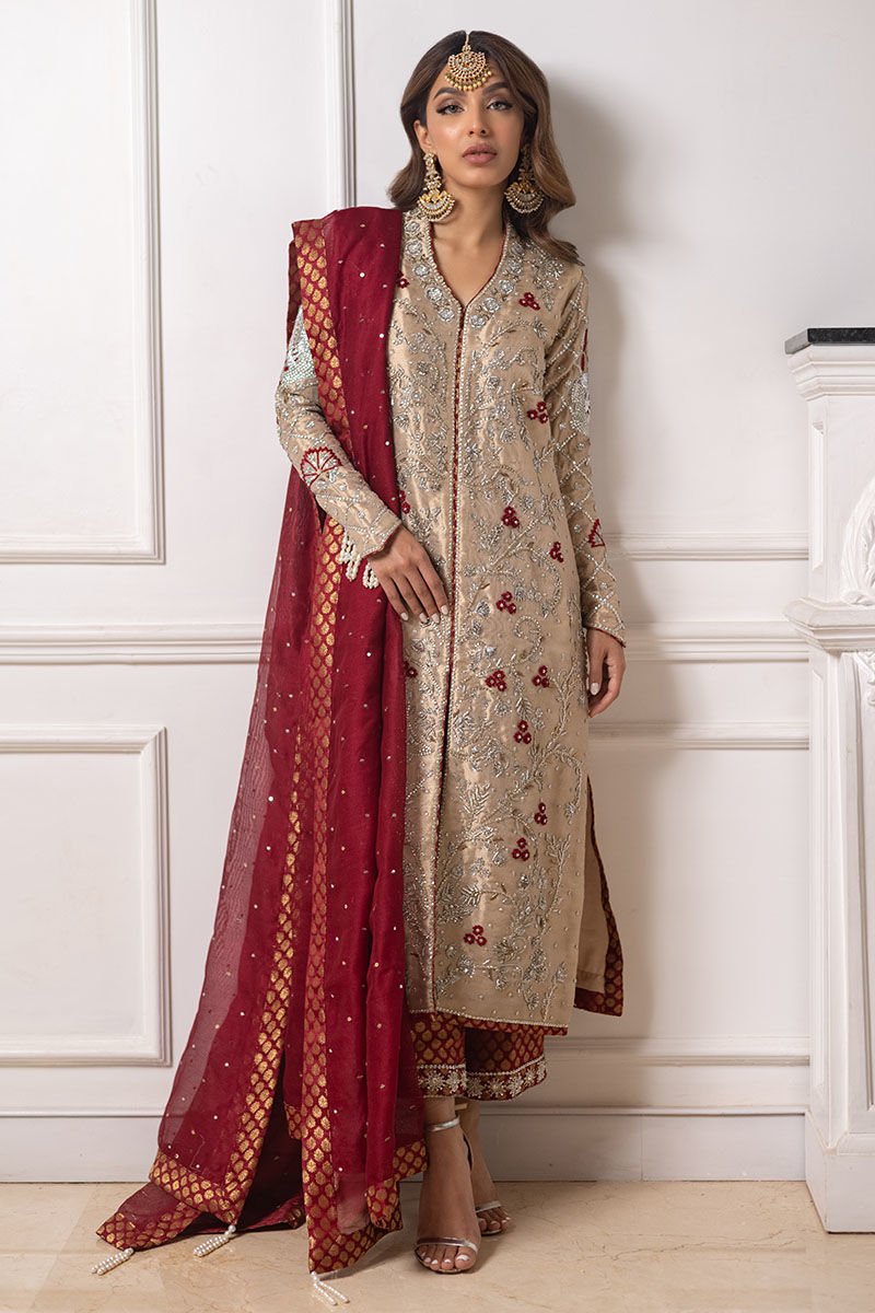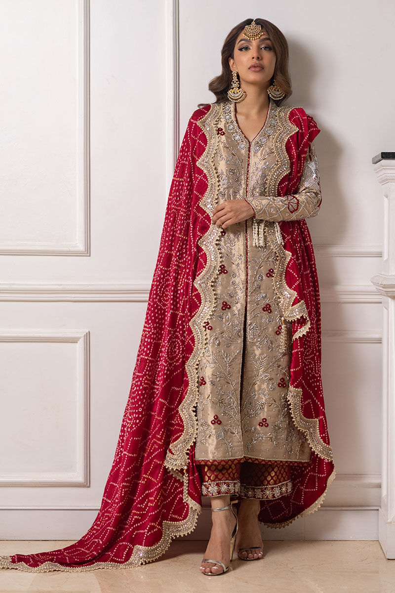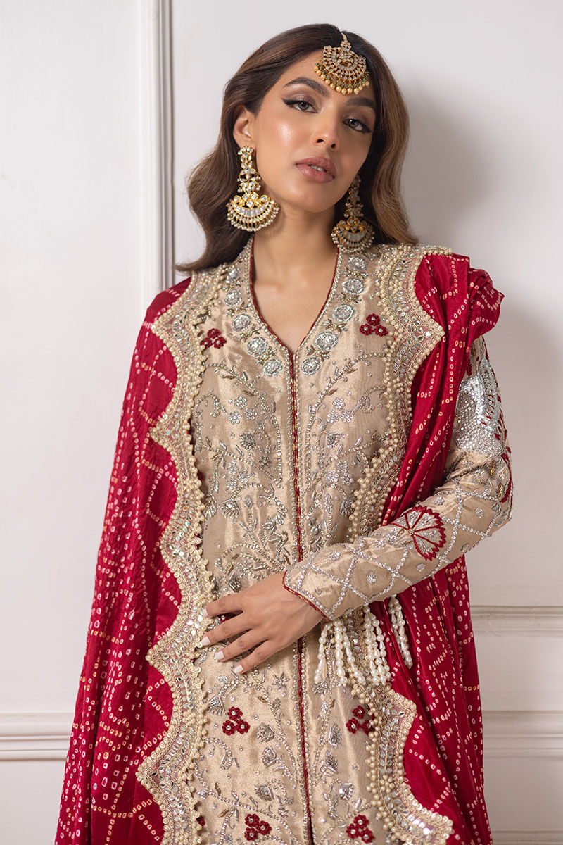 Elegance meets extravagance in a pure gold lama fabric front-open shirt adorned with meticulous zardozi, threadwork, and stones on the shirt and sleeves. Handmade pearl tassels add a touch of opulence to the sleeves, complemented by red jamawar finishing. The Izaar pants in red jamawar, with attached cotton silk lining, feature hand zardozi and stone work at the bottom. Completing the ensemble is a pure cotton silk net dupatta with sequin chin and jamawar finishing, elegantly draped and adorned with handmade pearl tassels on all sides. A captivating blend of luxury and sophistication. You can also add a chunri dupatta with scalloped borders embellished with pearl ,gold work and tassels on all 4 sides